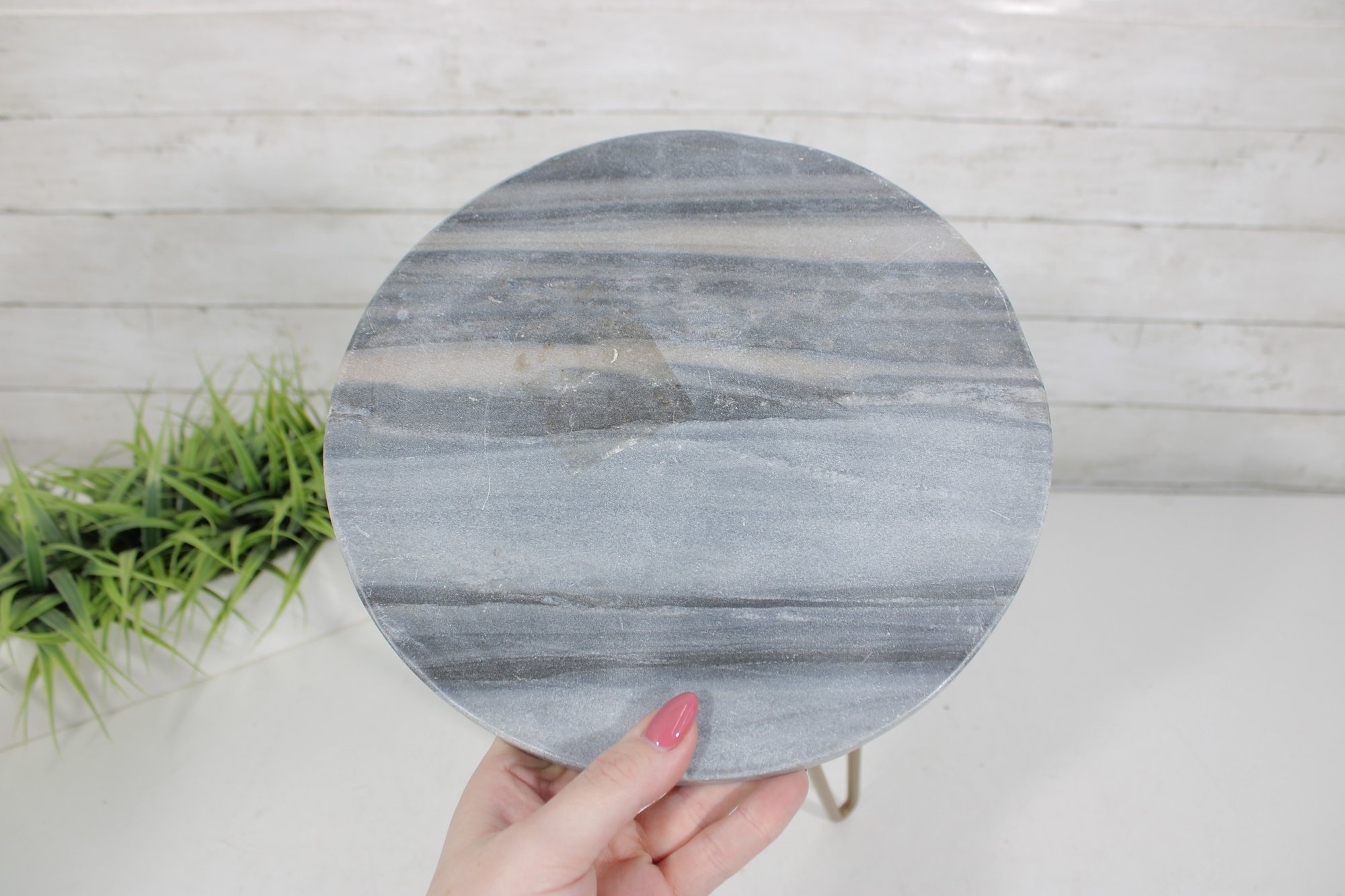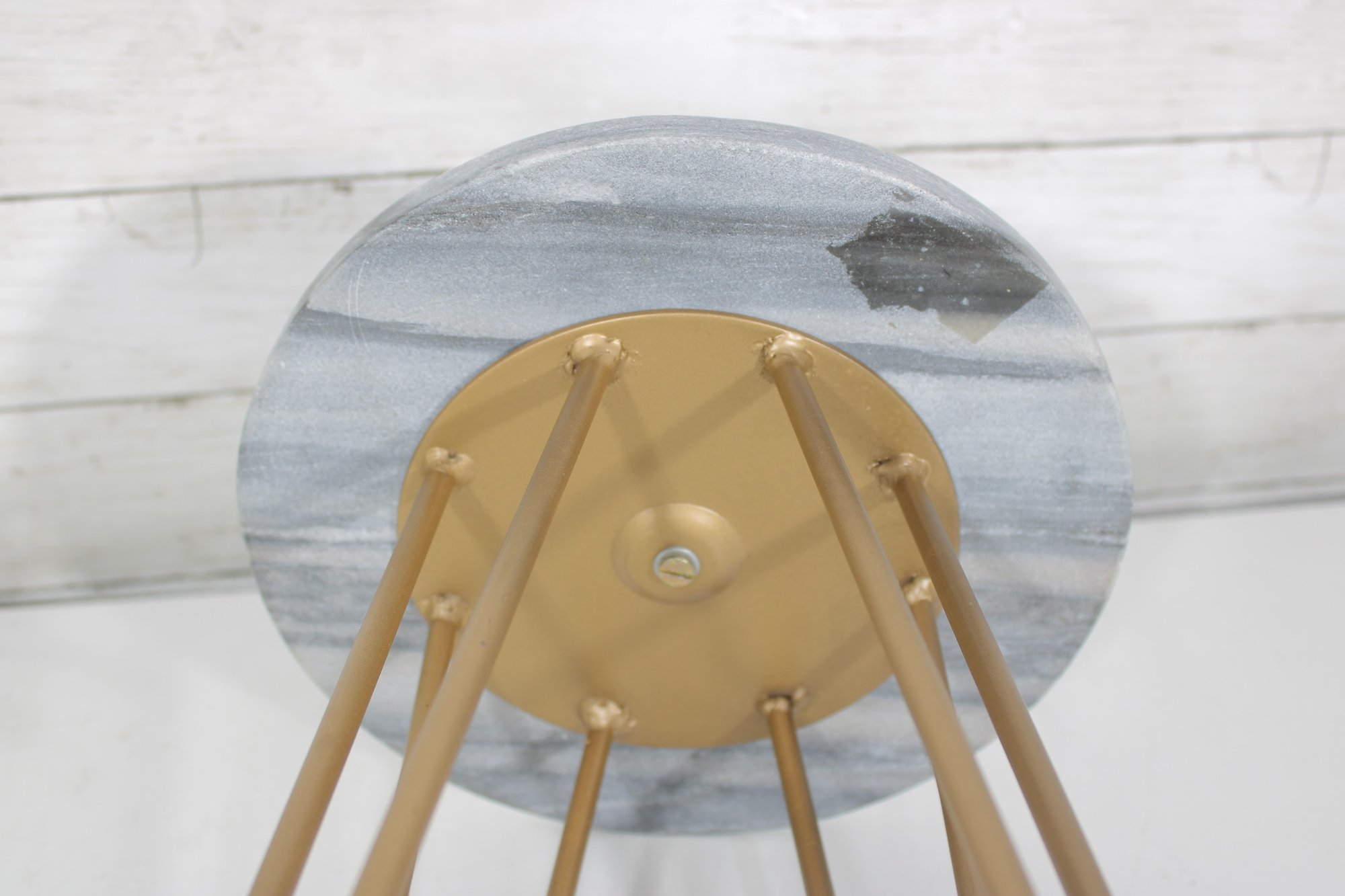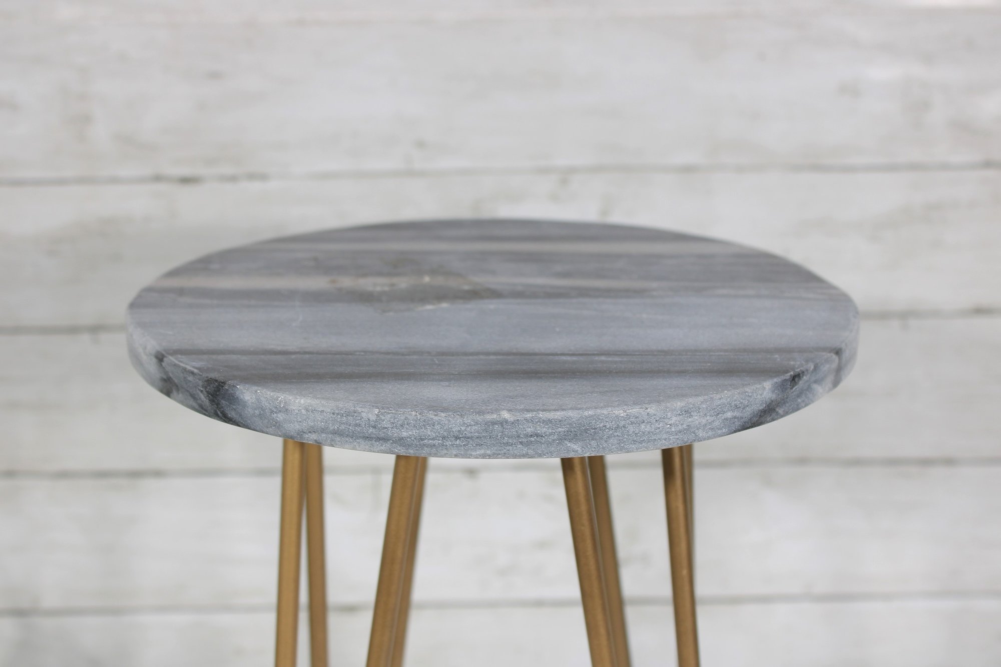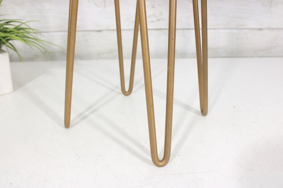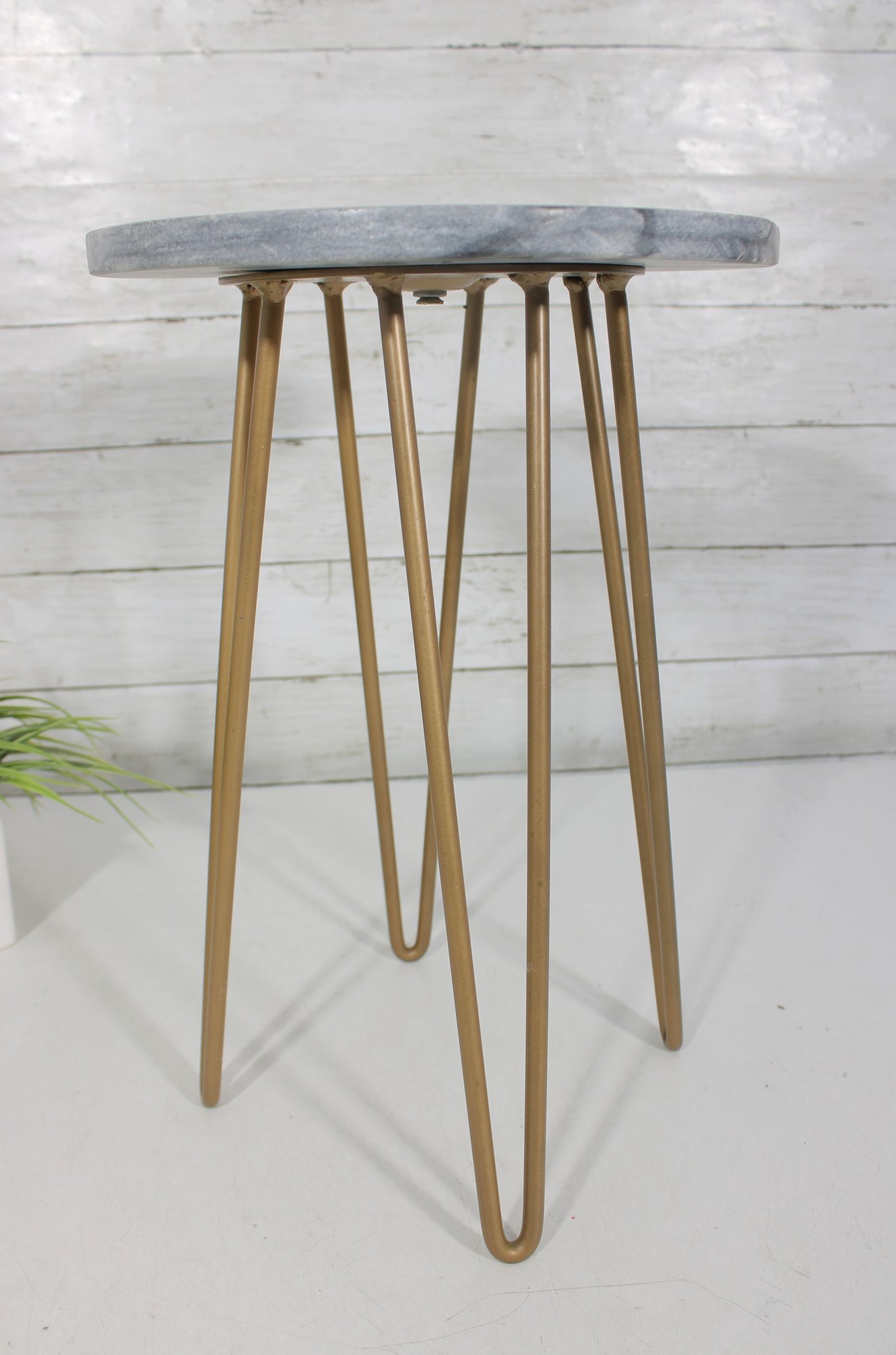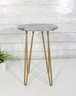 Stylish and modern round accent side table featuring a gray faux marble-look top paired with sleek gold-tone hairpin legs. Its compact size makes it a great fit as an end table, plant stand, bedside table, or decorative accent in small spaces.
