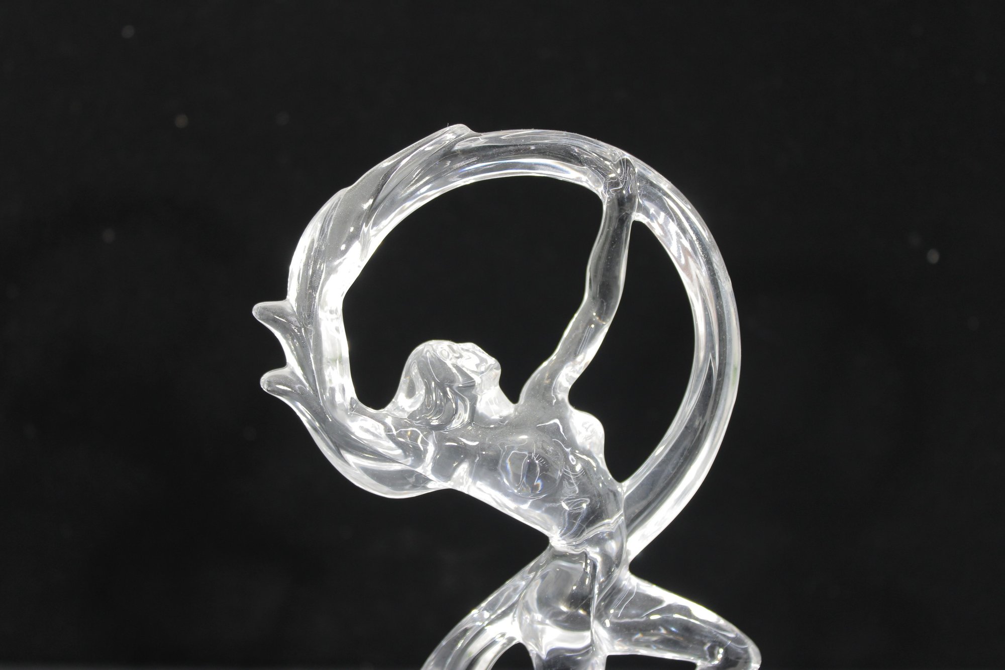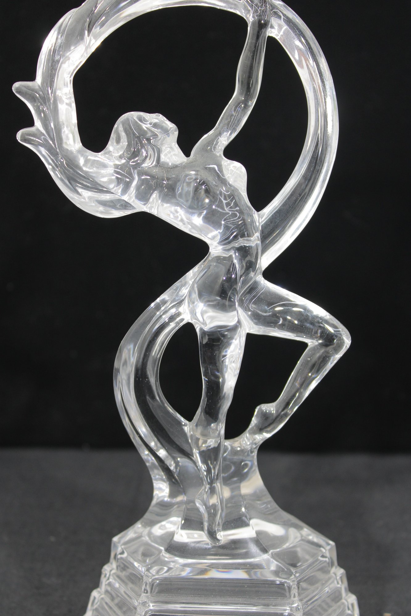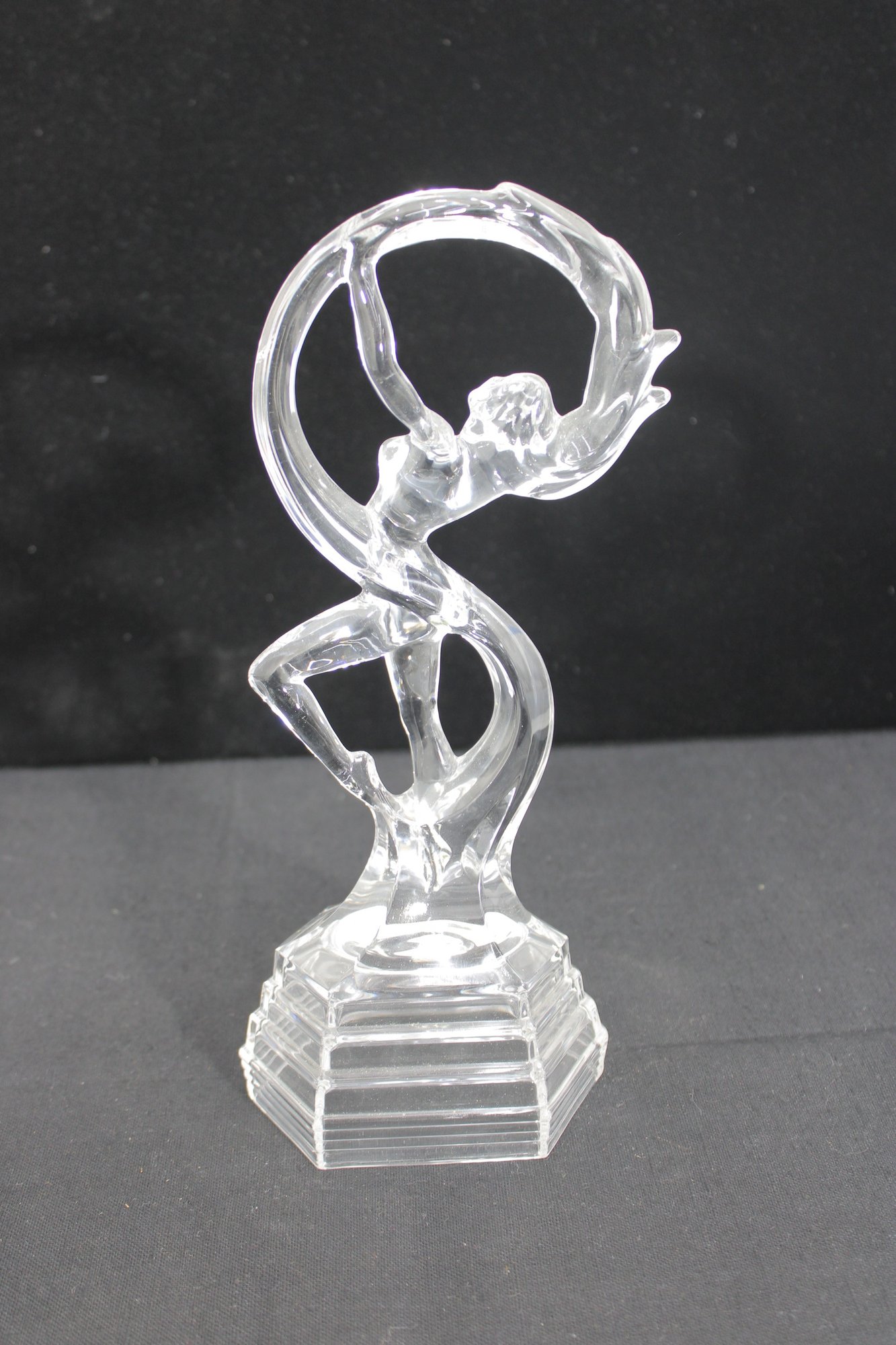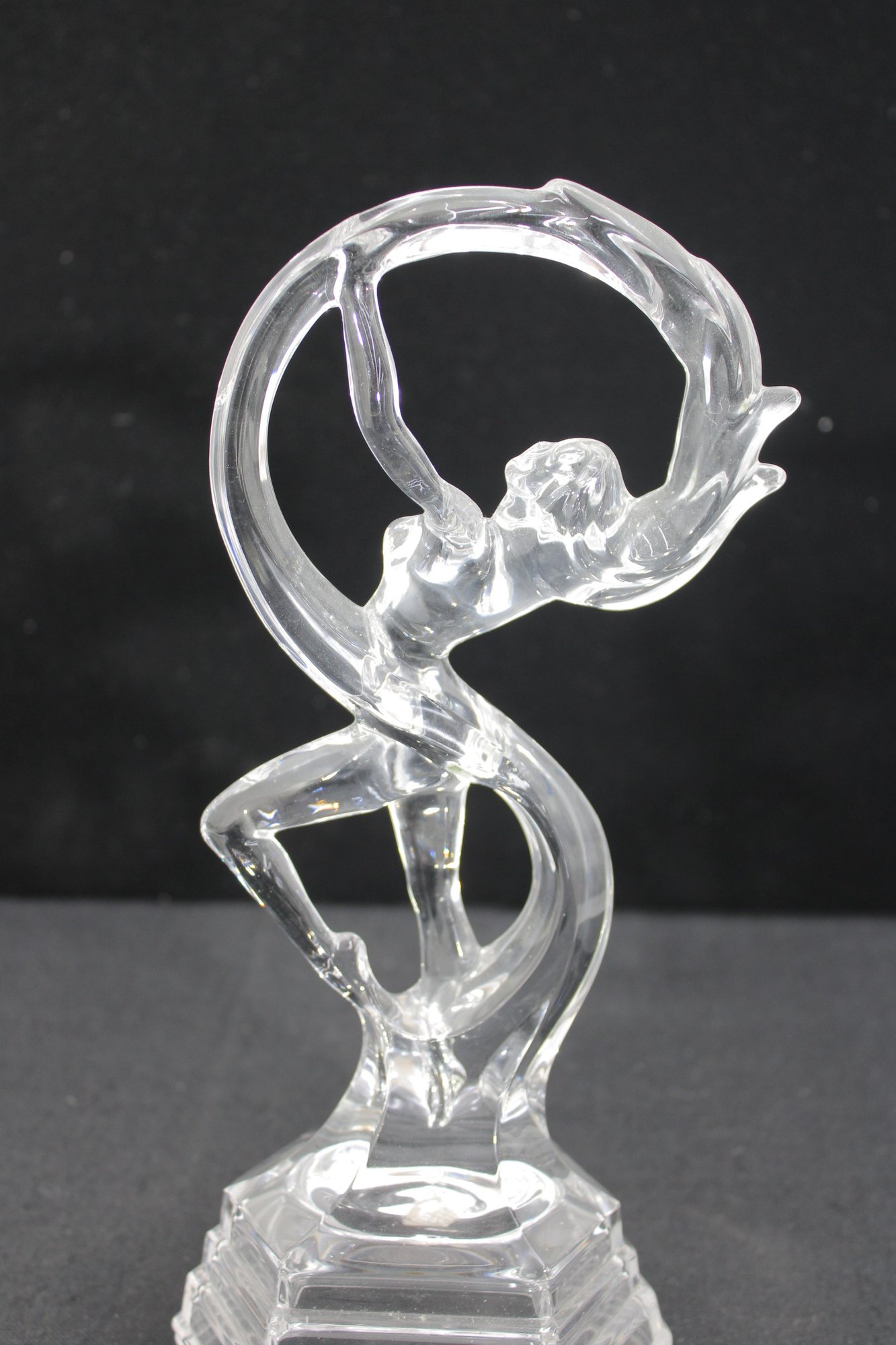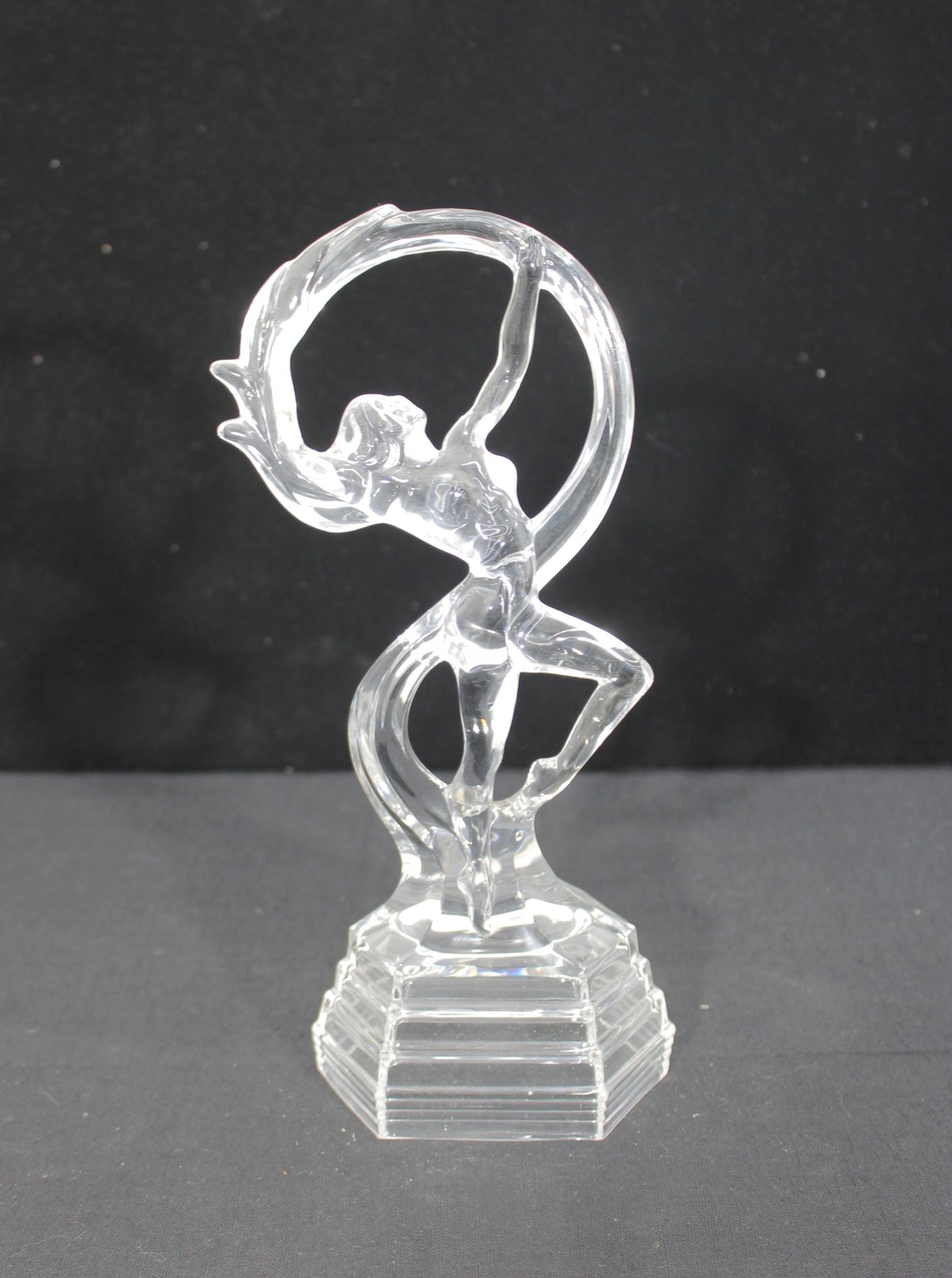 RCR crystal sculpture featuring a graceful Art Deco style dancer posed within a sweeping circular form. Crafted in Italy, this stunning clear crystal figure captures movement and fluidity with beautifully molded details and a faceted stepped base that enhances light reflection.