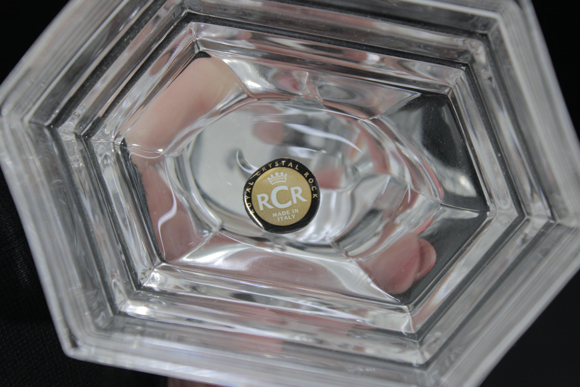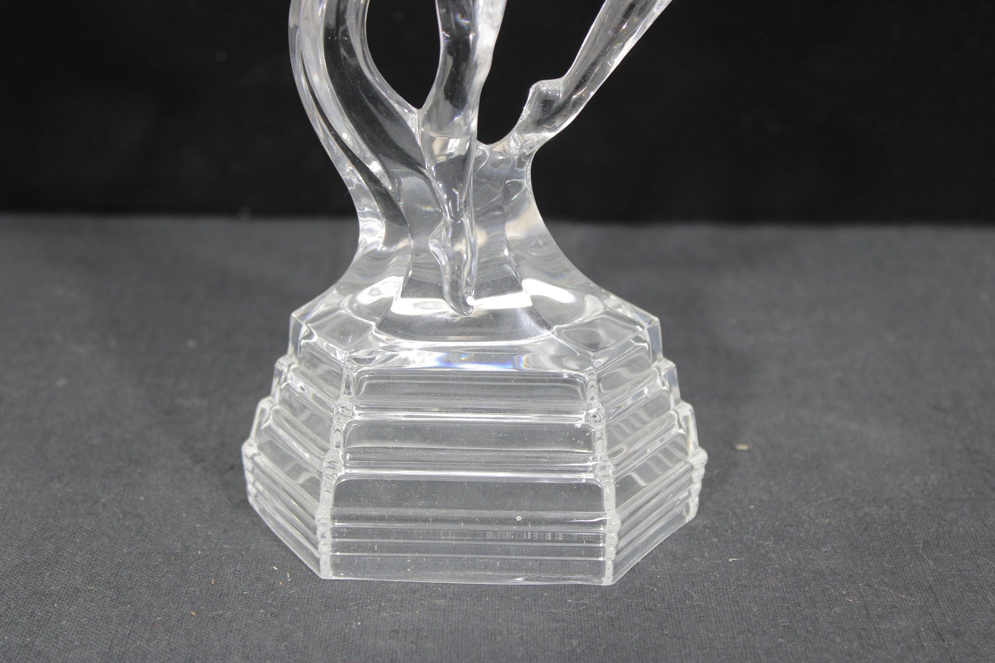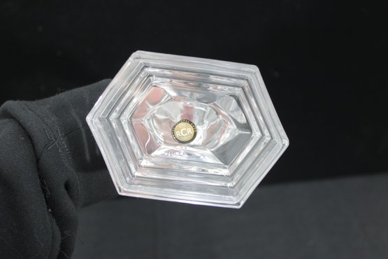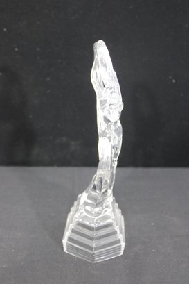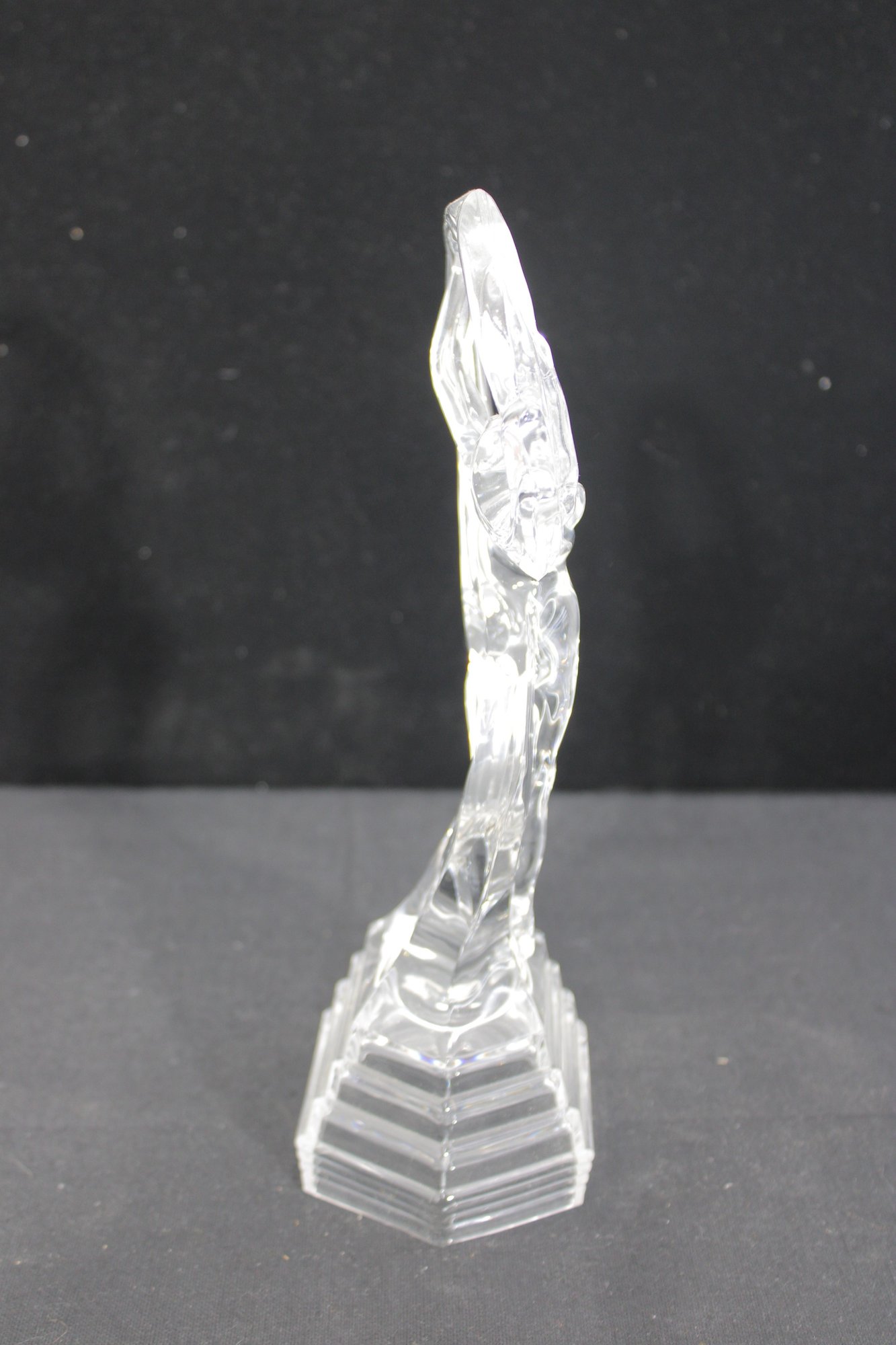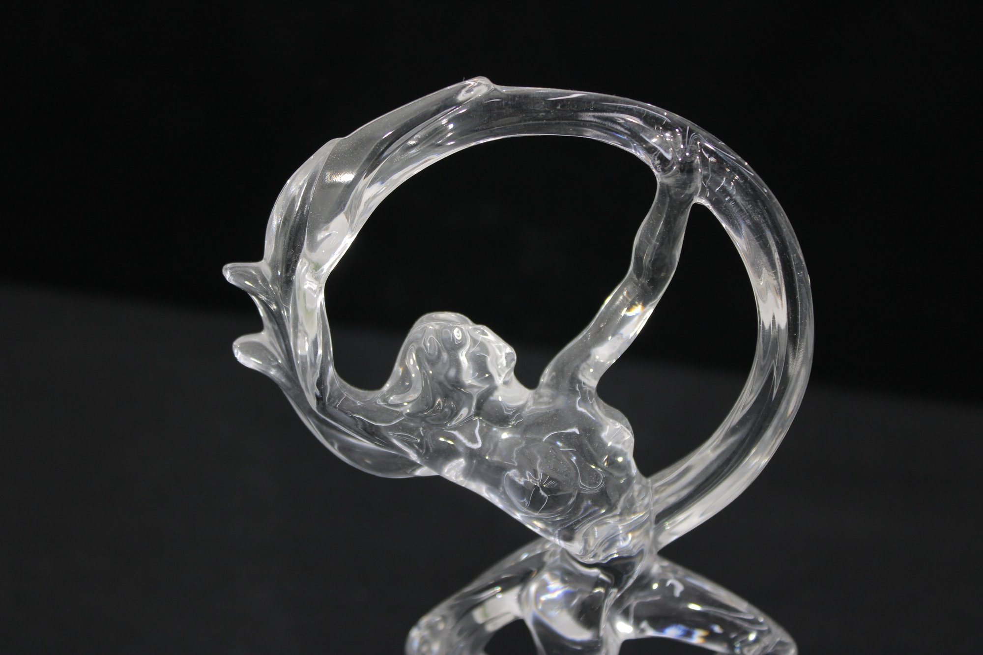 RCR crystal sculpture featuring a graceful Art Deco style dancer posed within a sweeping circular form. Crafted in Italy, this stunning clear crystal figure captures movement and fluidity with beautifully molded details and a faceted stepped base that enhances light reflection.