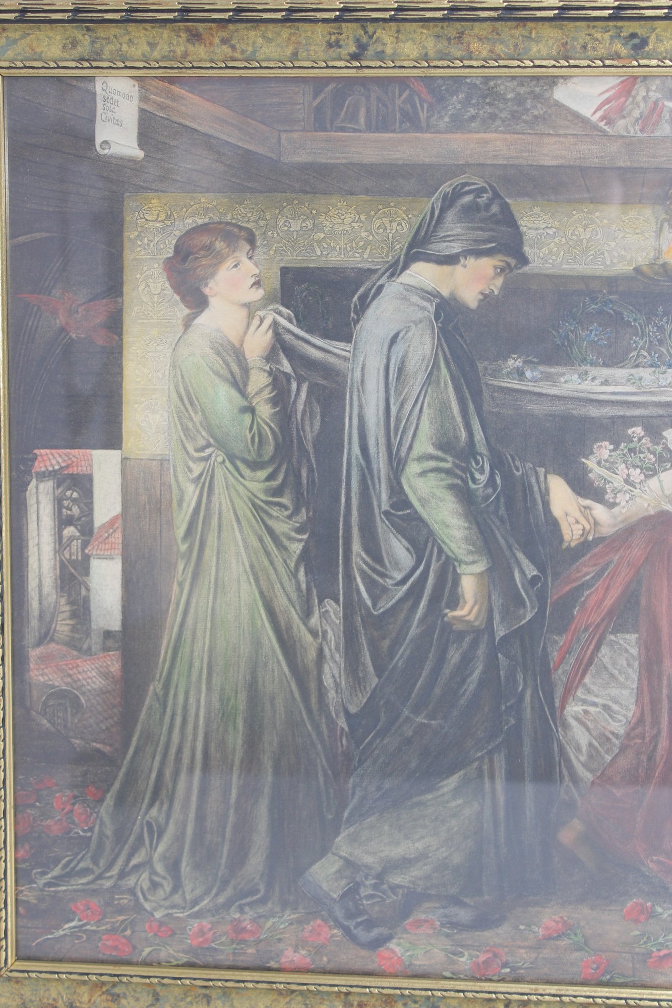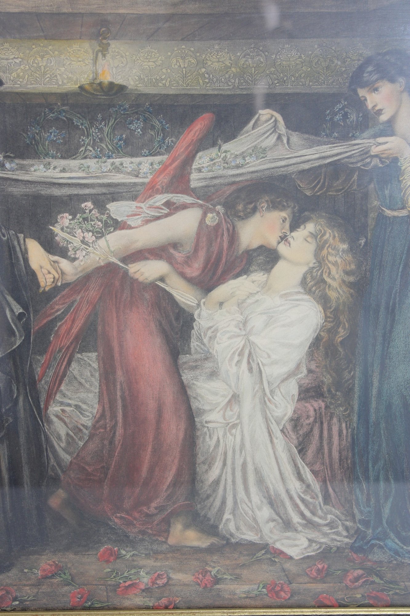The artwork features deep, subdued tones with touches of red and green, characteristic of 19th-century Pre-Raphaelite influence. The scene conveys a sense of narrative and emotion, making it a striking decorative piece.