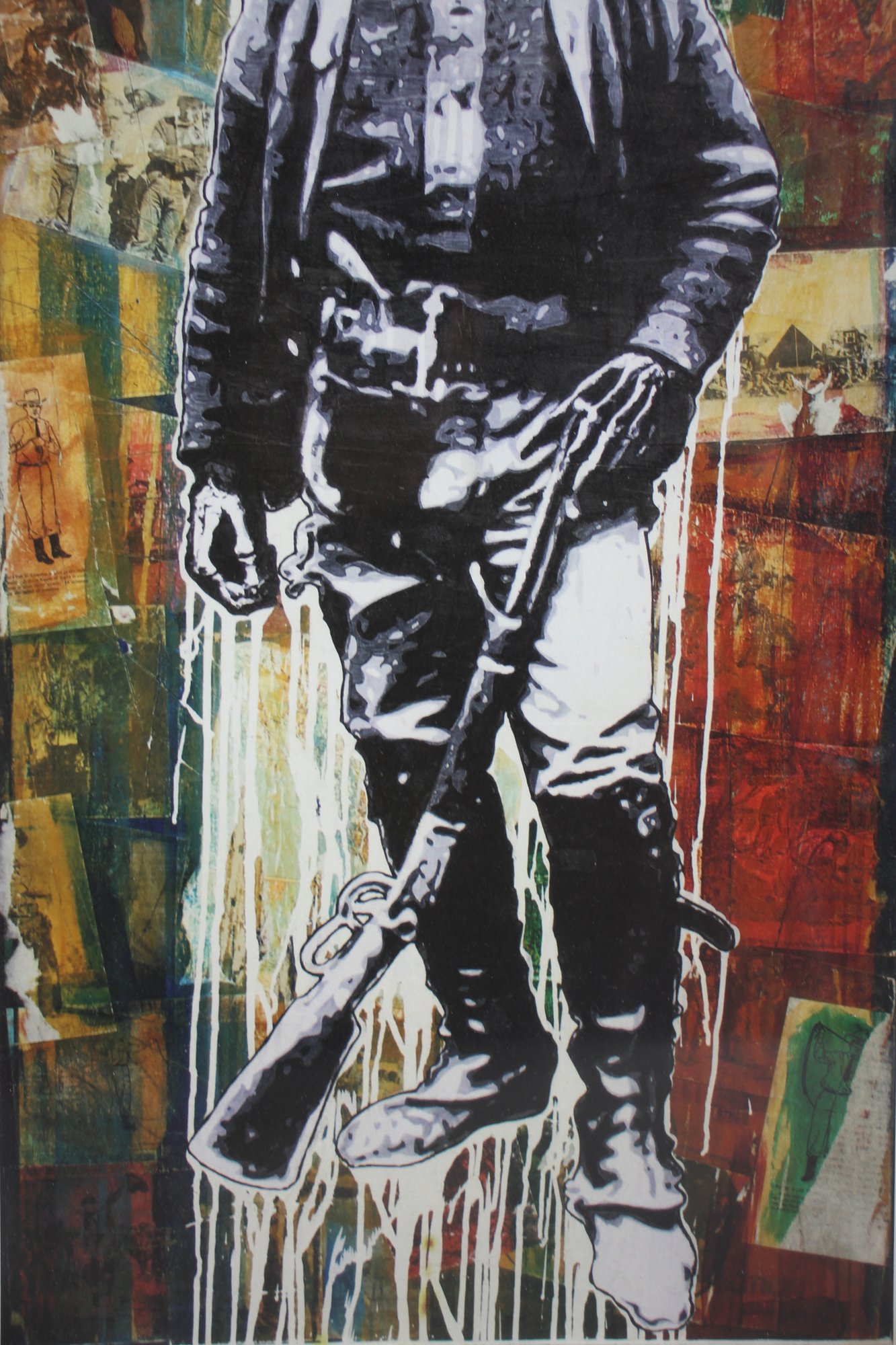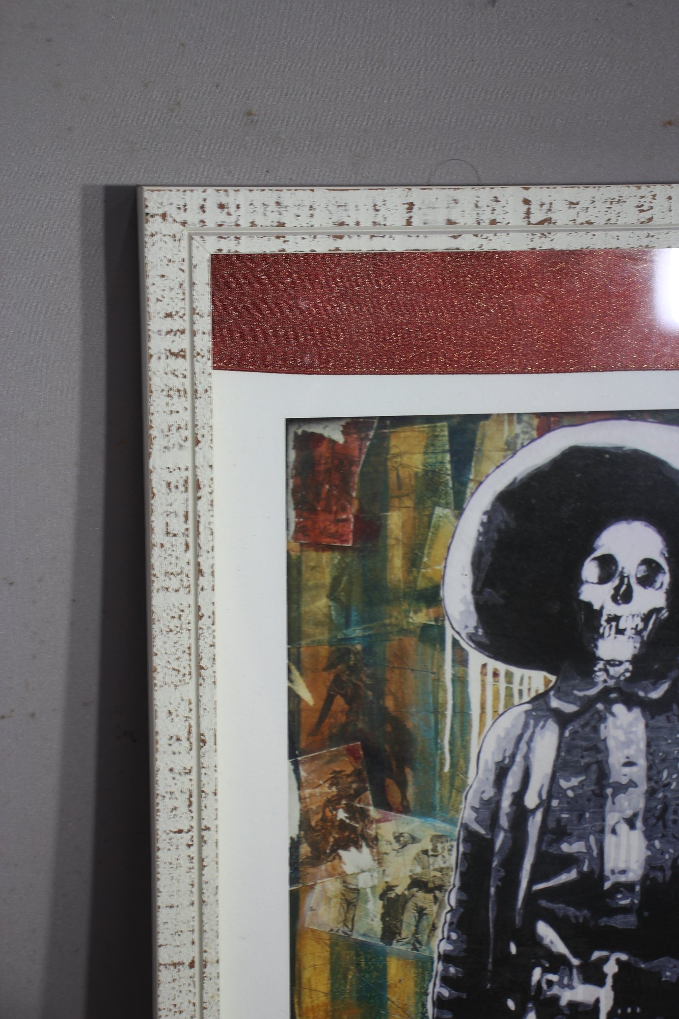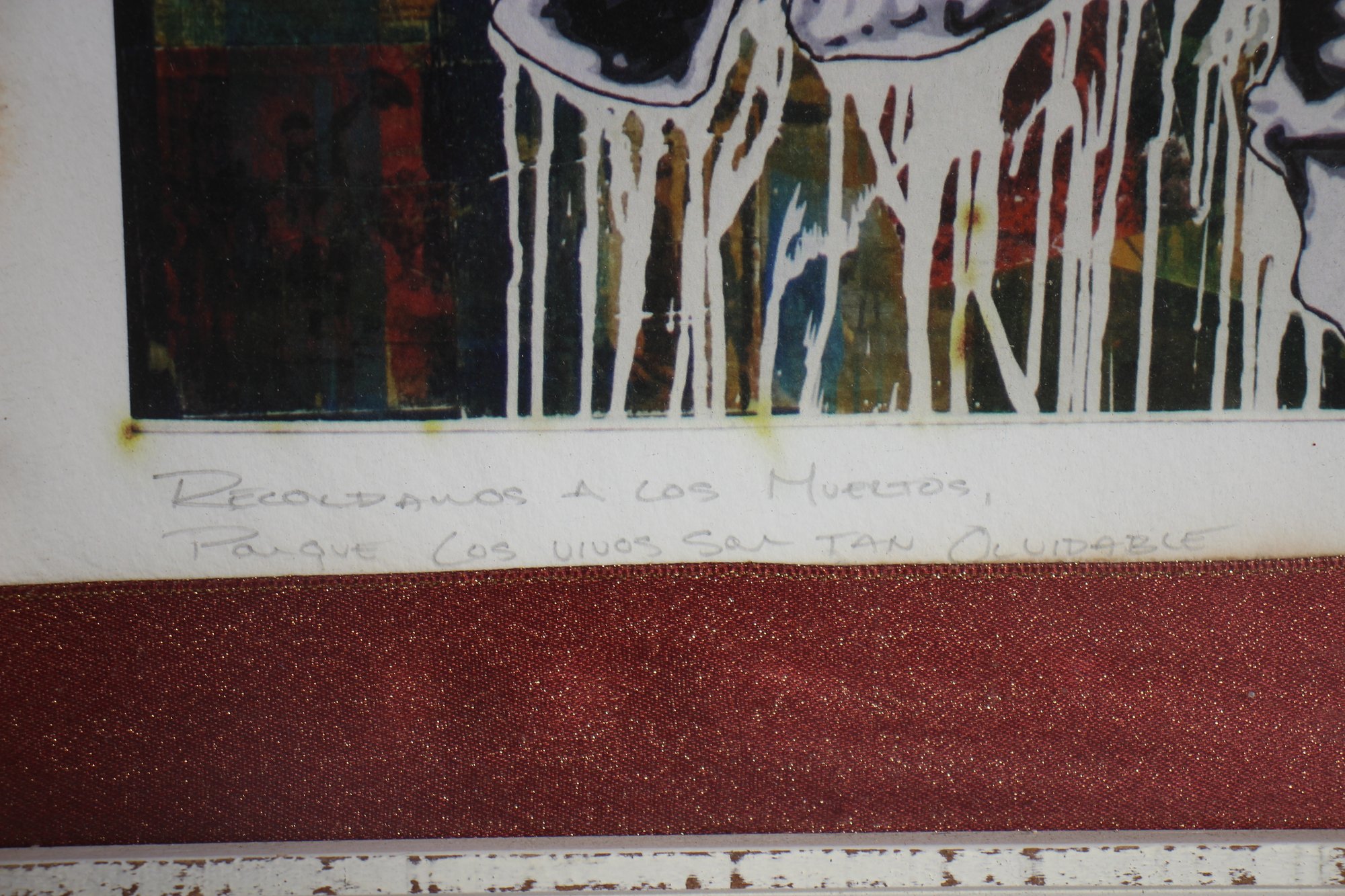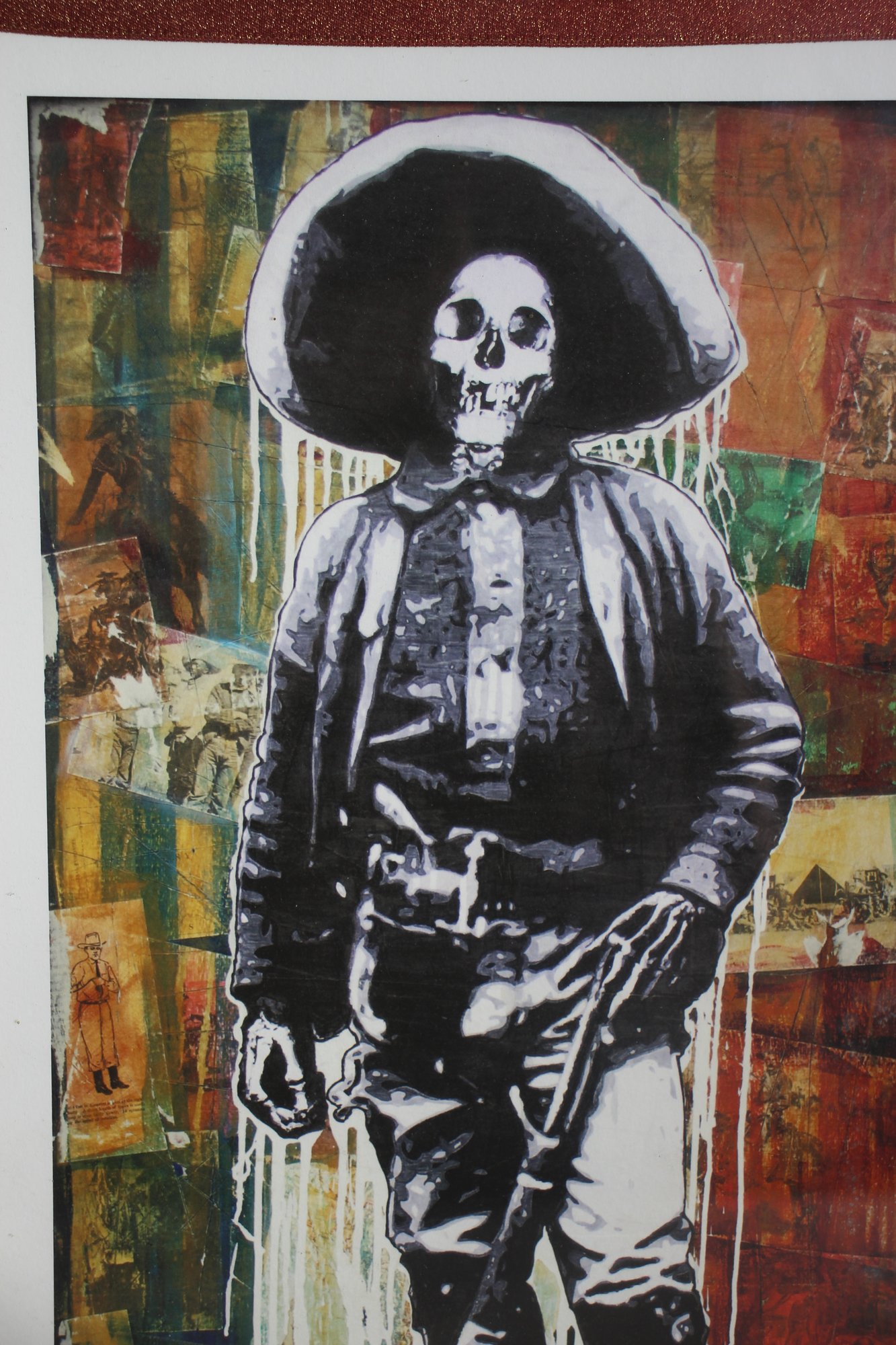 This evocative mixed-media artwork, titled Recordamos a Los Muertos (translated as "We Remember the Dead"), blends bold street-art aesthetics with historical symbolism. The piece depicts a skeletal figure dressed as a Mexican revolutionary, set against a richly textured abstract background. The dripping paint effect and monochromatic subject create a haunting yet powerful composition. Signed by the artist, the artwork is framed in a distressed white wooden frame, complementing its rustic and vintage appeal. A striking and thought-provoking addition for collectors of Día de los Muertos, folk, or contemporary political art.