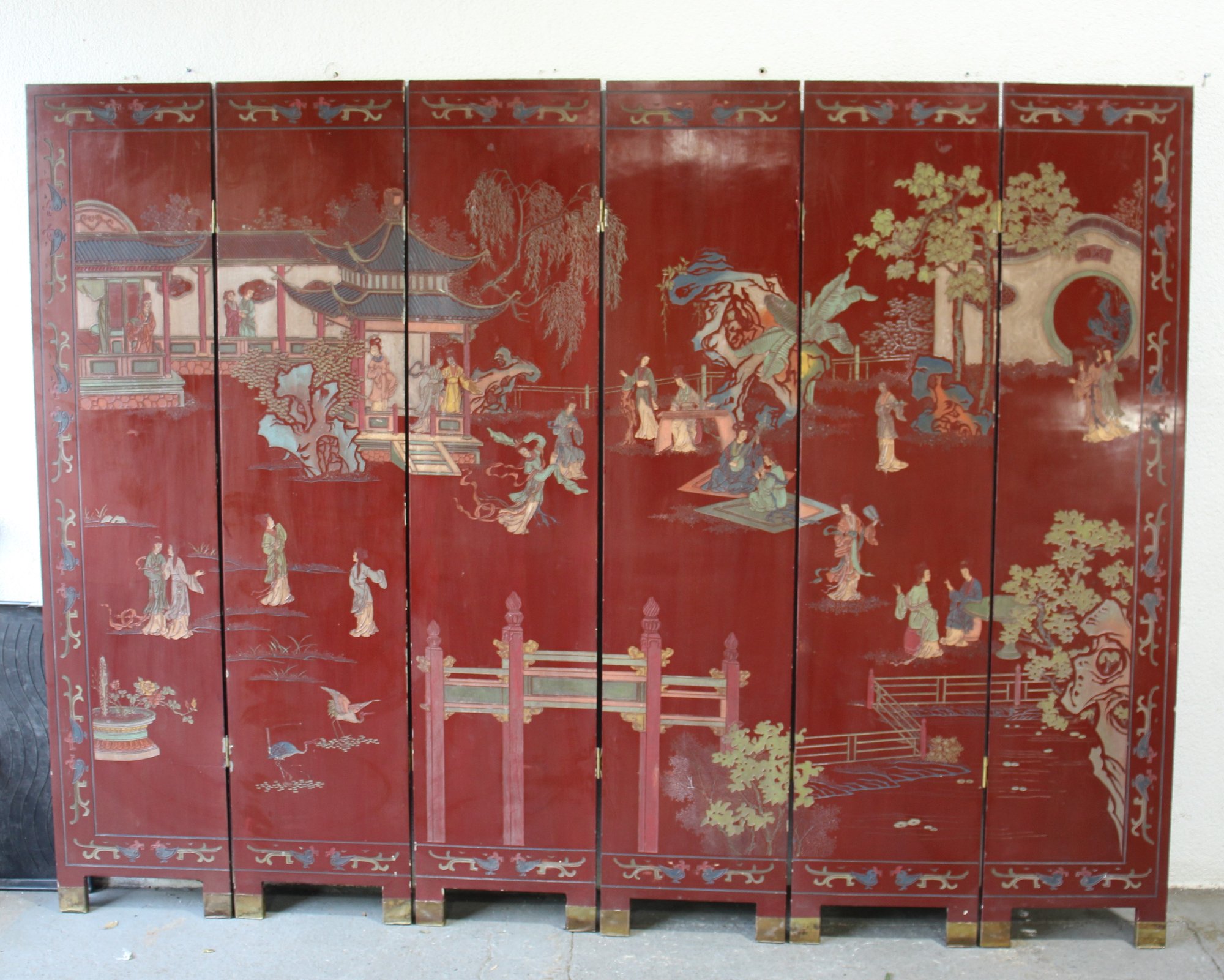 Immerse yourself in the vibrant history and culture of China with this exquisite red lacquered Coromandel screen. This four-panel screen is adorned with detailed historical and mythical scenes, featuring figures in traditional attire engaging in various activities within serene landscapes and architectural settings.