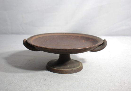 The dual handles, symmetrical and practical, are a nod to the amphorae of old, enabling easy handling and adding a sculptural quality to the piece. The tazza's broad, shallow bowl sits on a sturdy, centralized foot, giving it a prominent stance when displayed on any surface.