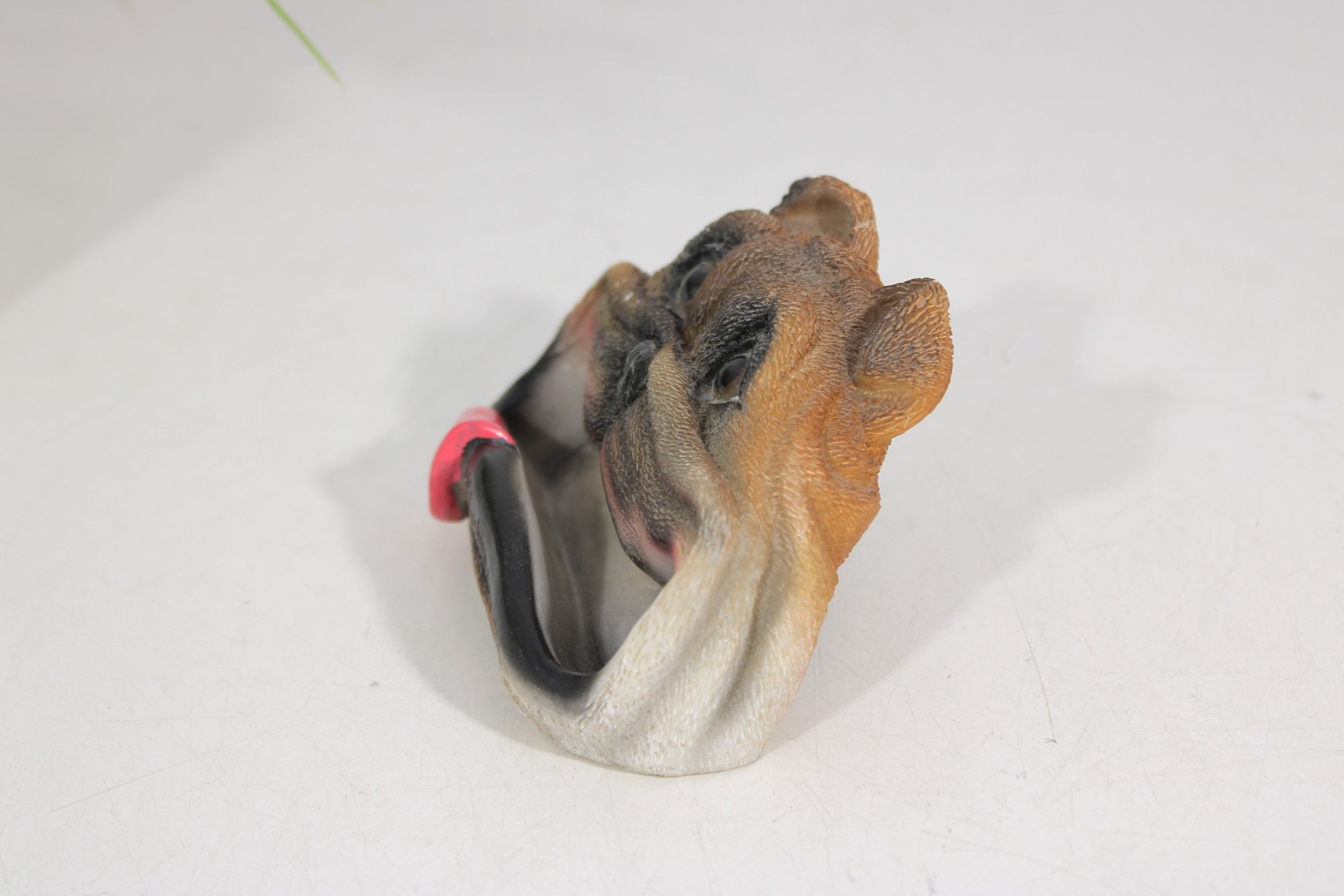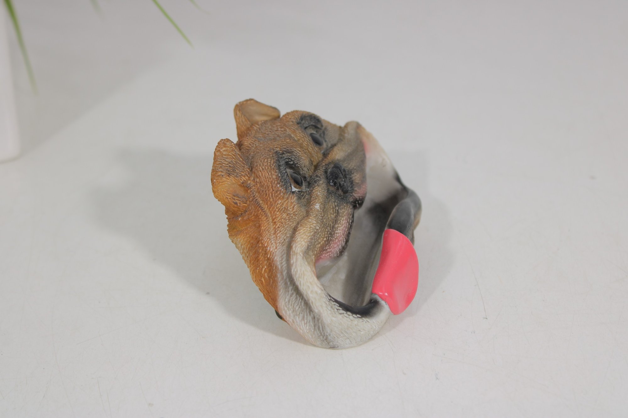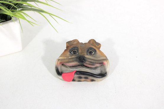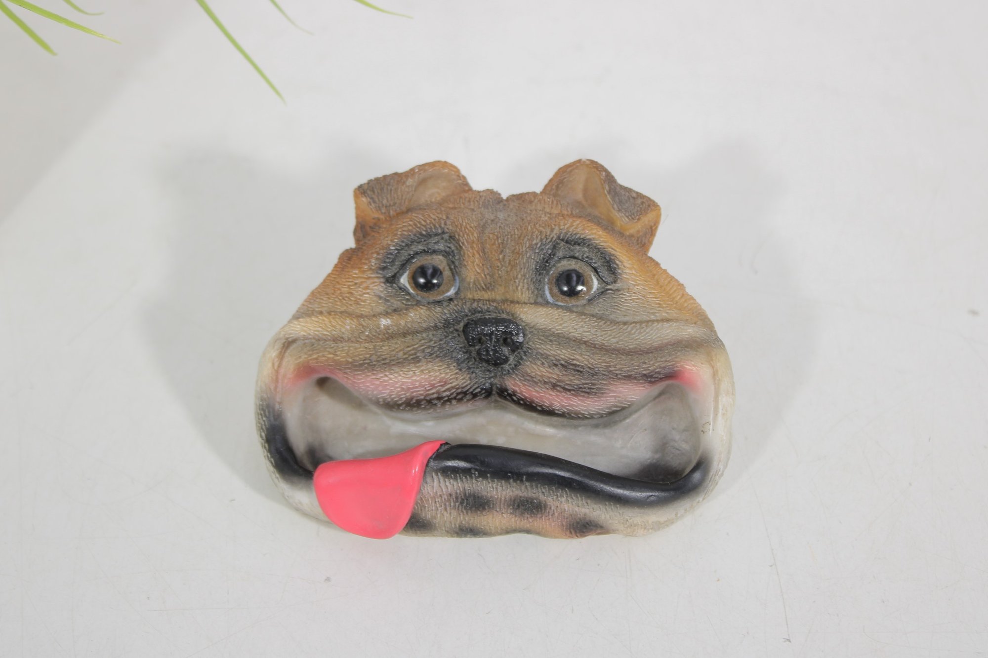 The sculpture features a detailed bulldog face with expressive eyes, wrinkled features, and a playful tongue sticking out, giving it a humorous and characterful look. The open mouth area forms a small tray that can function as an ashtray or holder for business cards, coins, or small desk items.