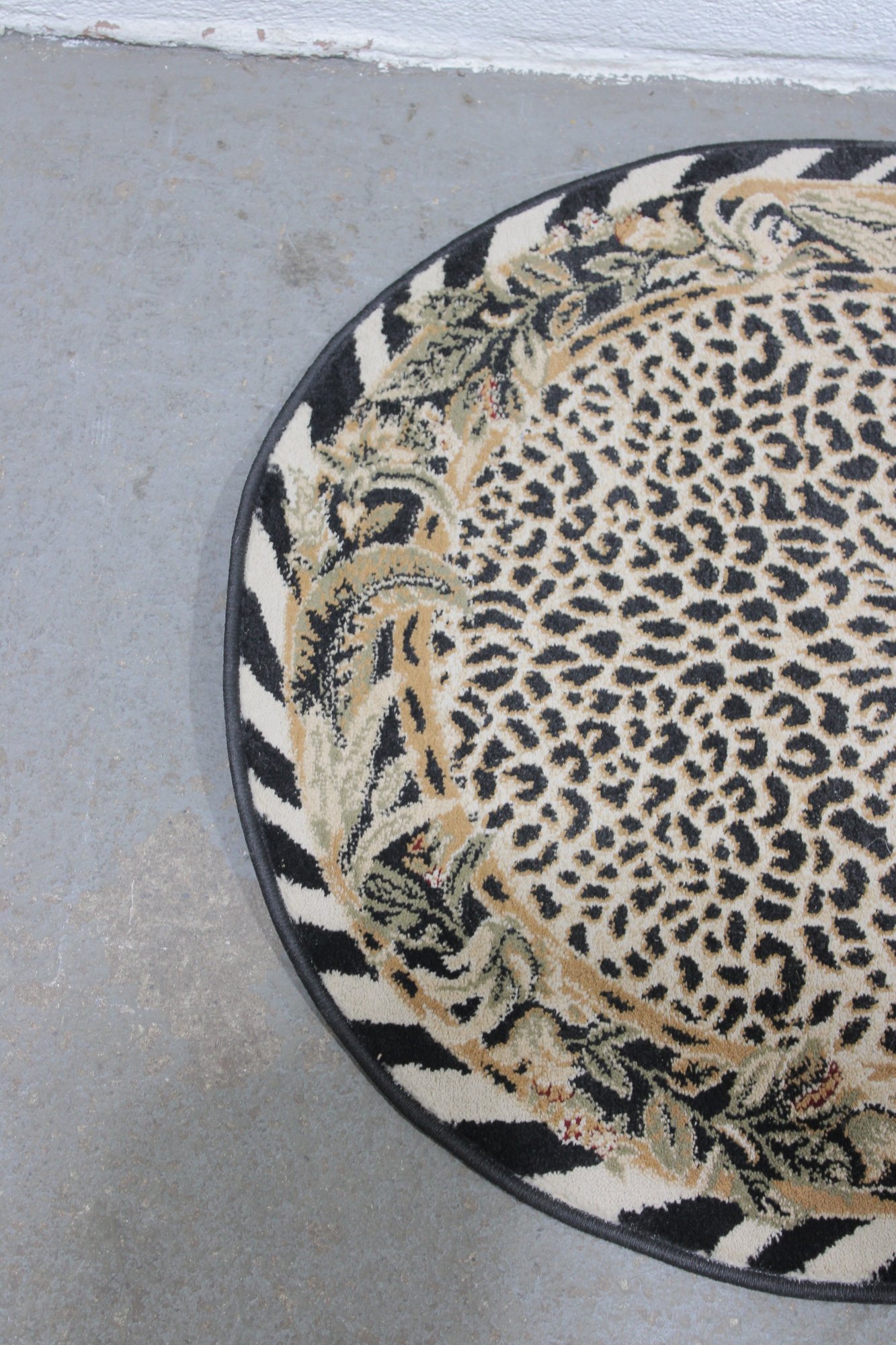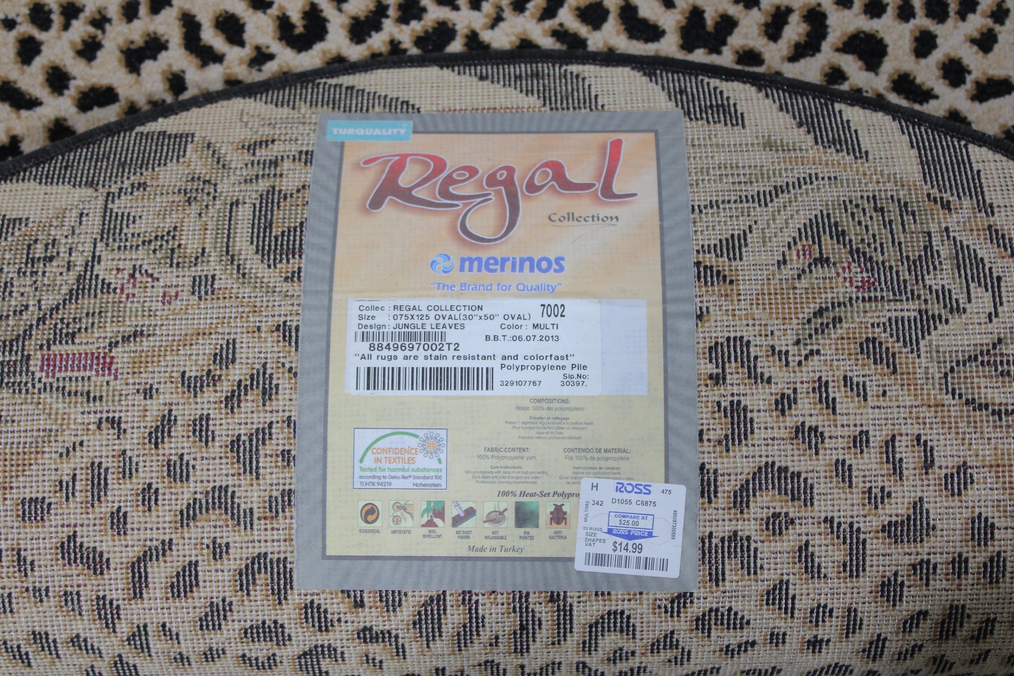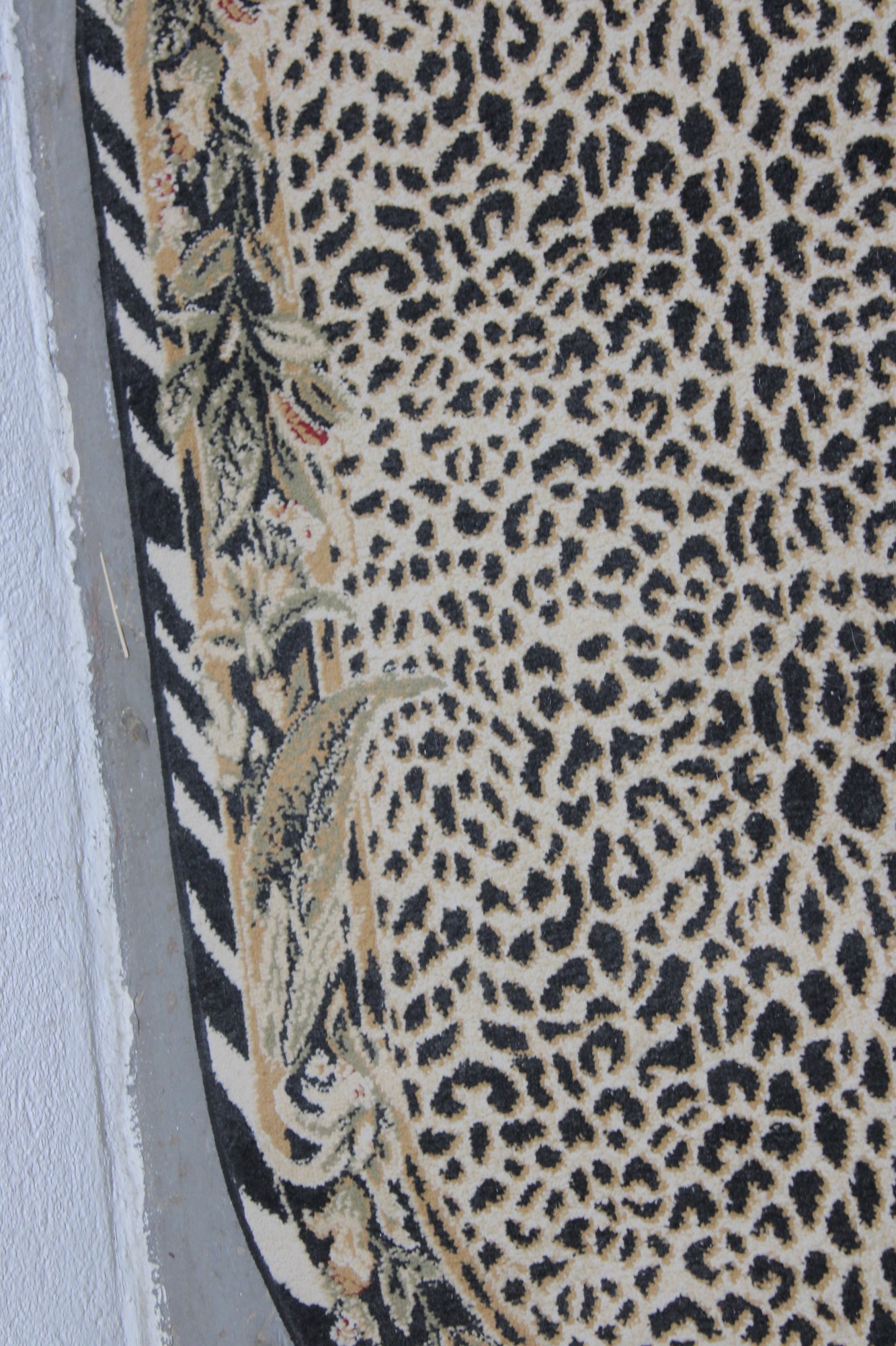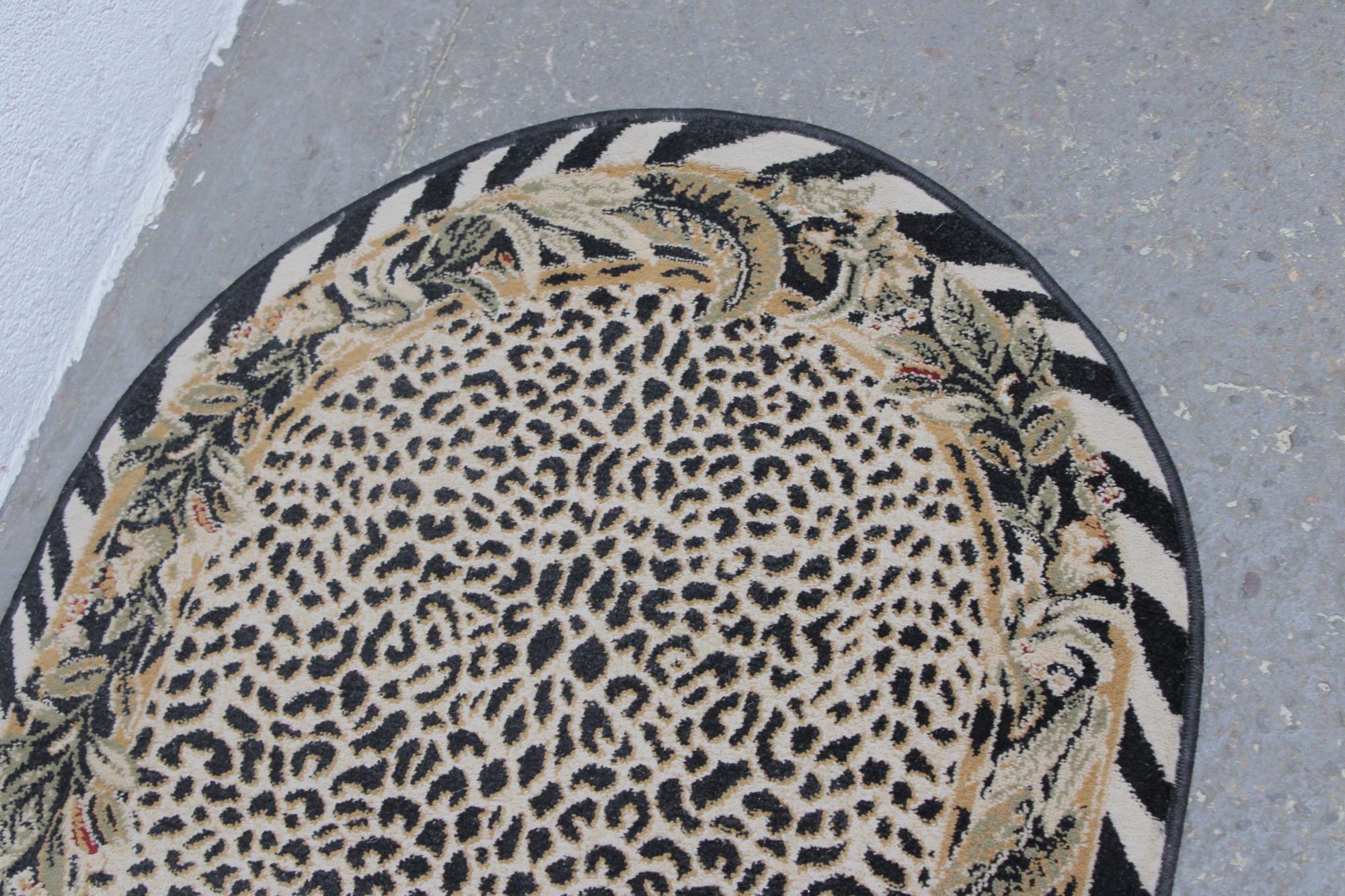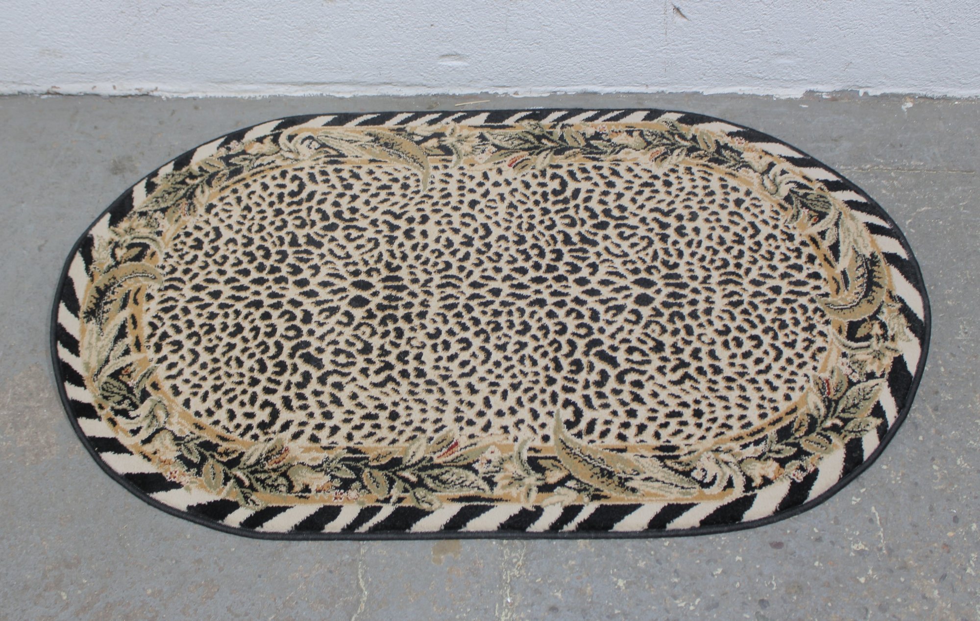 Stylish Regal Collection “Jungle Leaves” oval accent rug featuring a bold leopard print field framed by an elegant border of sweeping botanical leaf motifs. The mix of animal pattern and organic detailing gives this rug a rich, layered look that feels both exotic and refined.