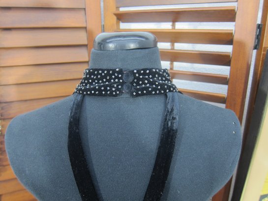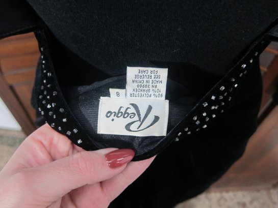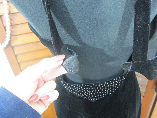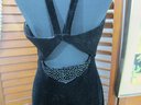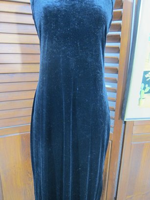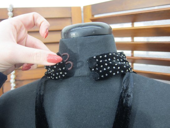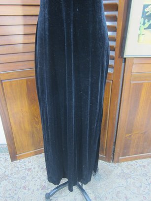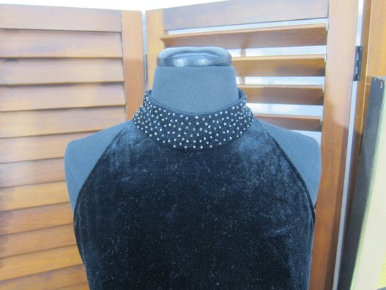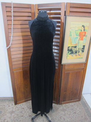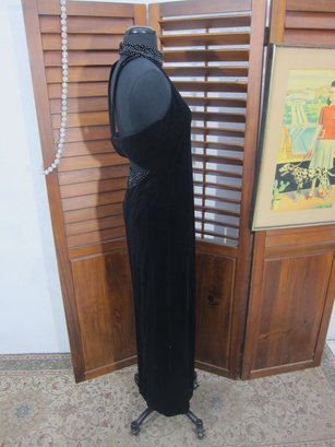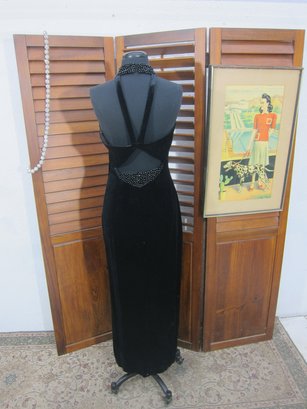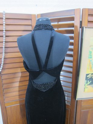 Elegant Reggio black velvet evening gown featuring a sophisticated halter neckline adorned with sparkling rhinestone accents. This striking dress offers a sleek, body-skimming silhouette with a dramatic open-back design and velvet straps, creating a glamorous look from every angle. The soft velvet fabric adds rich texture and classic appeal, perfect for evening wear or special occasions.