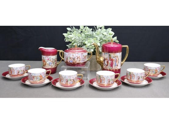 Remarkable Blood Orange And Gold Embellished Phoenix China Tea Set - Six Cups/Saucers, Tea Pot, Creamer/Sugar