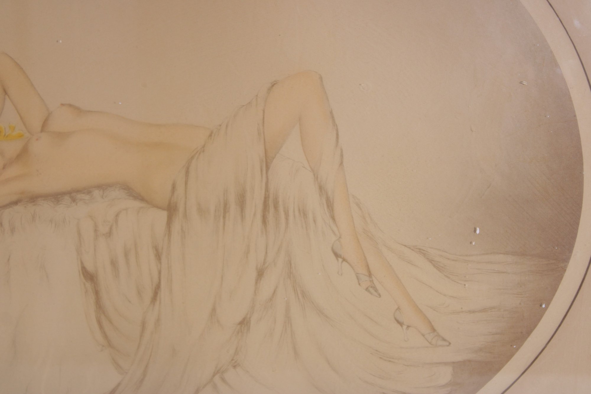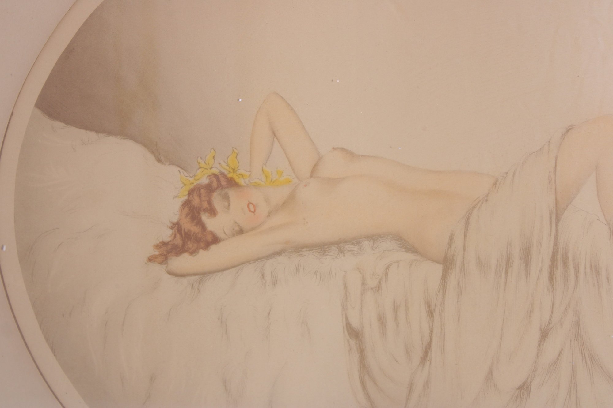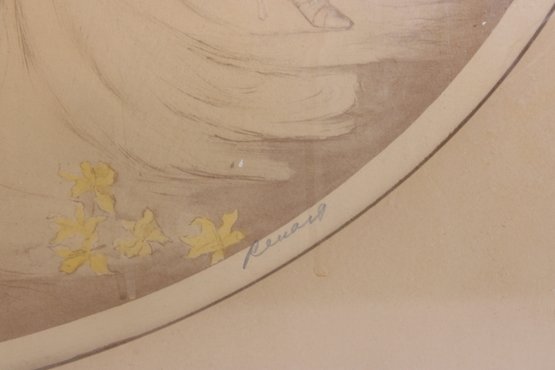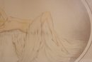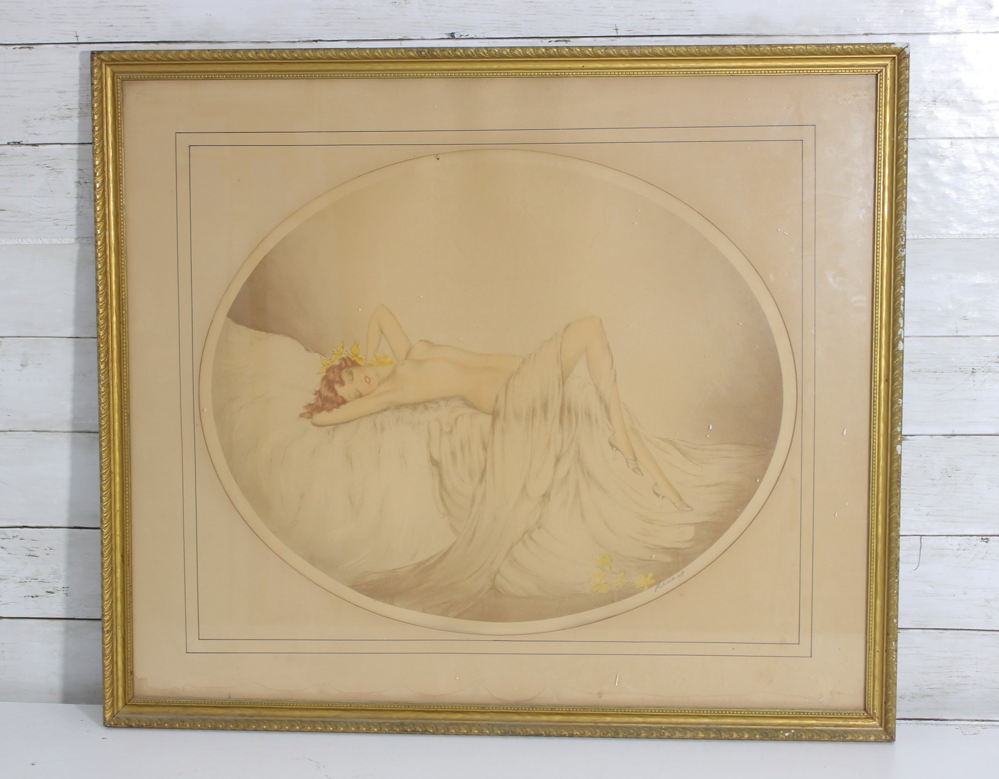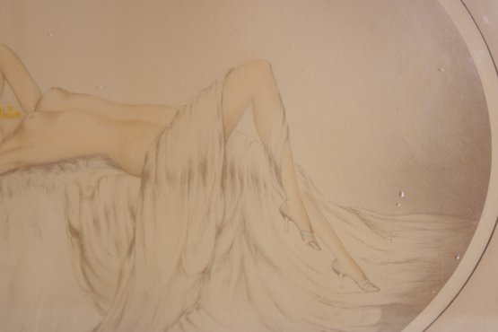 Art Deco style lithograph by Reuart, pencil signed in the lower margin. This refined composition features a reclining nude female figure resting on soft drapery, accented with delicate floral details.