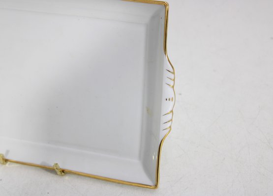 The tray features a classic minimalist design with a bright white porcelain body accented by a delicate gold trim along the rim. The gently scalloped sides incorporate subtle molded handles, adding both beauty and functionality. The underside bears the Richard Ginori Italy hallmark.