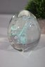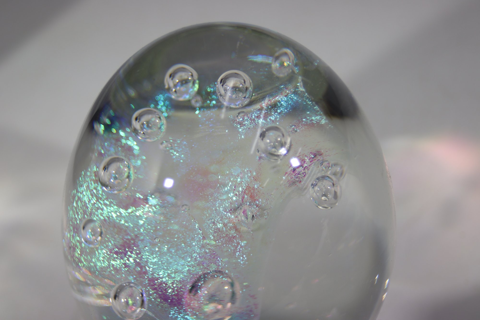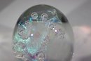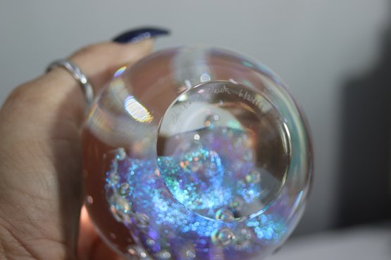 This stunning art glass paperweight features a mesmerizing iridescent swirl design encased within a clear, dome-shaped glass body. The intricate bubbles and shimmering, opalescent inclusions create a dynamic and captivating display, making it a perfect decorative piece or functional desk accessory. Signed by the artist, this unique paperweight showcases excellent craftsmanship and elegance. Ideal for collectors, office décor, or as a thoughtful gift for art glass enthusiasts.