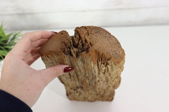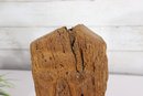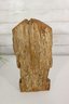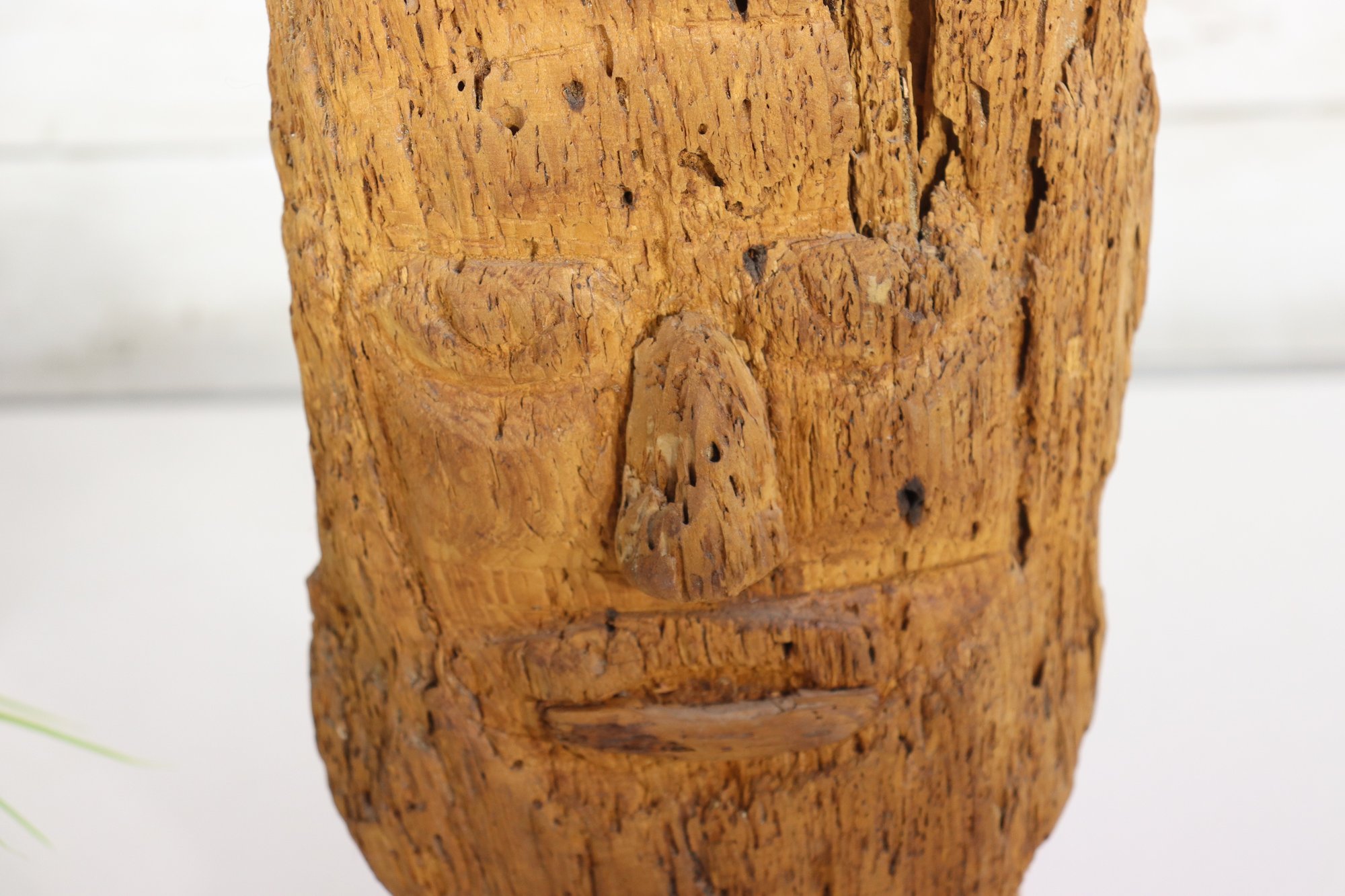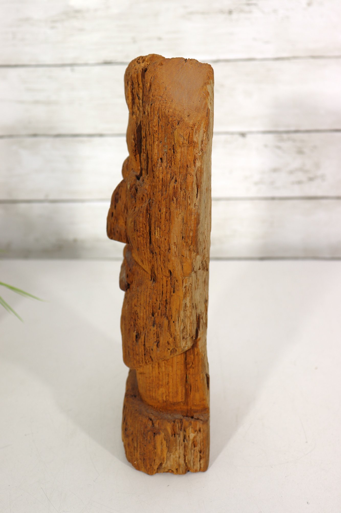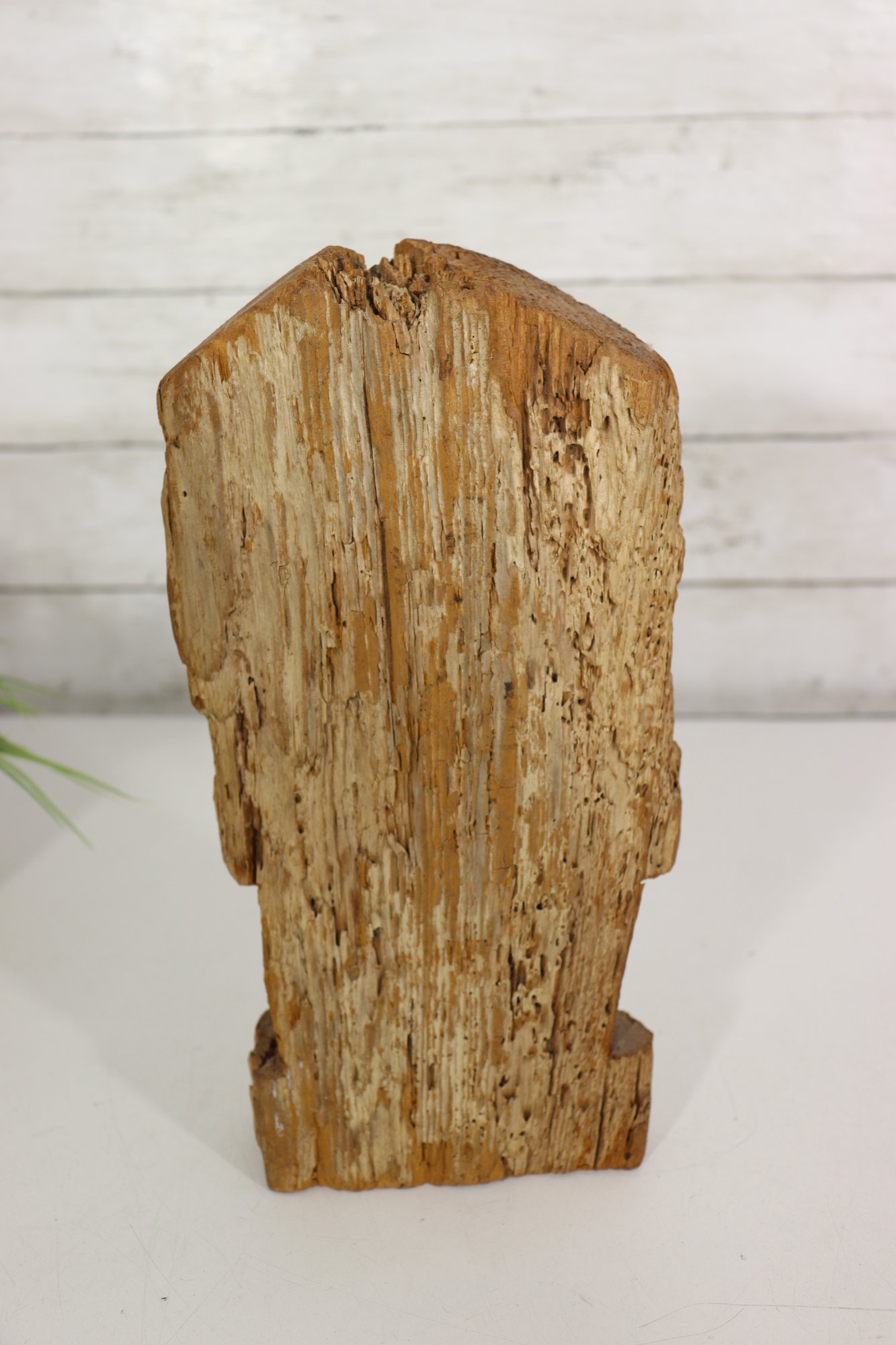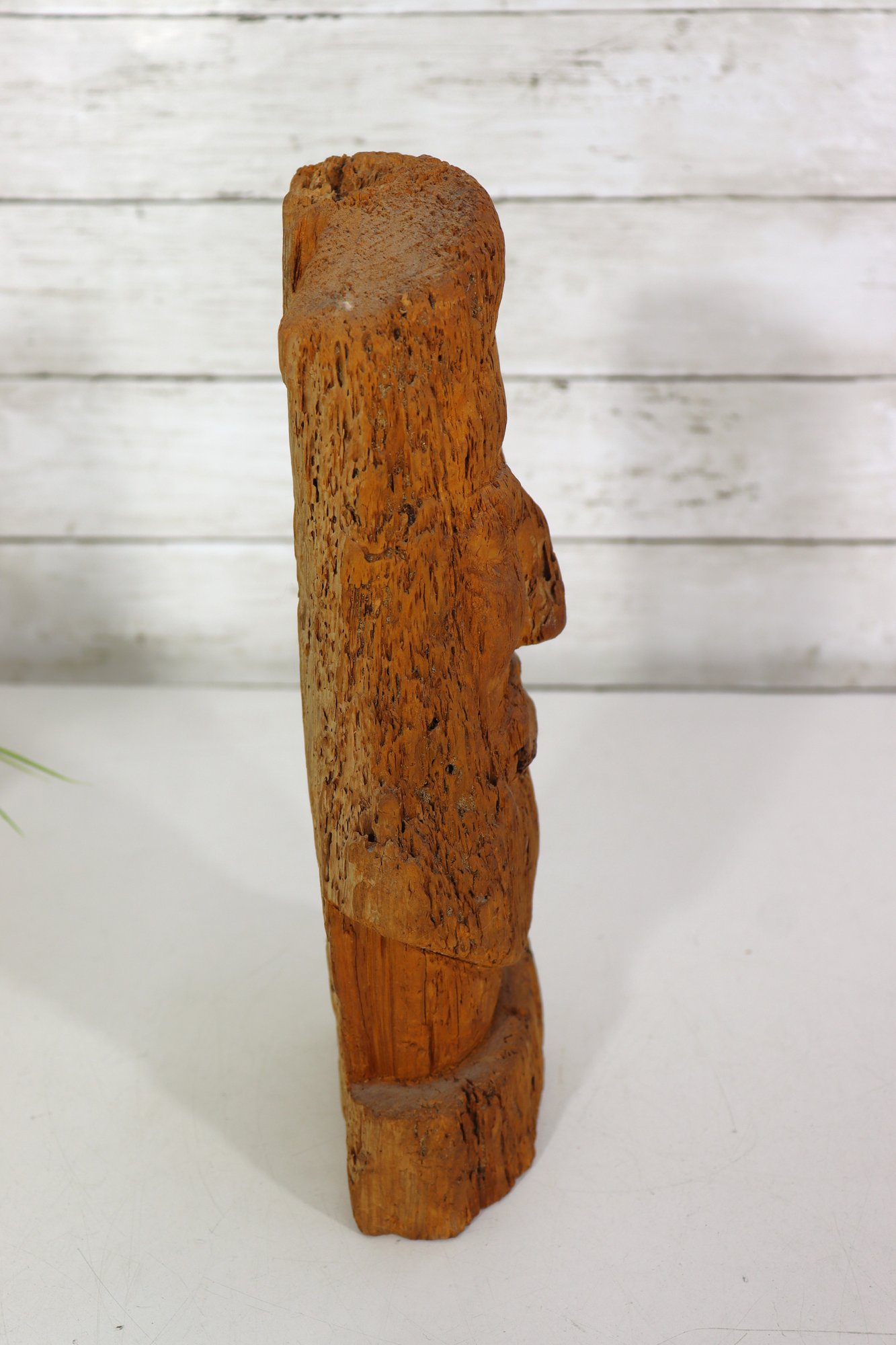 The sculpture shows visible cracks, age wear, and natural imperfections, enhancing its organic charm and authenticity. It’s a perfect accent for rustic, bohemian, or ethnographic décor collections.