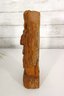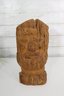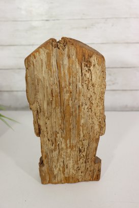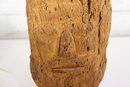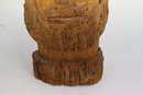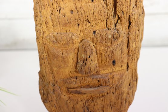 Unique and rustic hand-carved wooden head sculpture, standing approximately 12.5 inches tall, crafted in a primitive tribal or folk art style. This striking piece is carved from a single piece of aged wood, with bold facial features and a naturally weathered surface that adds rich texture and character.