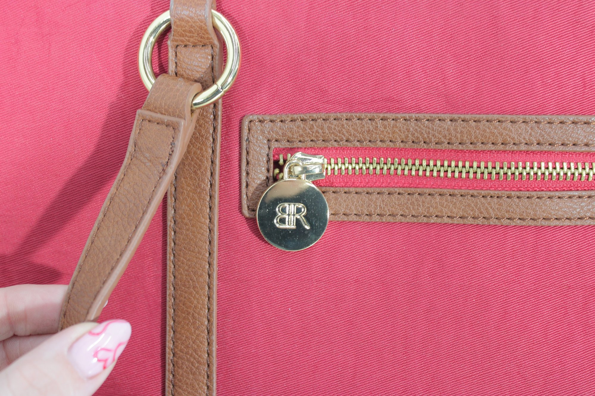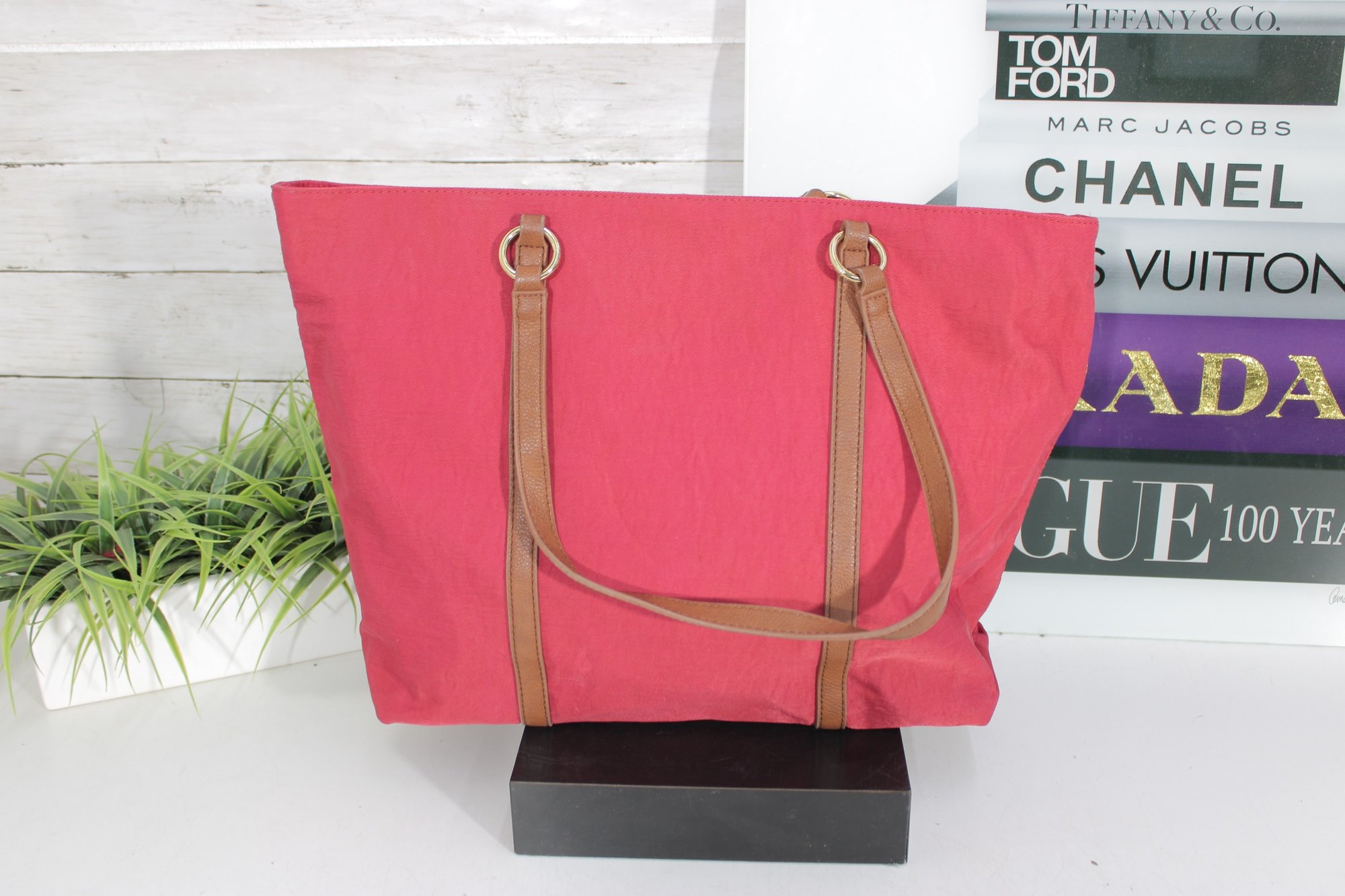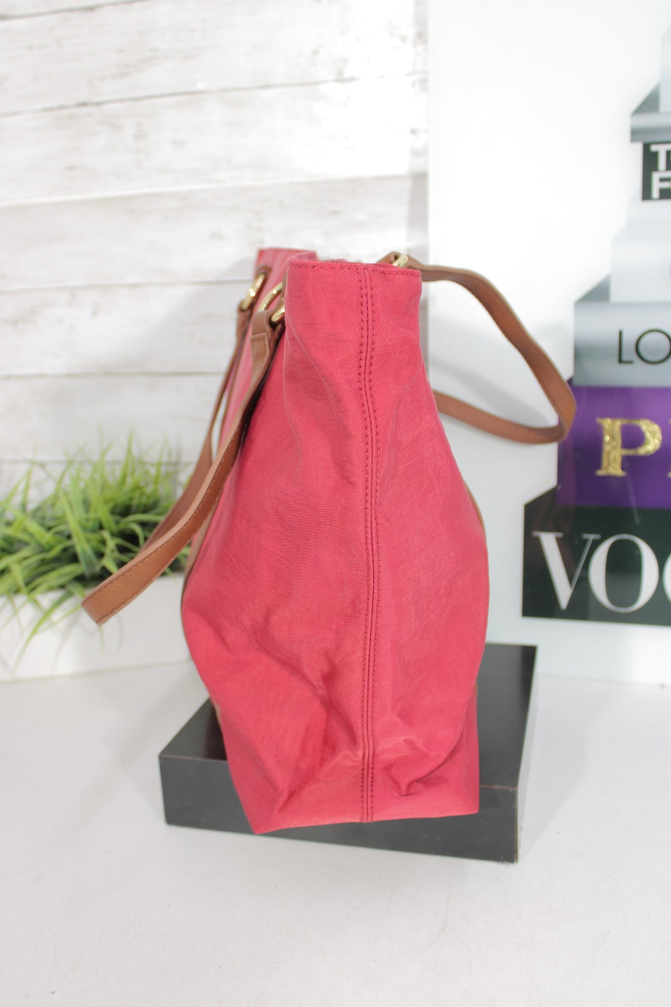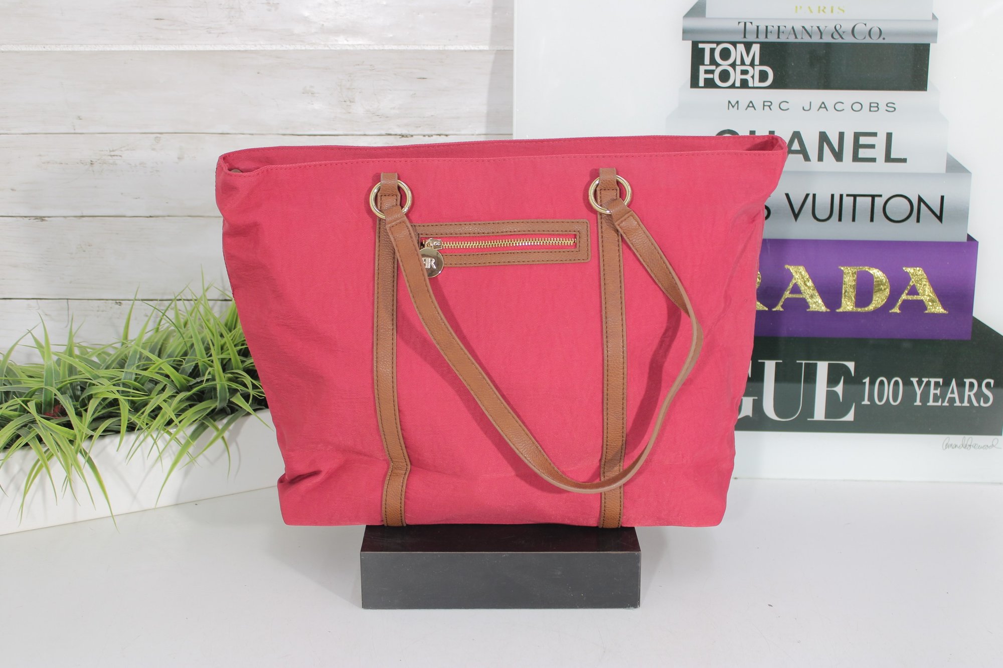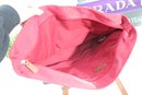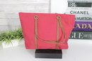Rioni pink canvas tote bag accented with tan leather trim and gold-tone hardware. This vibrant and spacious handbag is perfect for everyday use, travel, or work.
