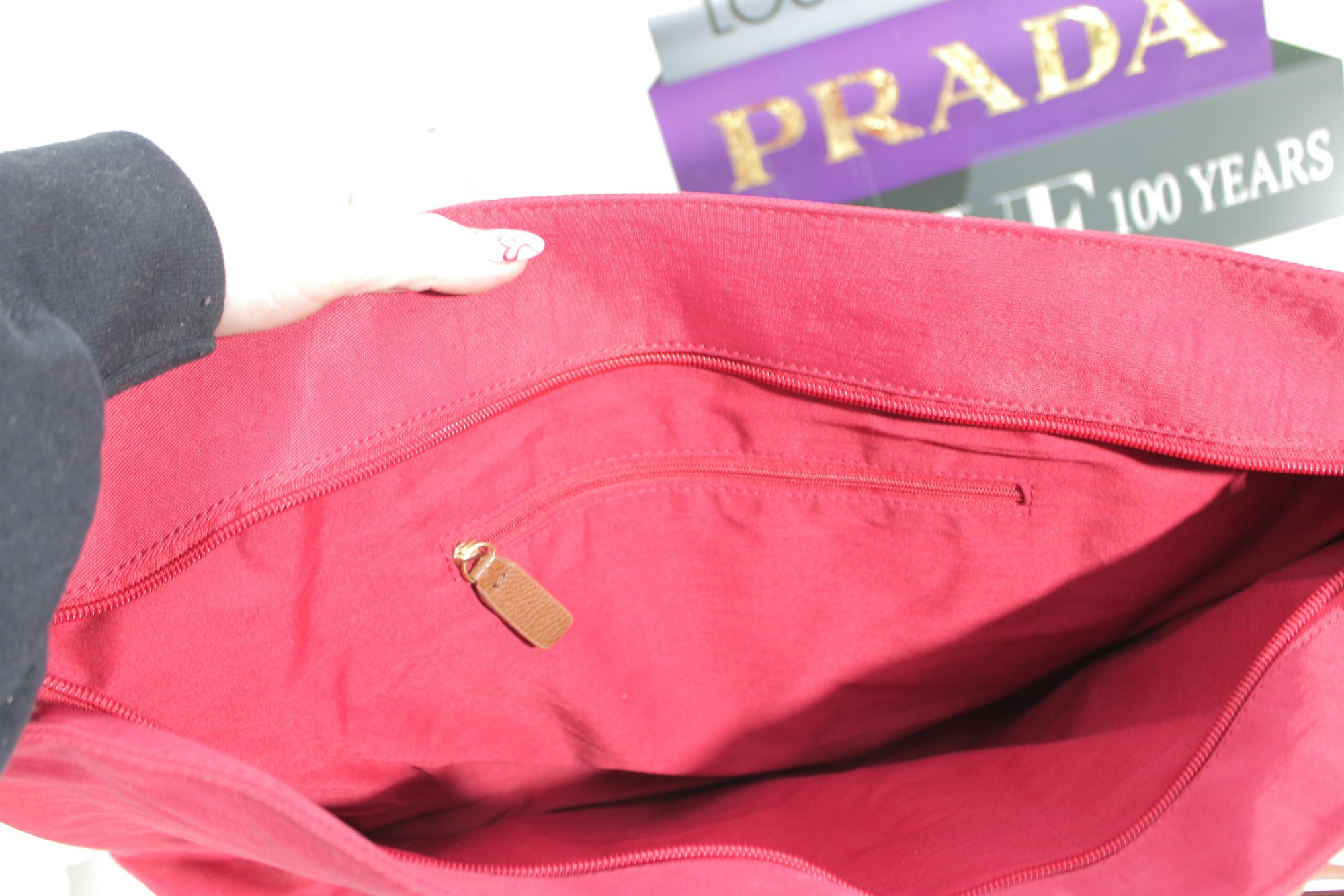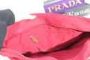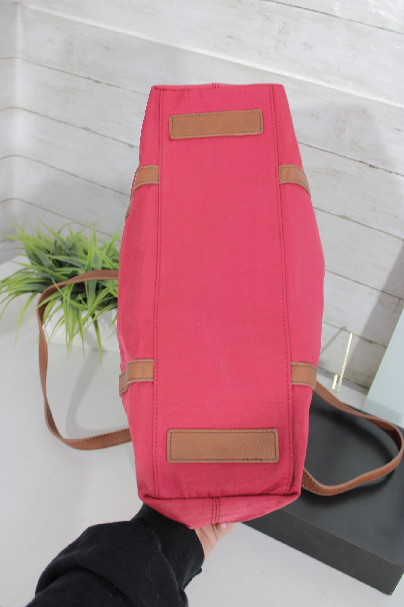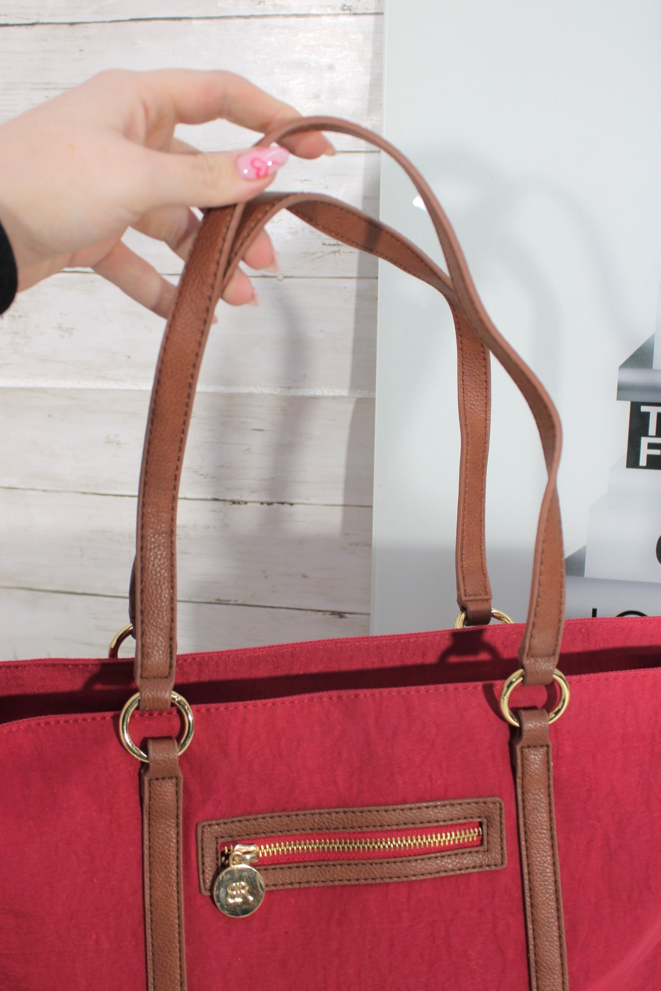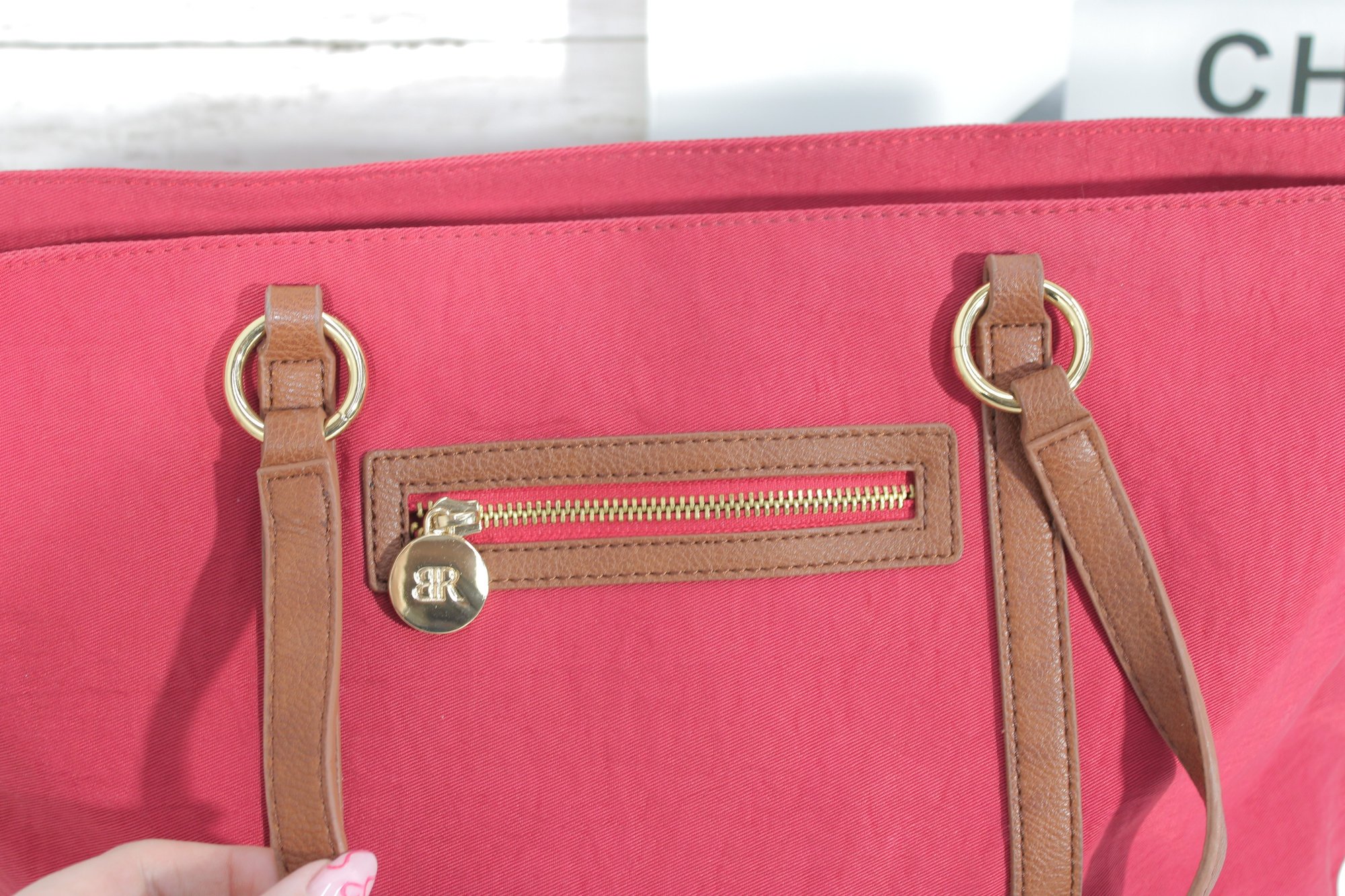 Rioni pink canvas tote bag accented with tan leather trim and gold-tone hardware. This vibrant and spacious handbag is perfect for everyday use, travel, or work.