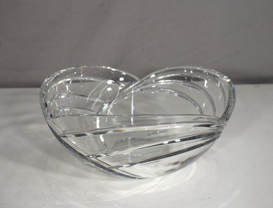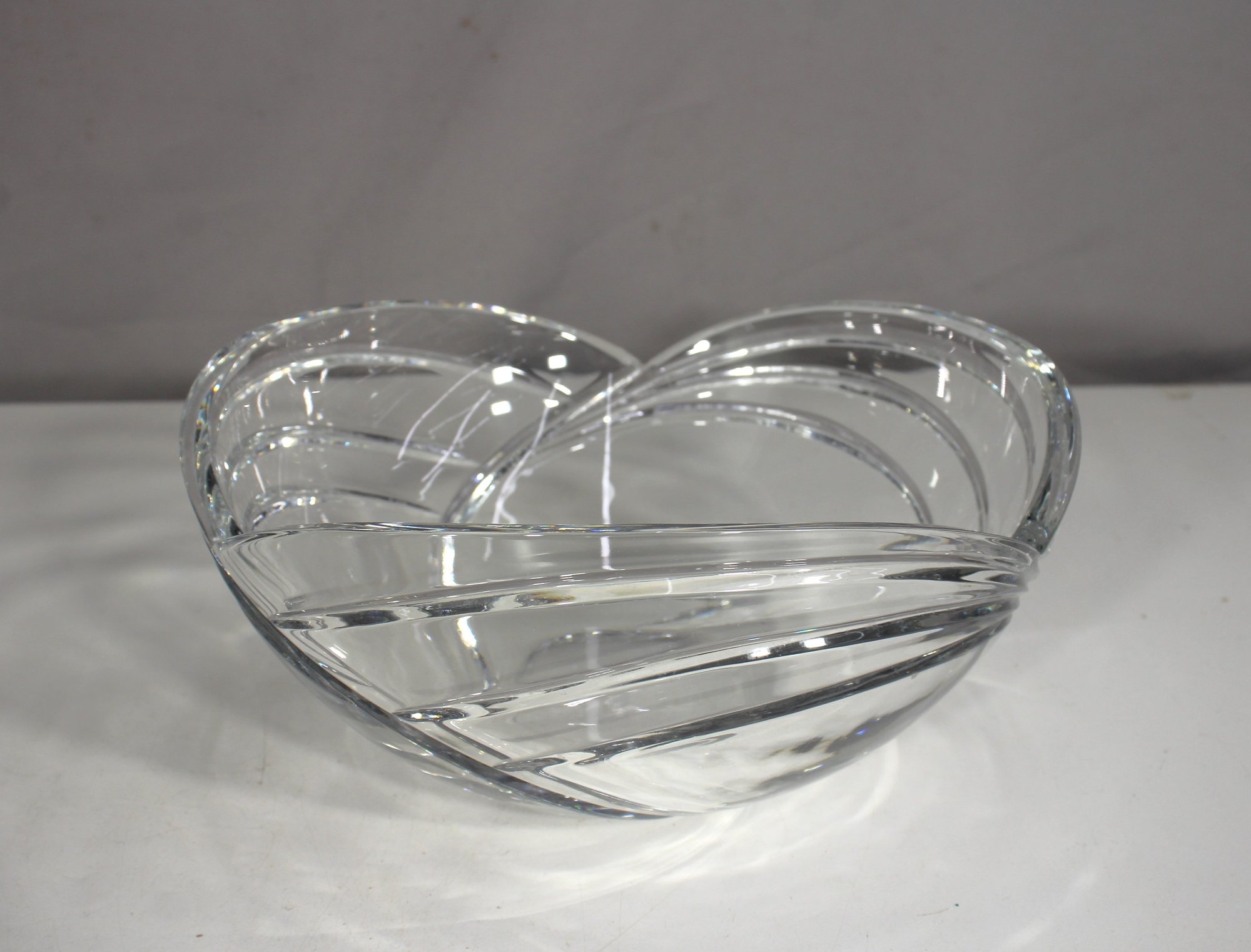 this signed Rogaska centerpiece bowl showcases the brand’s renowned craftsmanship in full lead crystal. The heavy, weighty form is enhanced by deep, sweeping cuts that create a sophisticated geometric swirl design. Perfect as a statement piece on your dining table or as a luxurious serving bowl.