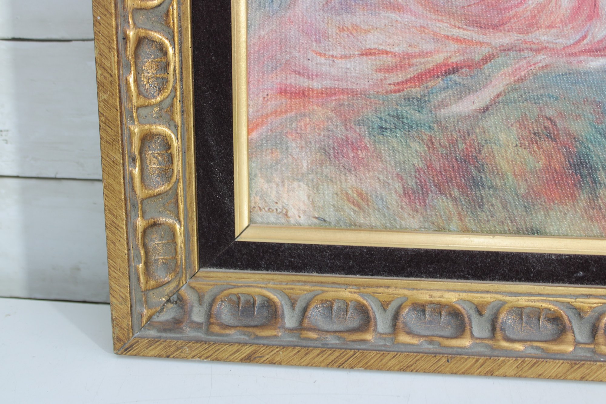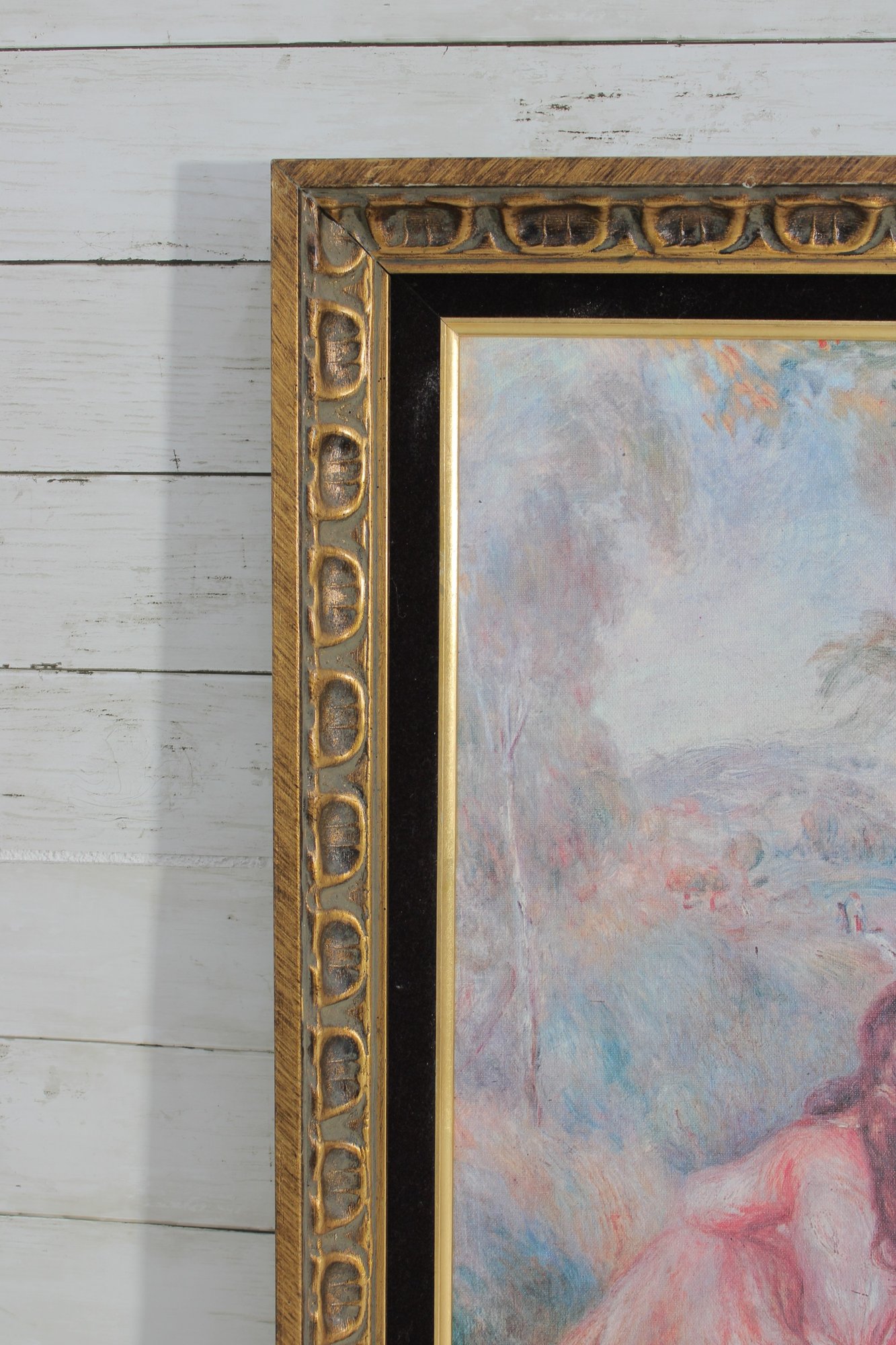 The artwork is printed on canvas and presented in an ornate gold-tone frame with carved detailing and a black inner border, giving it a refined, gallery-style presence. Ready to hang