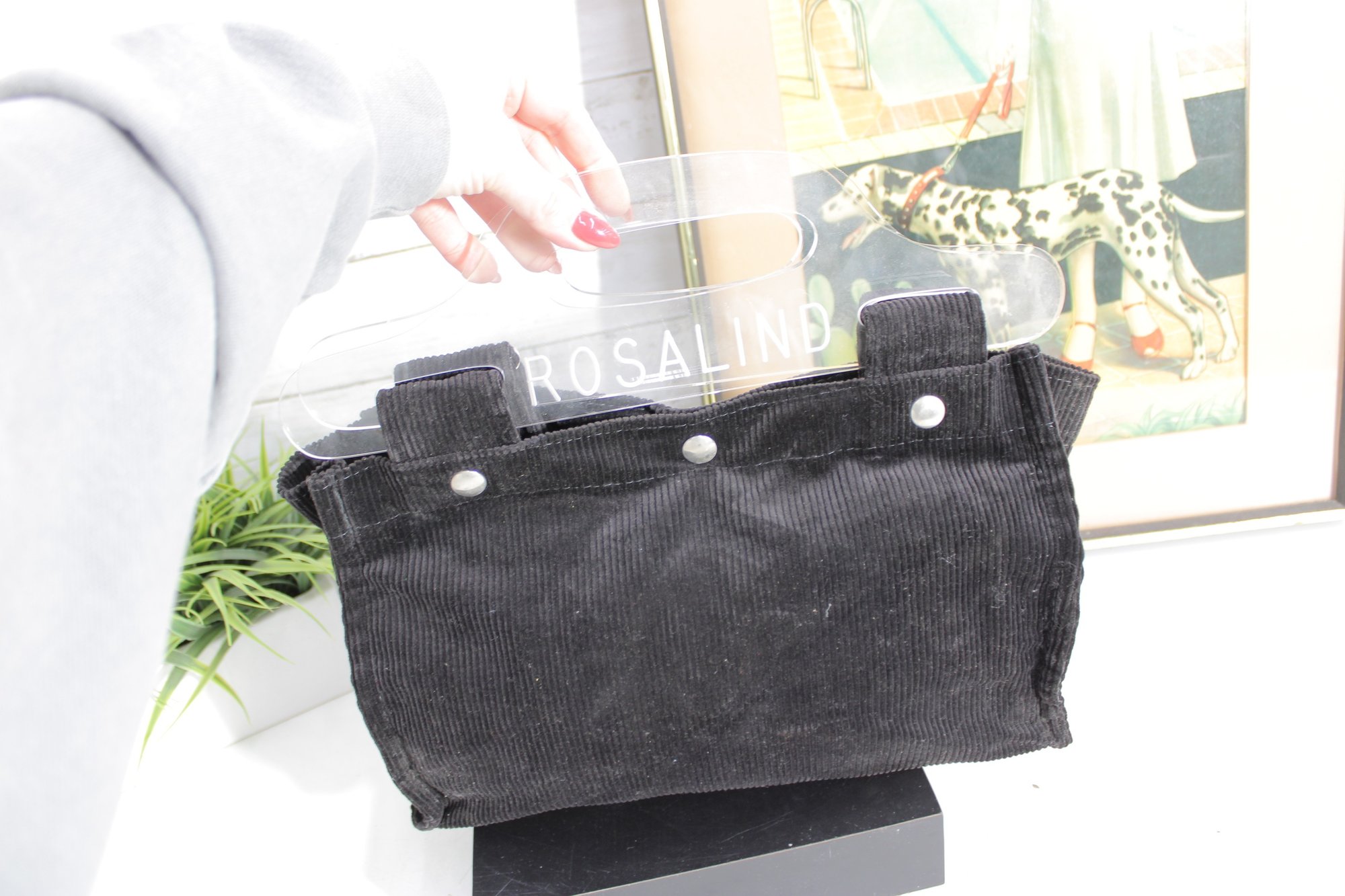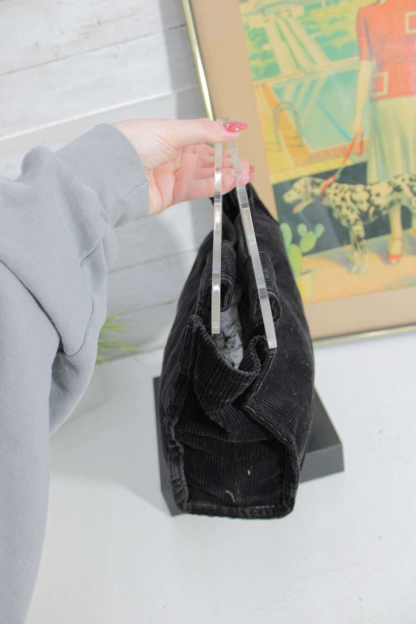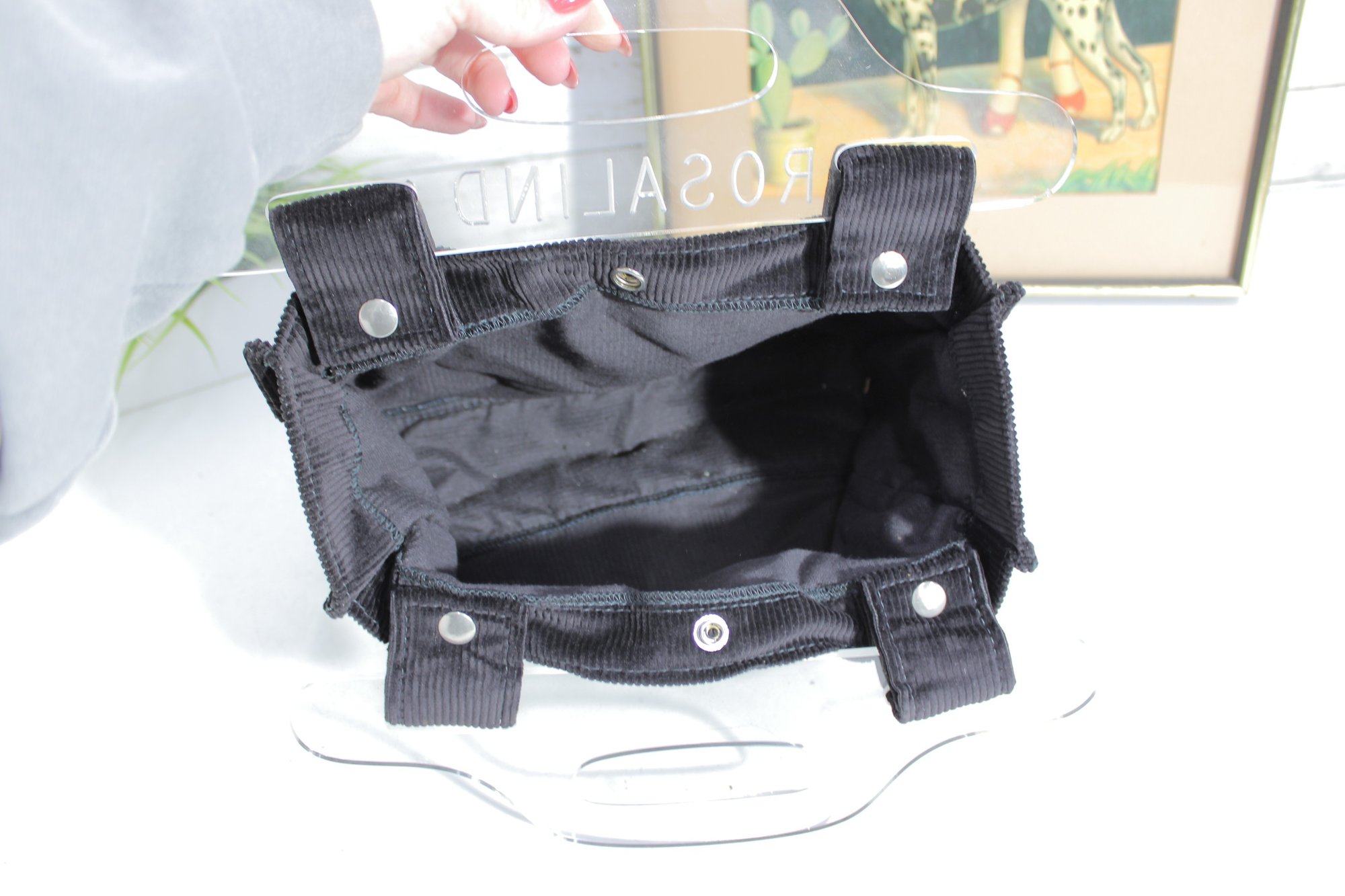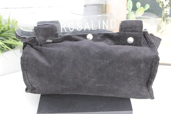 Chic and modern, this Rosalind mini tote handbag features a unique design with clear acrylic handles paired with a soft black corduroy body for a stylish contrast of textures.