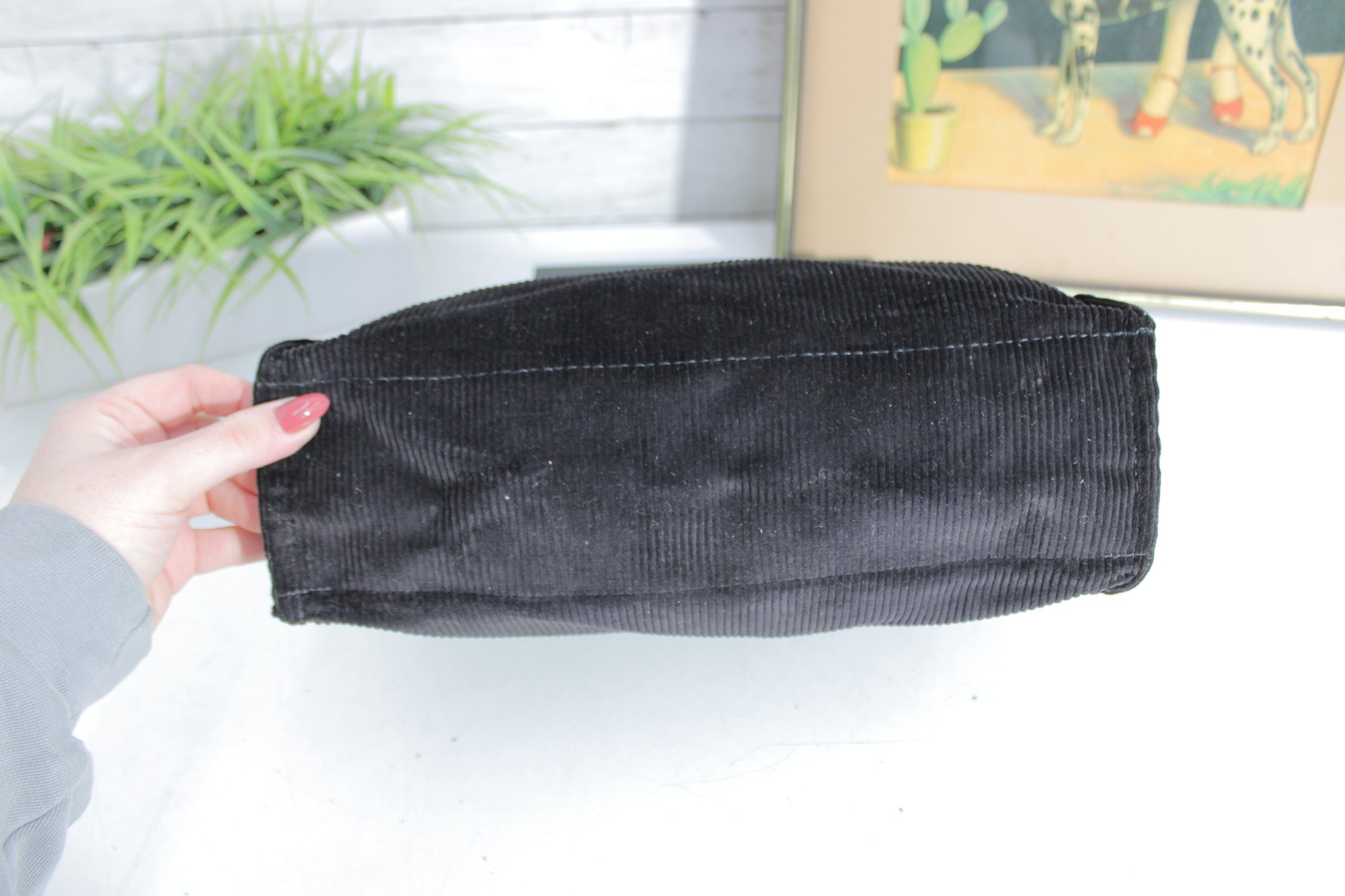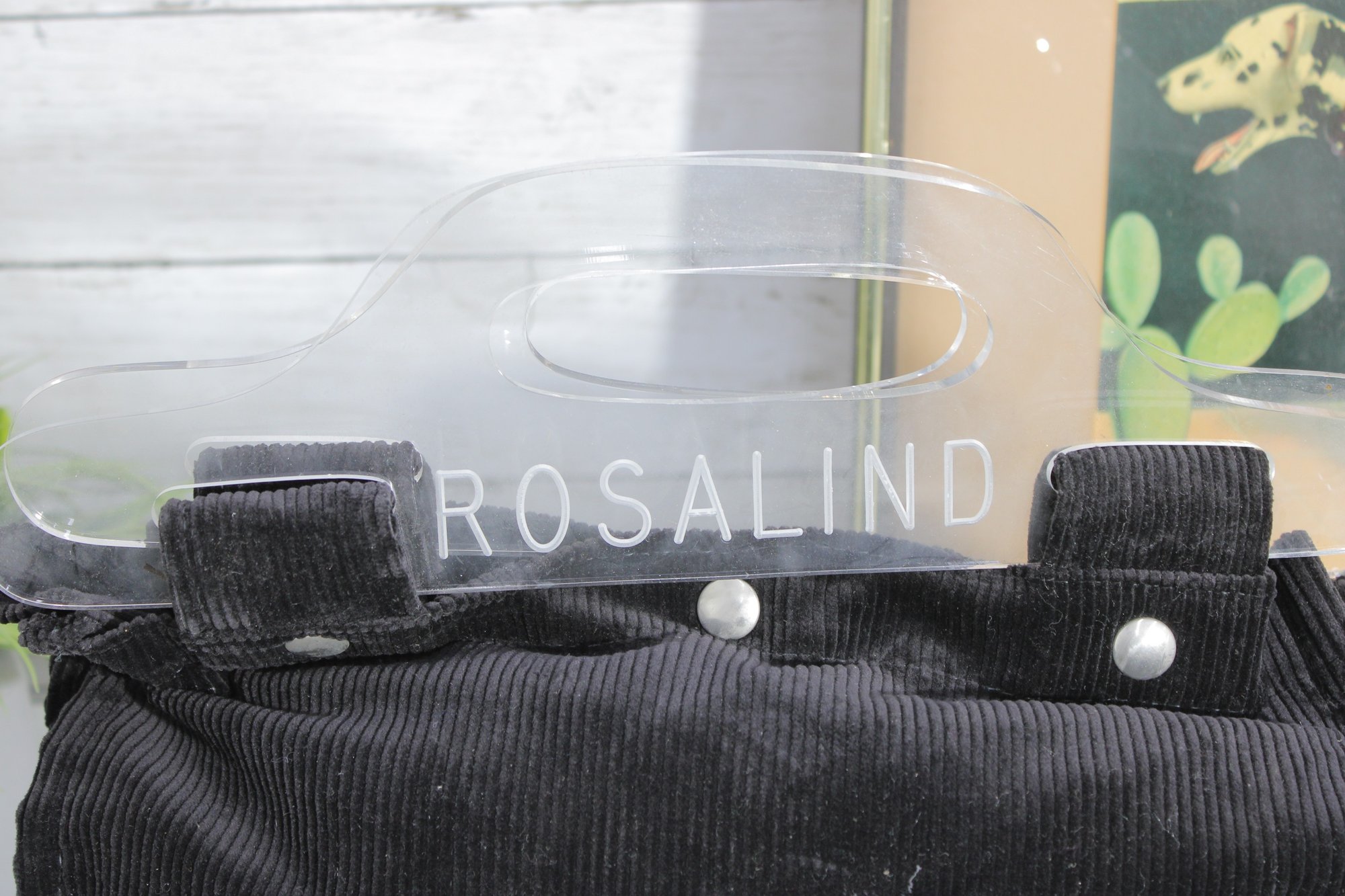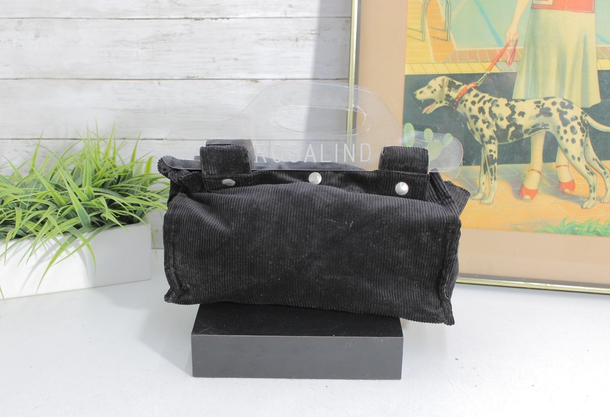Chic and modern, this Rosalind mini tote handbag features a unique design with clear acrylic handles paired with a soft black corduroy body for a stylish contrast of textures.