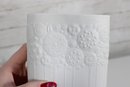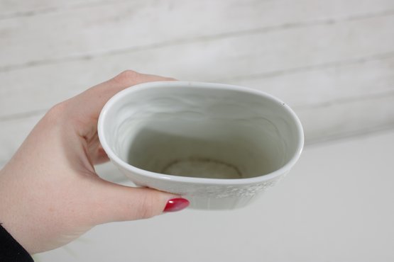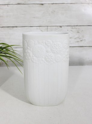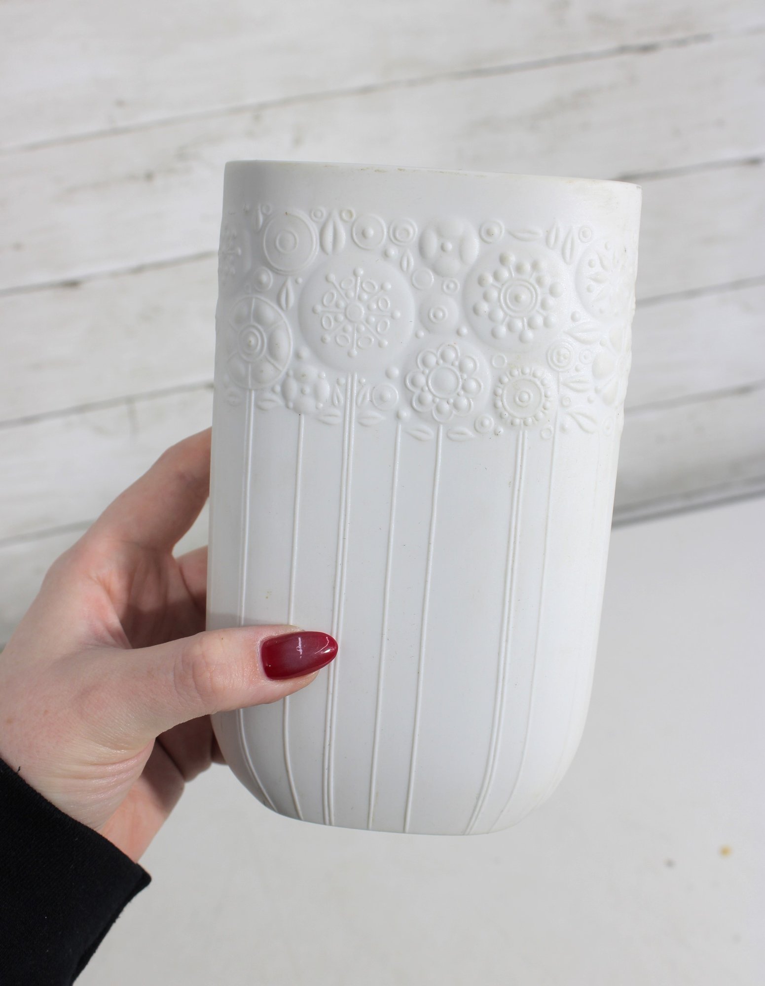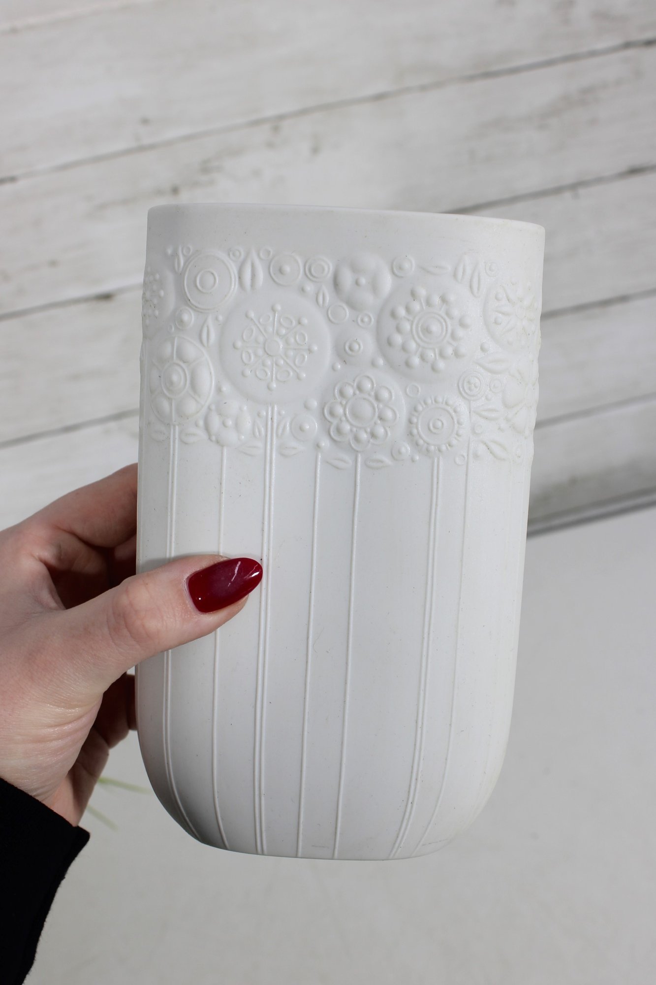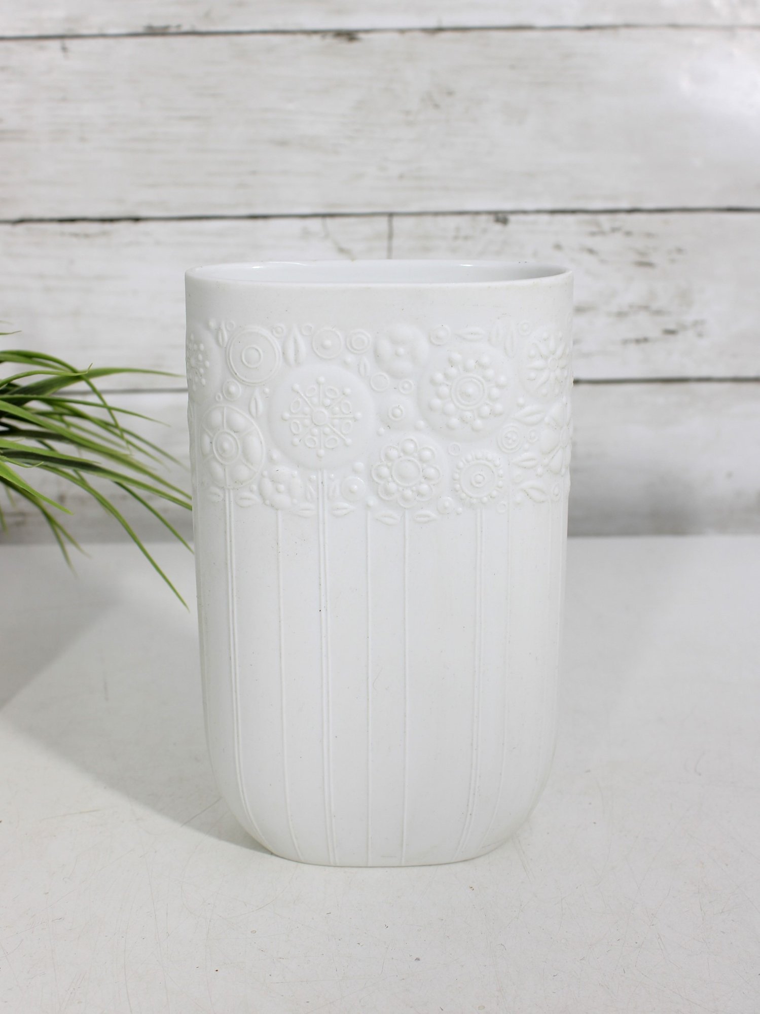 Beautiful vintage Rosenthal Studio-Line bisque porcelain vase designed by renowned Danish artist Björn Wiinblad. This elegant piece features a matte white finish with intricate raised floral relief, showcasing stylized blossoms and delicate vertical line detailing characteristic of Wiinblad’s whimsical and decorative style.