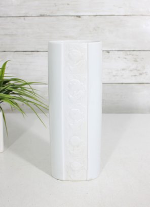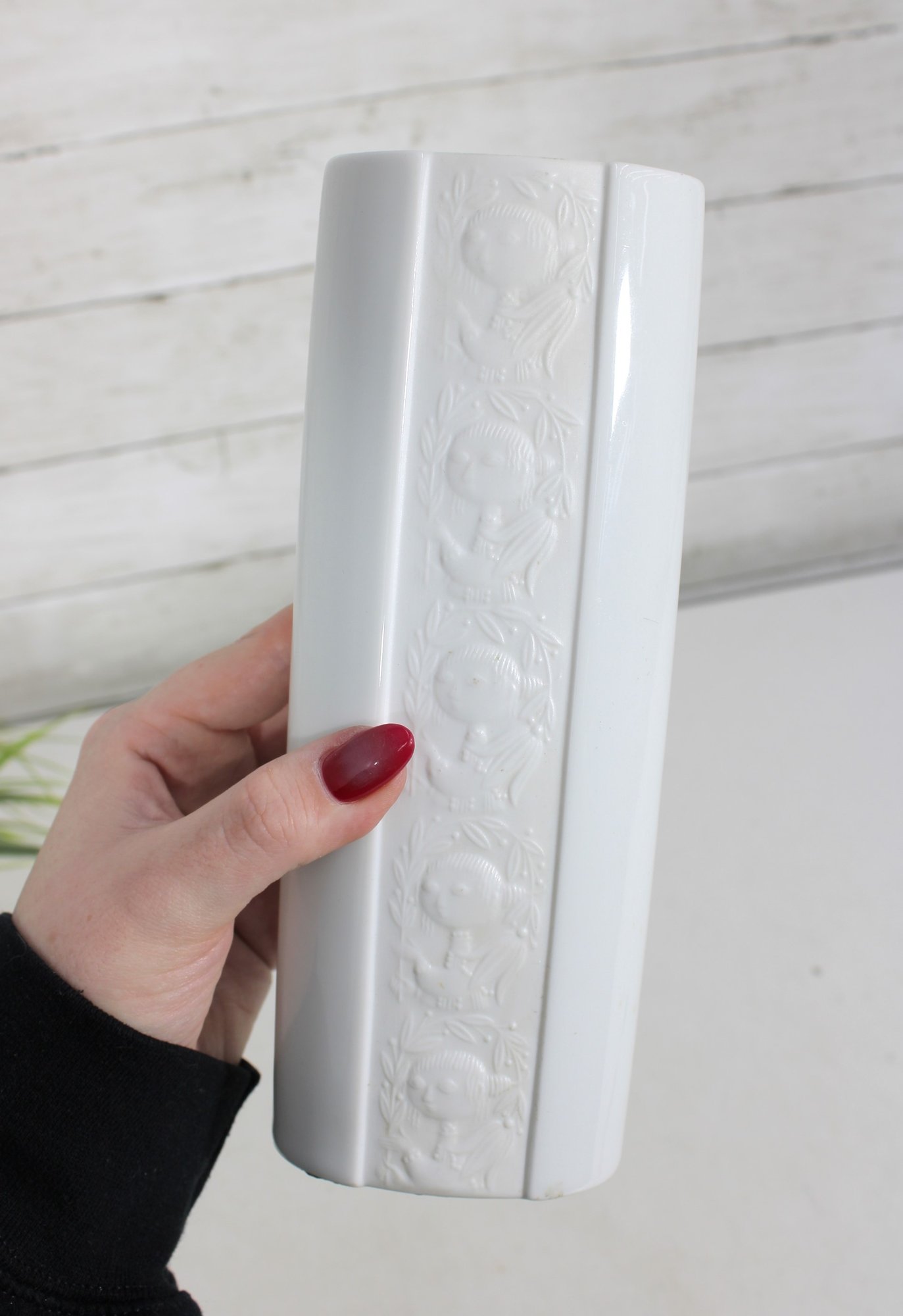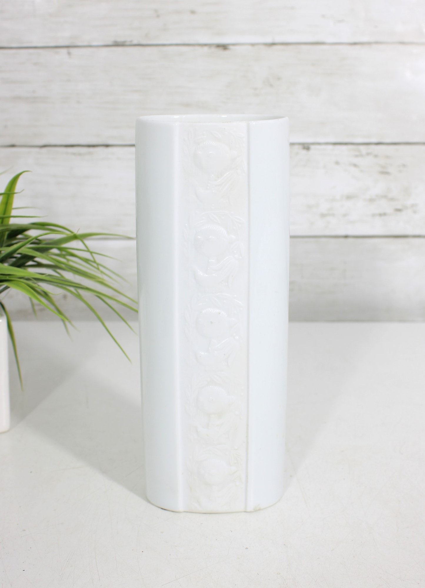 Rosenthal Studio Line porcelain vase from the iconic “Magic Flute” (Zauberflöte) series, designed by celebrated Danish artist Björn Wiinblad. This refined piece features a minimalist white glazed finish with subtle raised relief decoration, showcasing delicate figures and ornamental motifs characteristic of Wiinblad’s distinctive style.