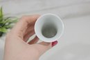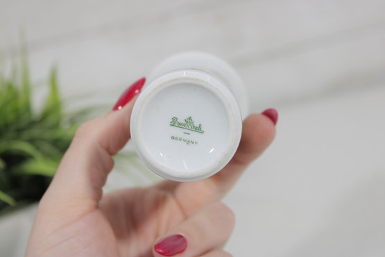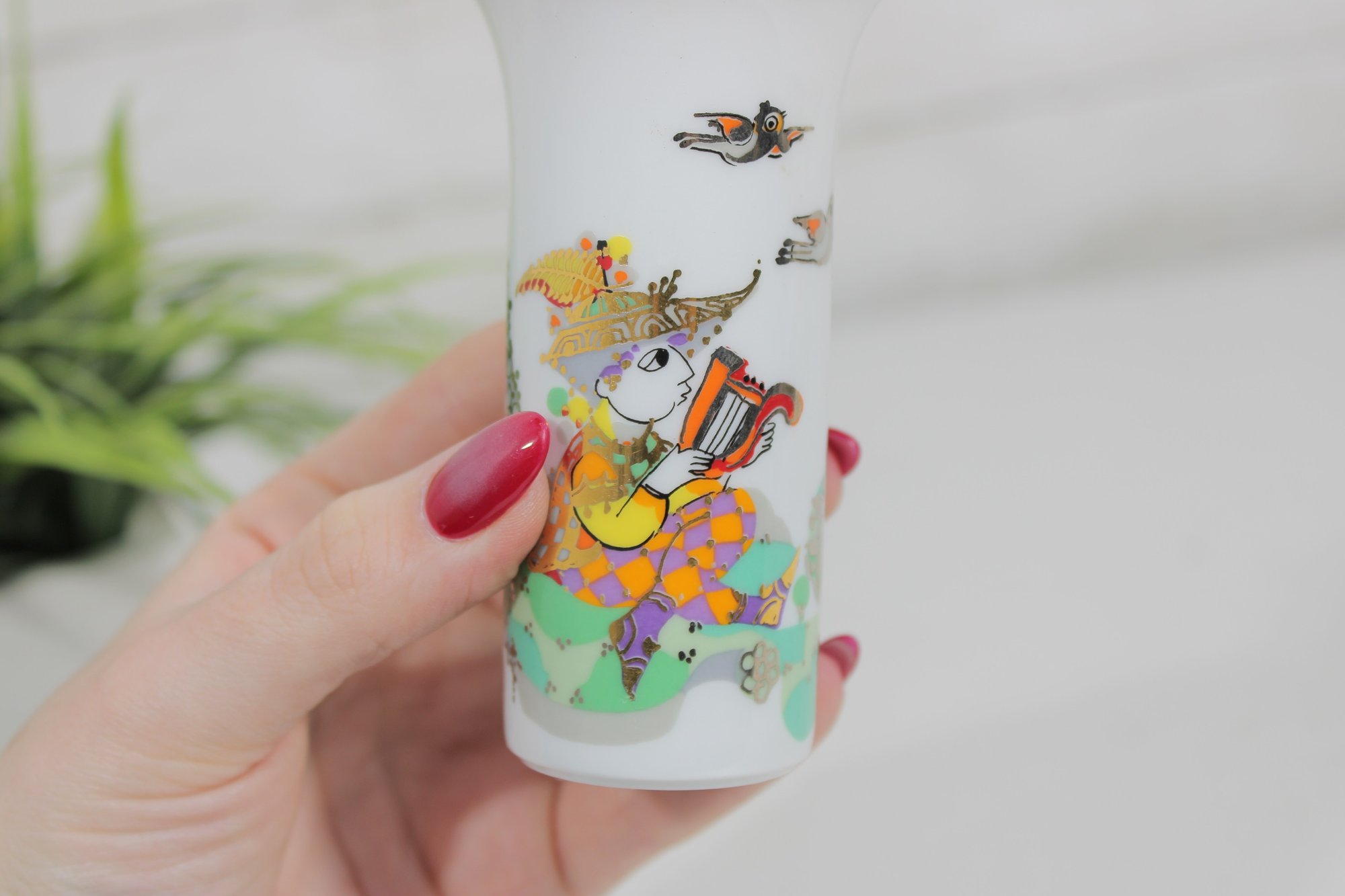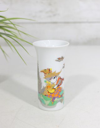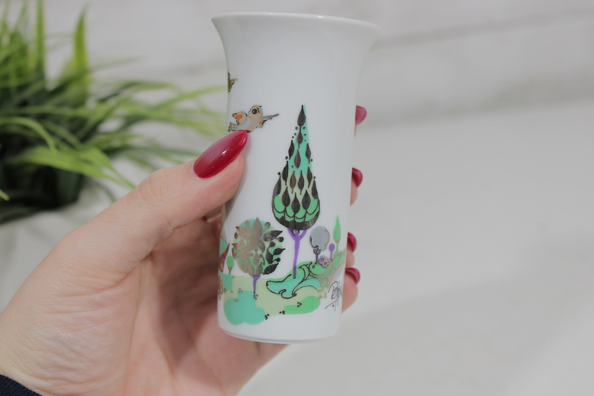 Charming miniature porcelain vase by Rosenthal Studio Line, featuring a whimsical design attributed to Danish artist Bjørn Wiinblad. This petite vase showcases a colorful, storybook-style figure in a harlequin-patterned outfit, surrounded by playful scenery and birds.