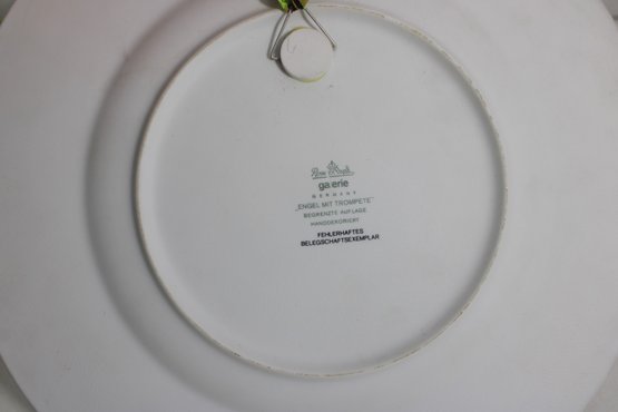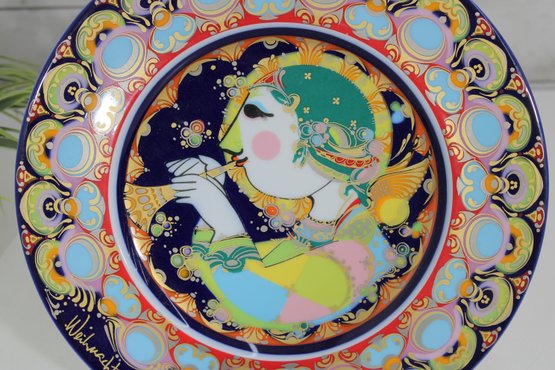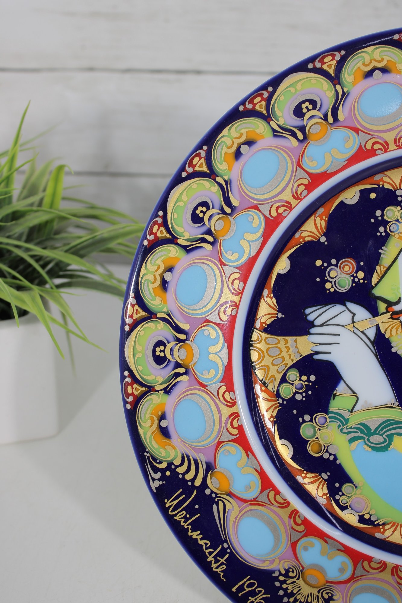 Vibrant and highly collectible Rosenthal Studio Linie porcelain plate designed by Bjorn Wiinblad, titled “Engel Mit Trompete” (Angel with Trumpet). This striking piece features Wiinblad’s iconic whimsical style, showcasing a stylized angel figure in rich, bold colors with intricate decorative patterns and celestial accents.