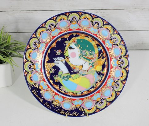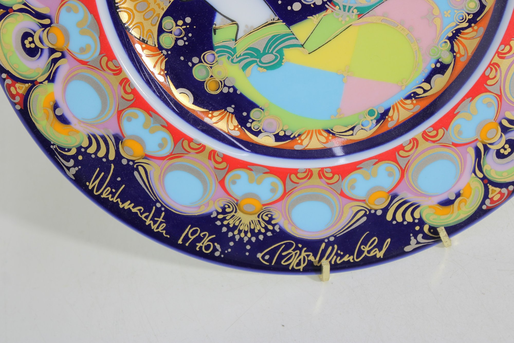 The composition is set against a deep blue background with elaborate border detailing in gold, pastel tones, and flowing motifs, creating a dynamic and eye-catching design. Wiinblad’s signature appears on the front, along with the date 1976, adding to its collectible appeal. The reverse bears the Rosenthal Studio Linie Germany mark.