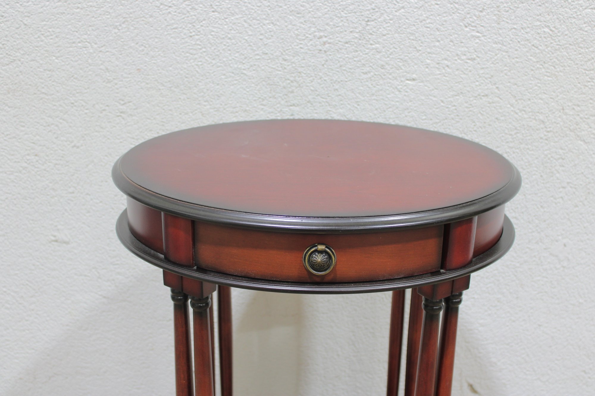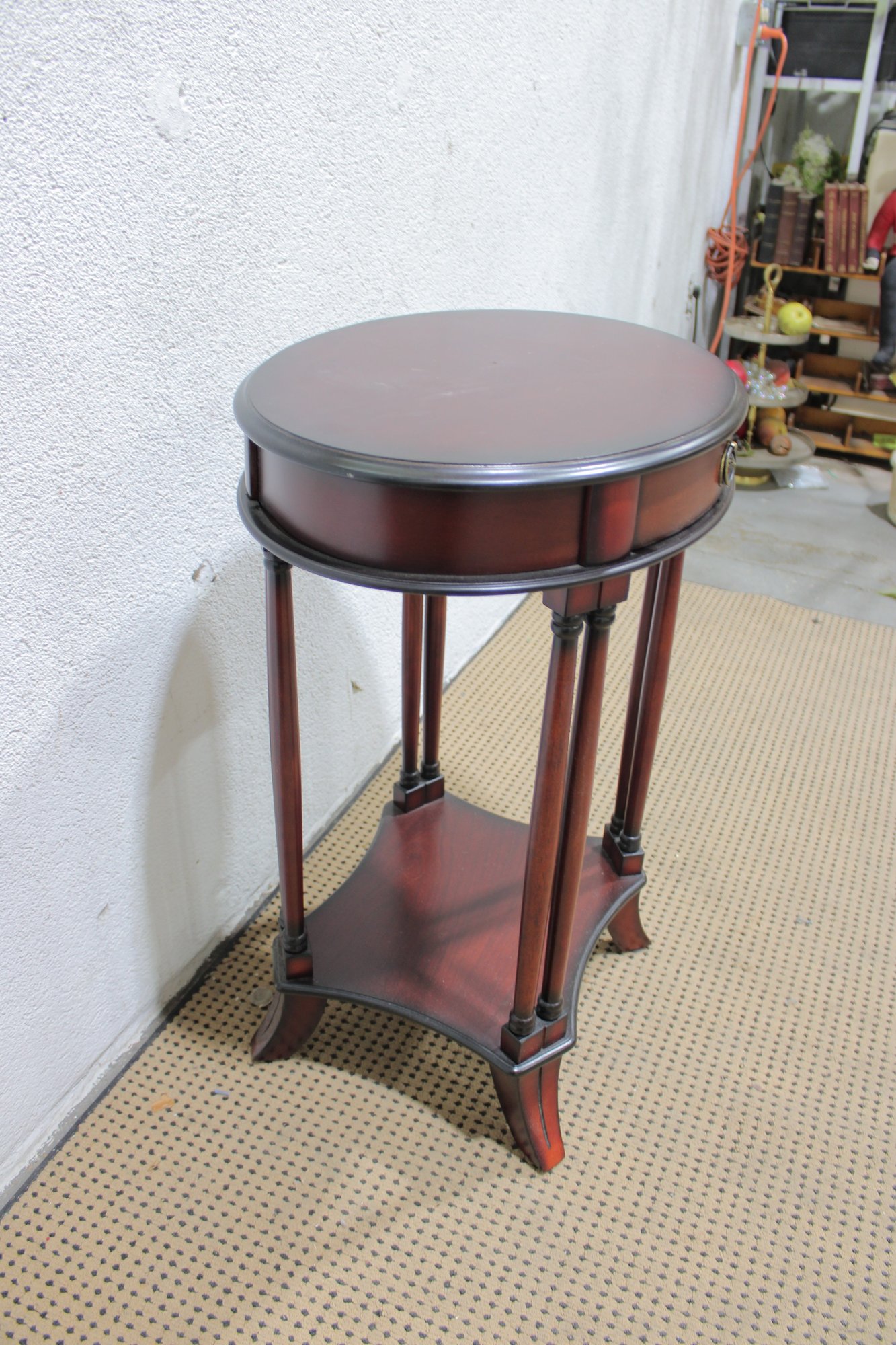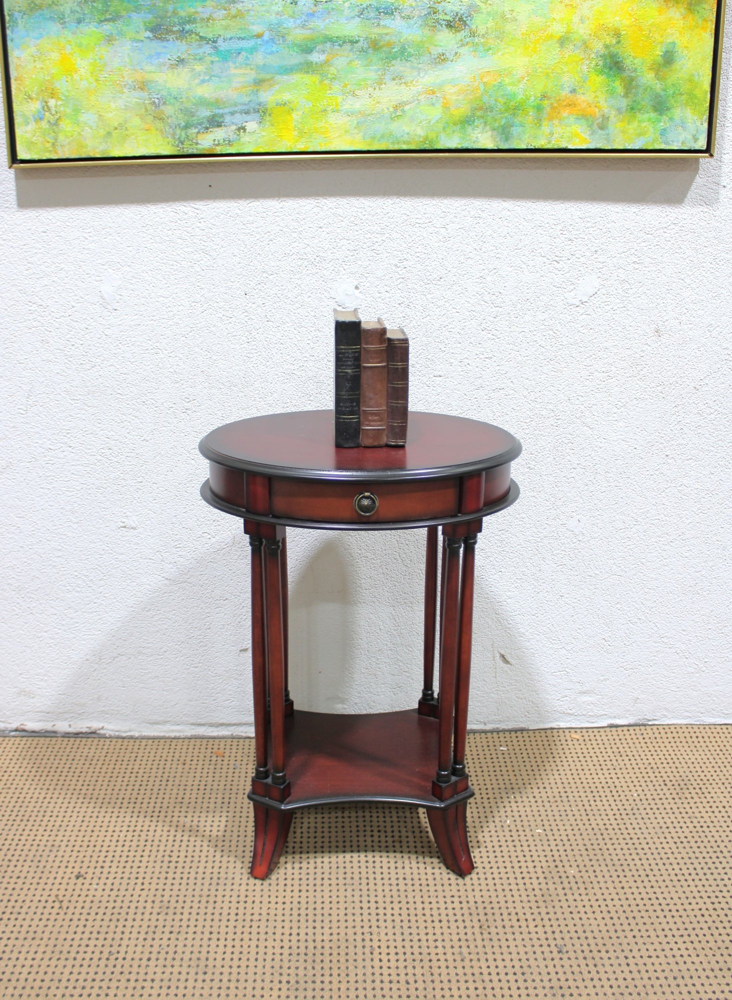 Finished in a rich red mahogany tone with darker trim accents, this table features a classic round top and graceful vertical supports that give it a refined, traditional look. A single pull-out drawer provides convenient storage for small essentials like remotes, glasses, or personal items, while the lower shelf offers additional space for display or storage.