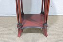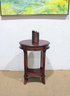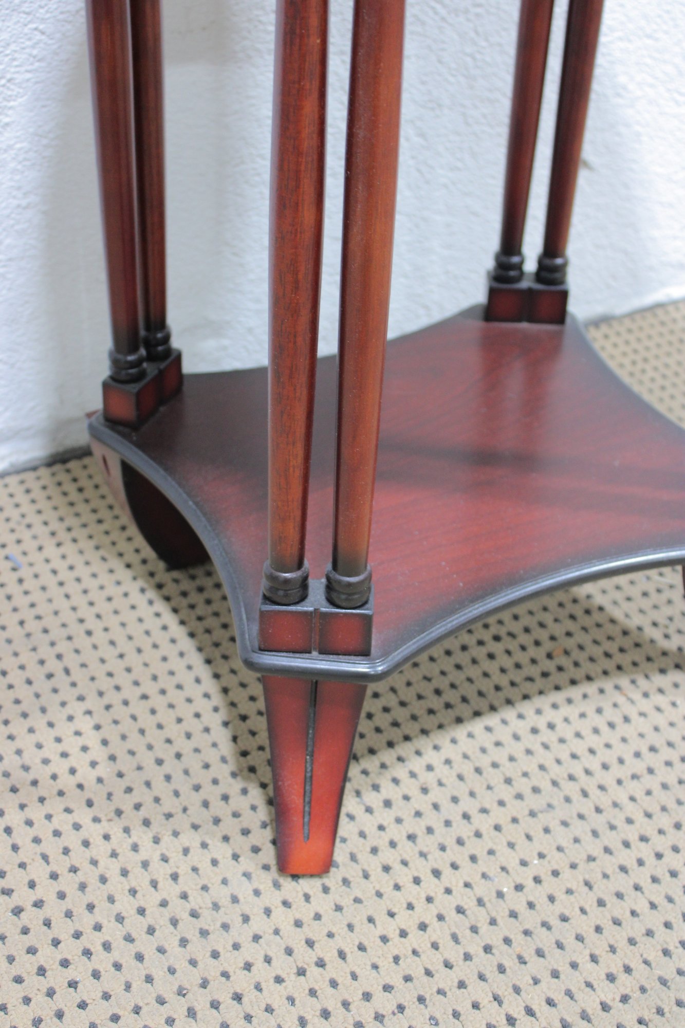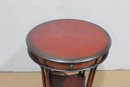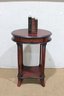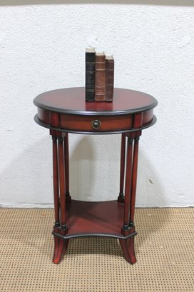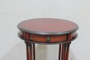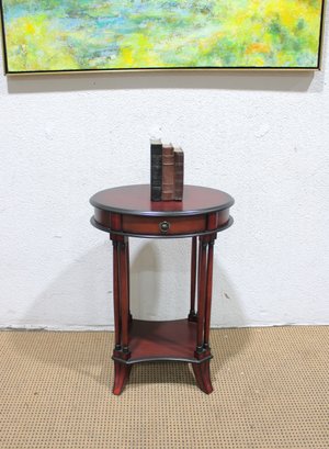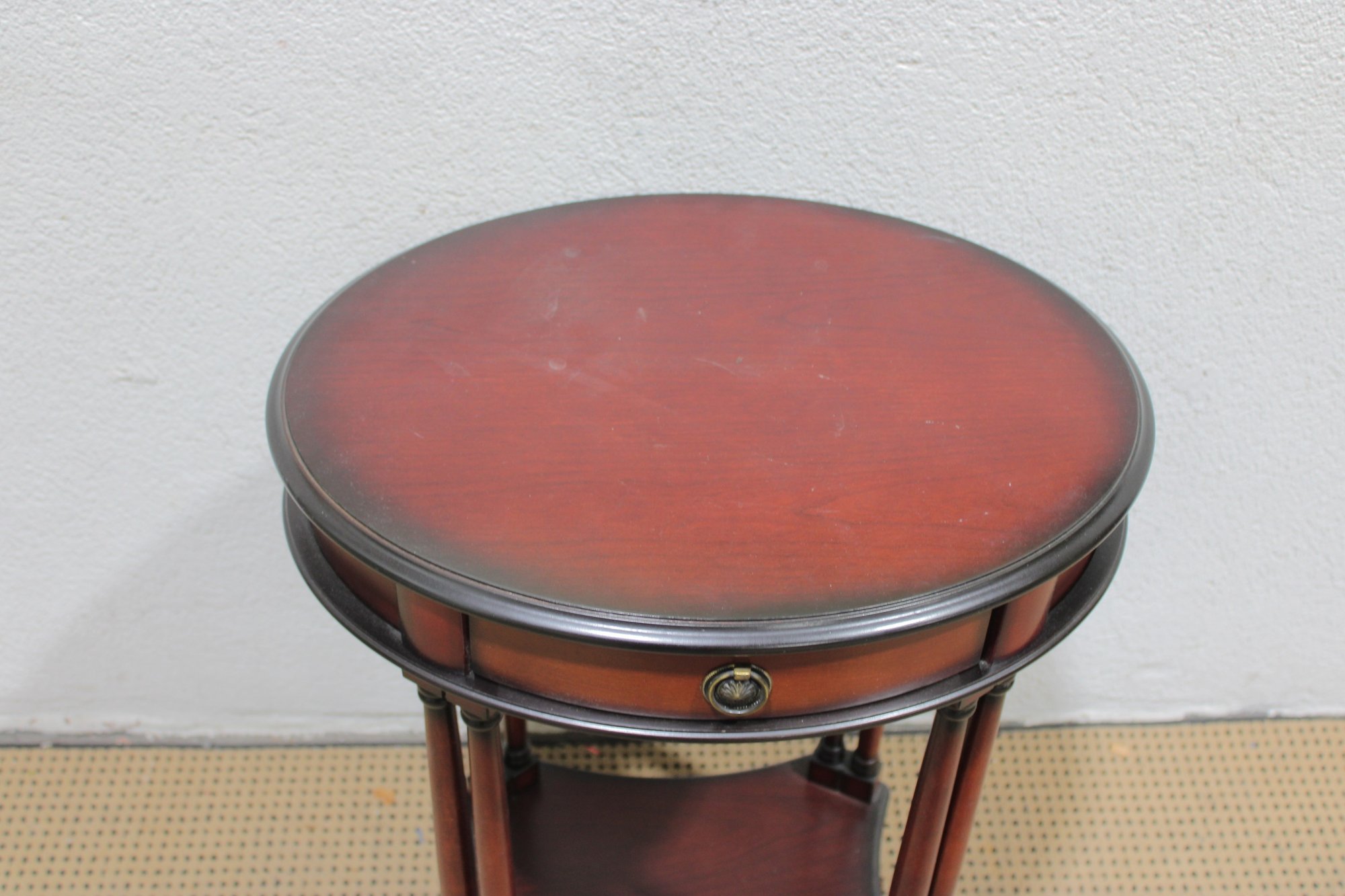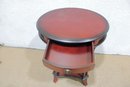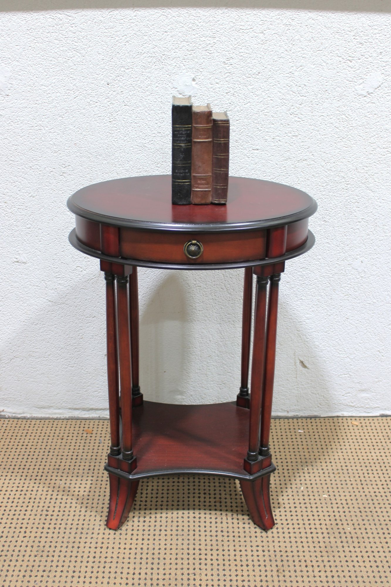 Finished in a rich red mahogany tone with darker trim accents, this table features a classic round top and graceful vertical supports that give it a refined, traditional look. A single pull-out drawer provides convenient storage for small essentials like remotes, glasses, or personal items, while the lower shelf offers additional space for display or storage.