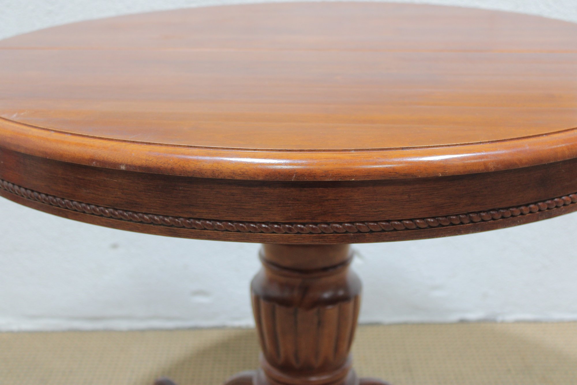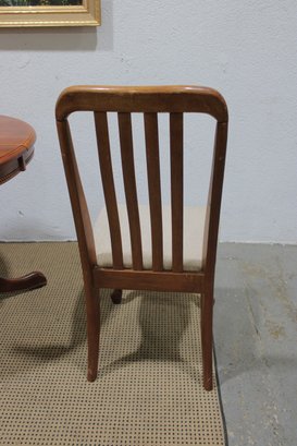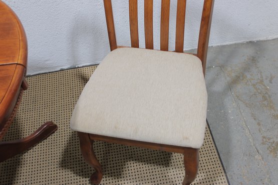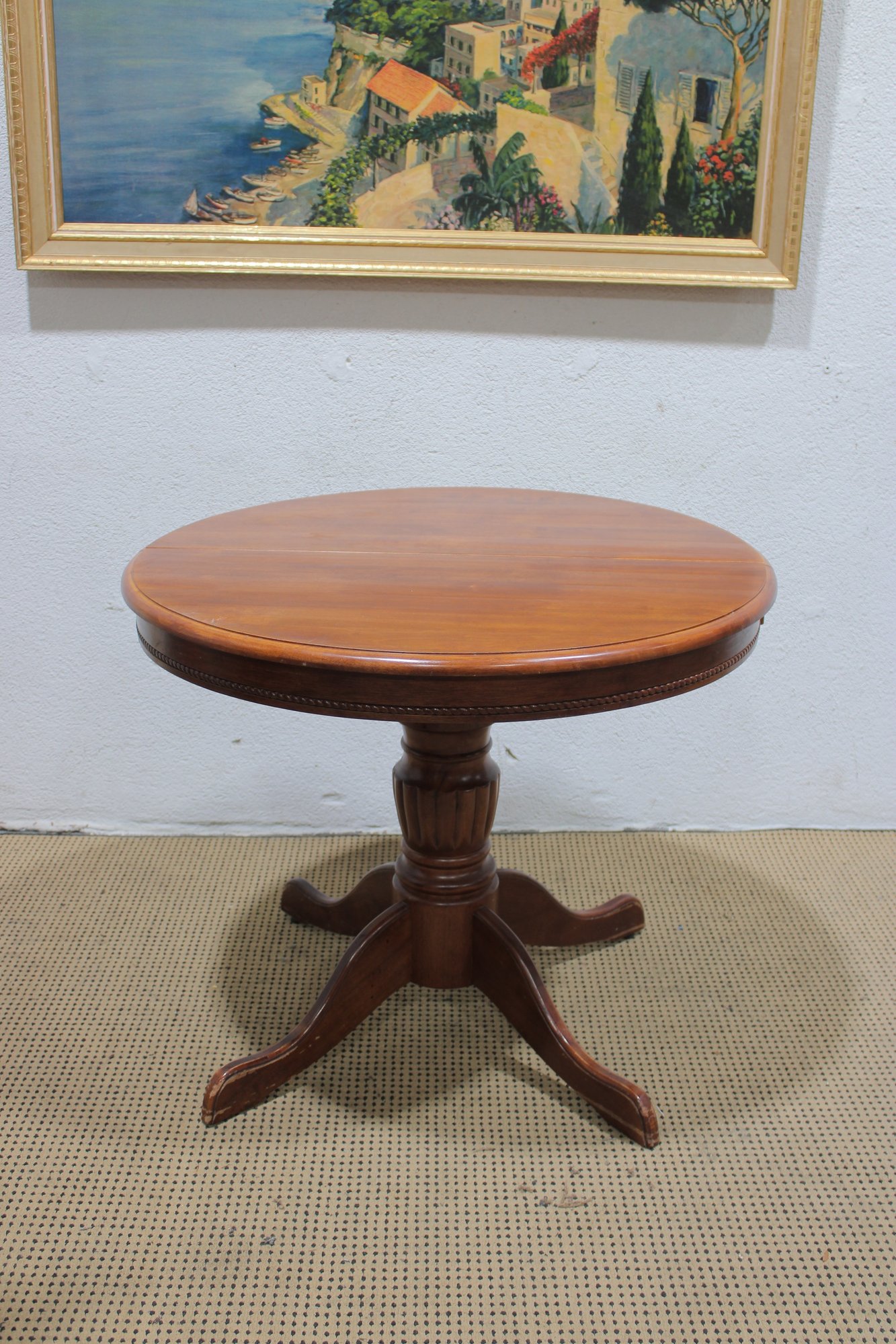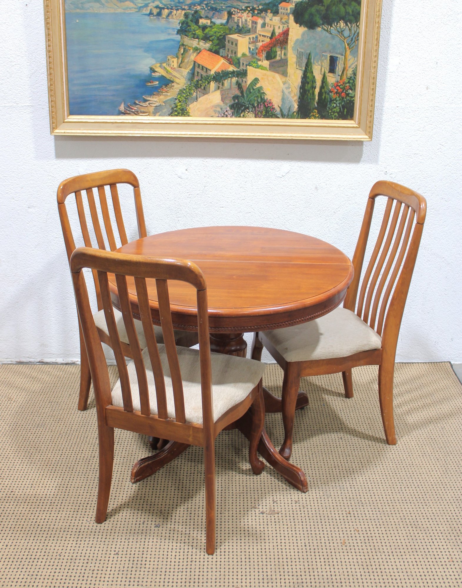 Charming round pedestal dining table with built-in extension leaves, offered together with three coordinating chairs. This versatile set is ideal for smaller dining spaces, breakfast nooks, or apartments where flexibility is key.