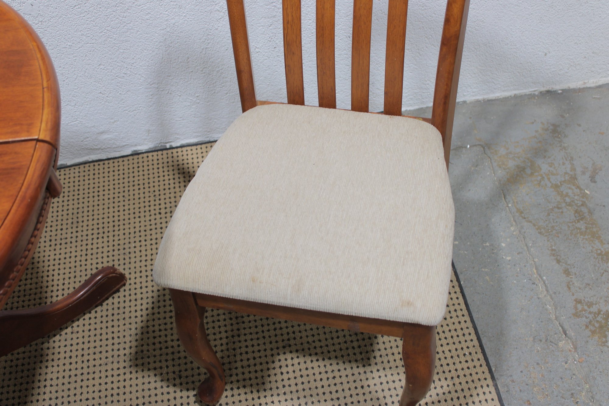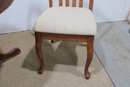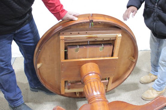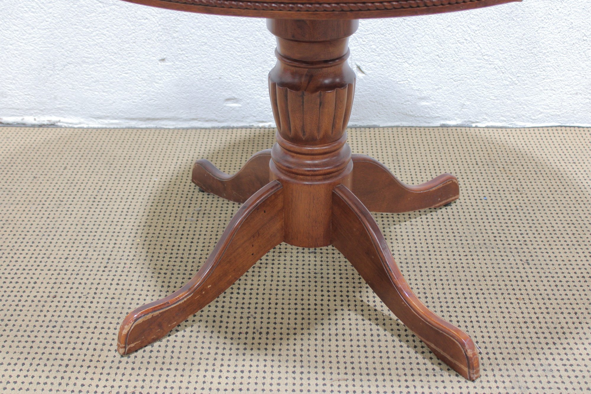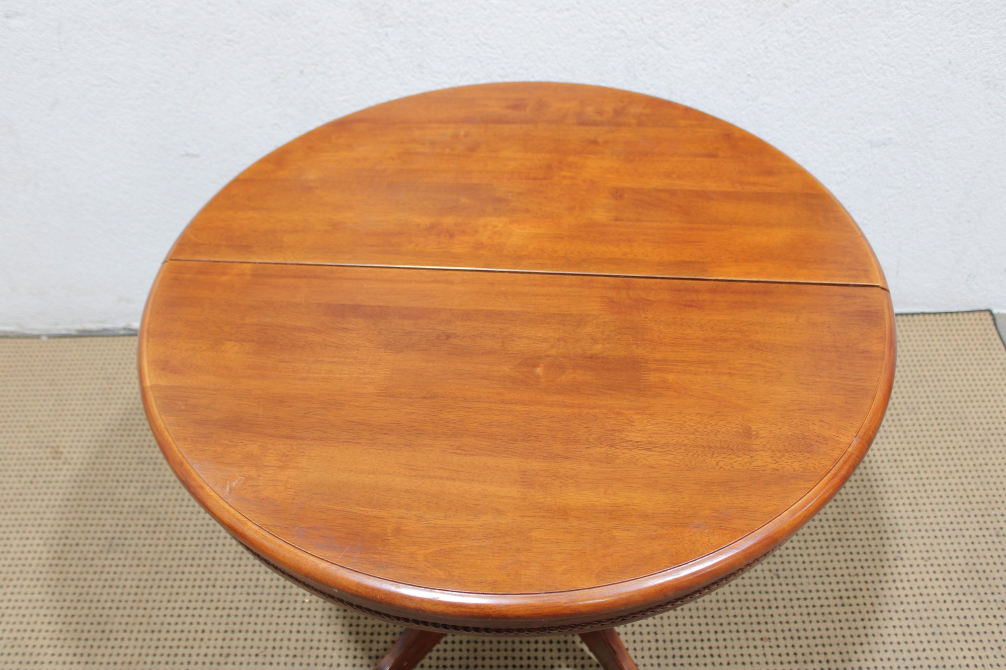 Charming round pedestal dining table with built-in extension leaves, offered together with three coordinating chairs. This versatile set is ideal for smaller dining spaces, breakfast nooks, or apartments where flexibility is key.