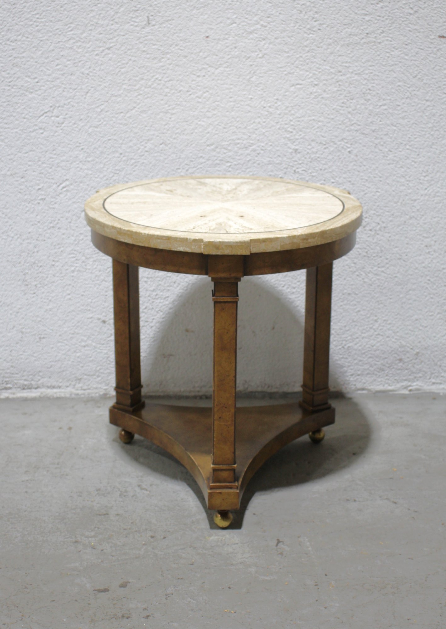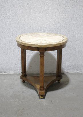 This sophisticated round side table combines a classic wood frame with a beautiful marble inset top, making it a versatile and stylish addition to any room. The table features a sturdy triangular base and solid legs with simple, elegant detailing that complements the natural texture of the marble top. The marble inset has a lovely radial pattern, adding a touch of refinement to its surface. Perfect for adding a timeless accent to your living space, bedroom, or office
