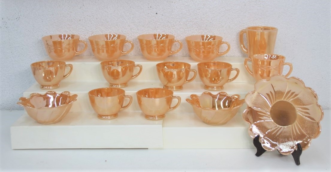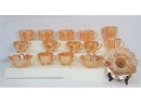 Group Assembly Of High Sheen Peach Iridescent Carnival Glass Cups, Mugs, And Bowls (partial Sets)