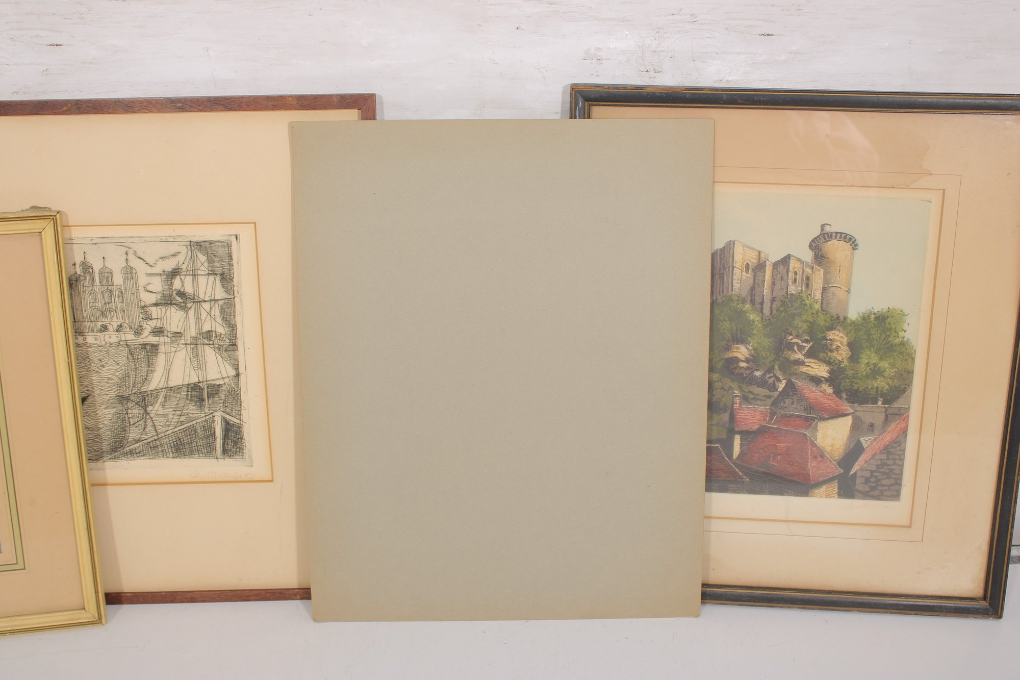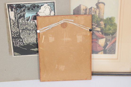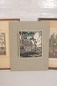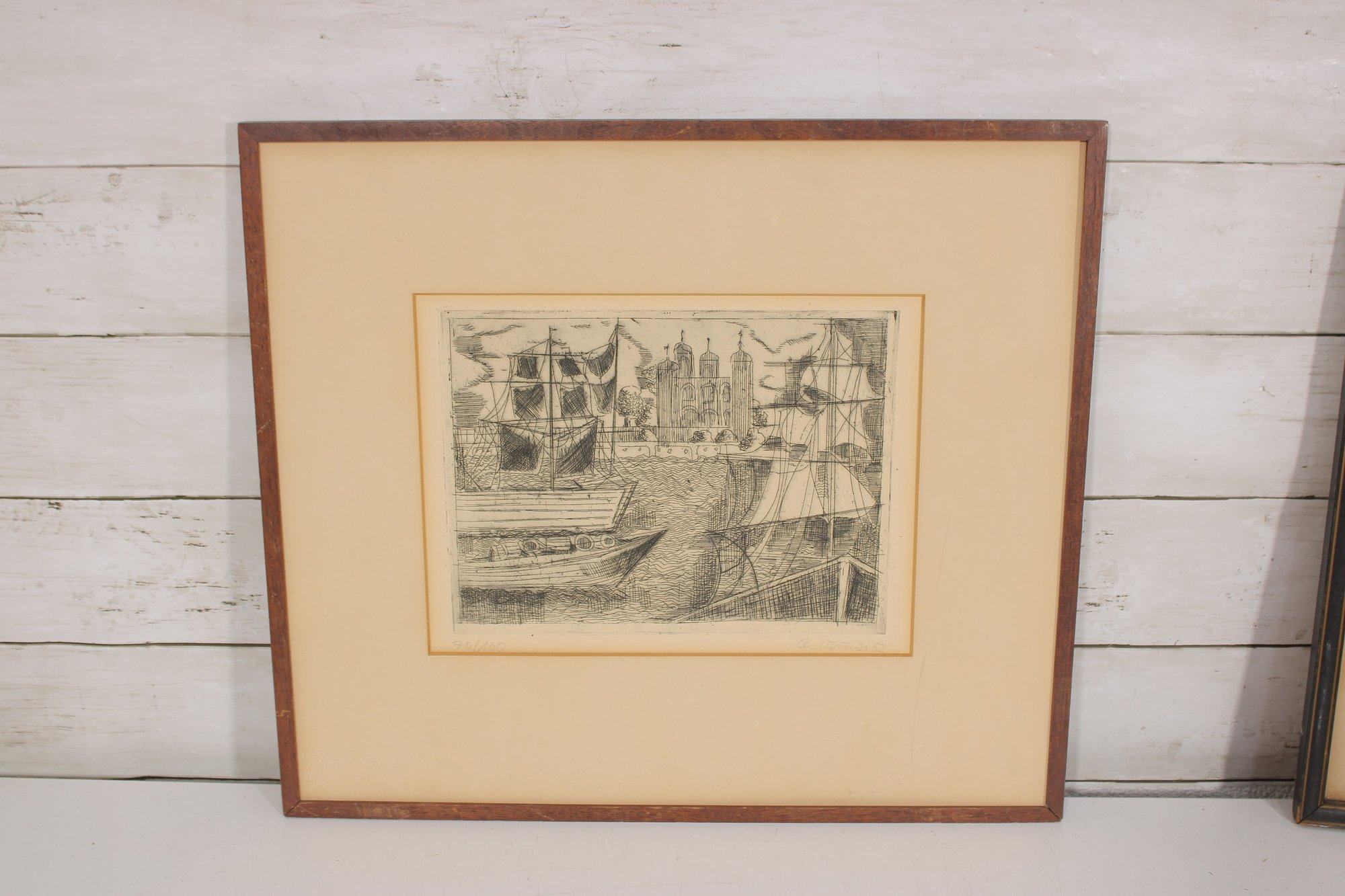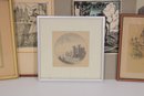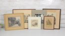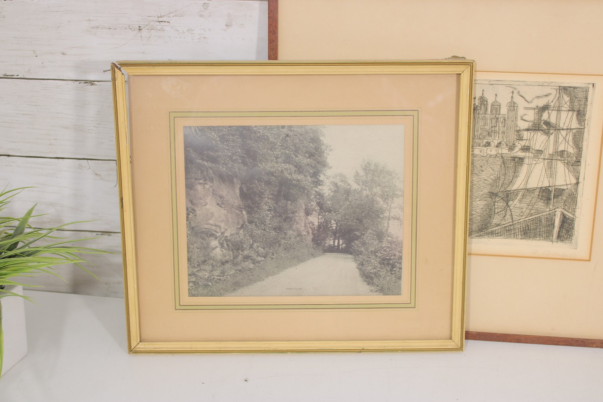 group lot of framed vintage prints featuring a mix of subjects including landscapes, architectural scenes, and nautical imagery. This collection includes multiple pieces in different sizes and frame styles, showcasing a range of artistic styles from detailed line drawings to softly toned scenic compositions.