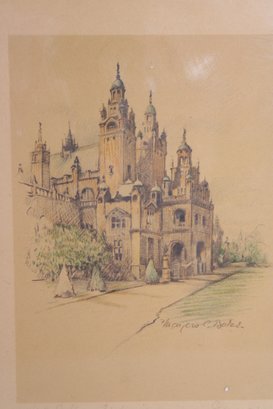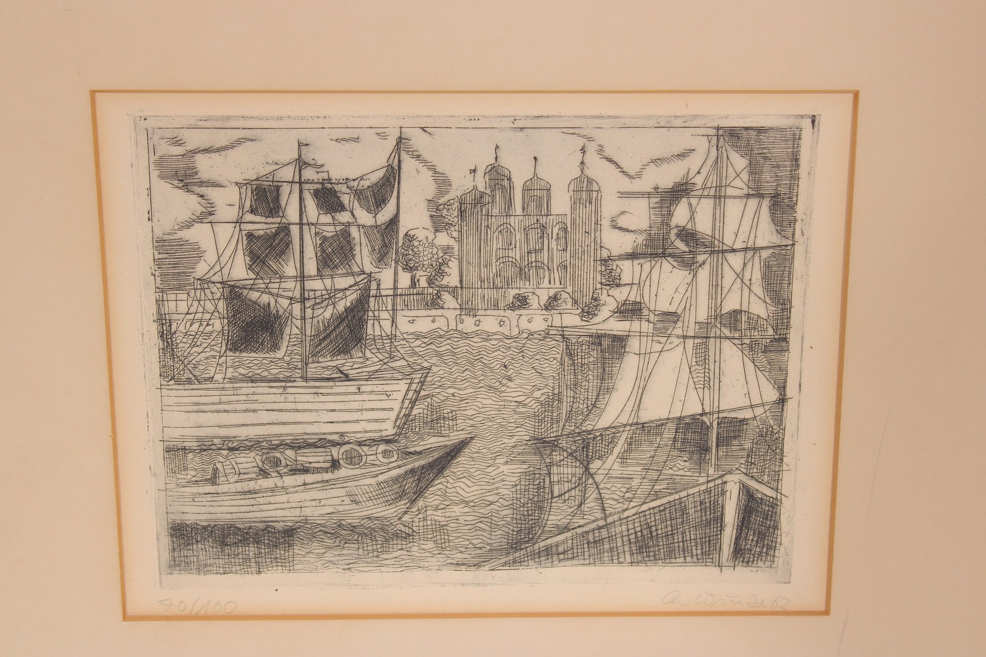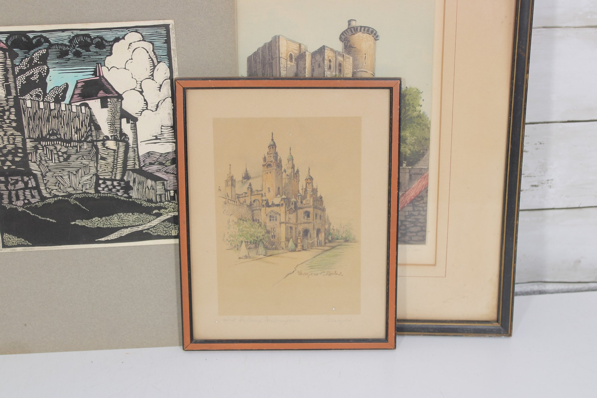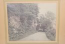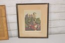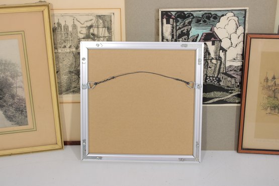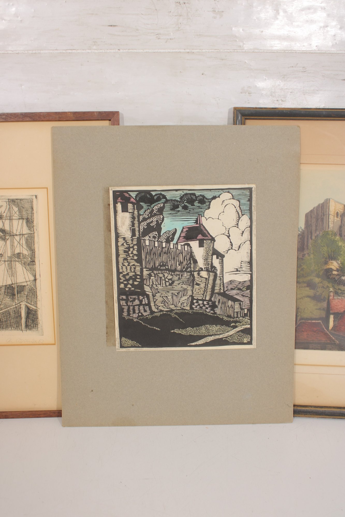 group lot of framed vintage prints featuring a mix of subjects including landscapes, architectural scenes, and nautical imagery. This collection includes multiple pieces in different sizes and frame styles, showcasing a range of artistic styles from detailed line drawings to softly toned scenic compositions.