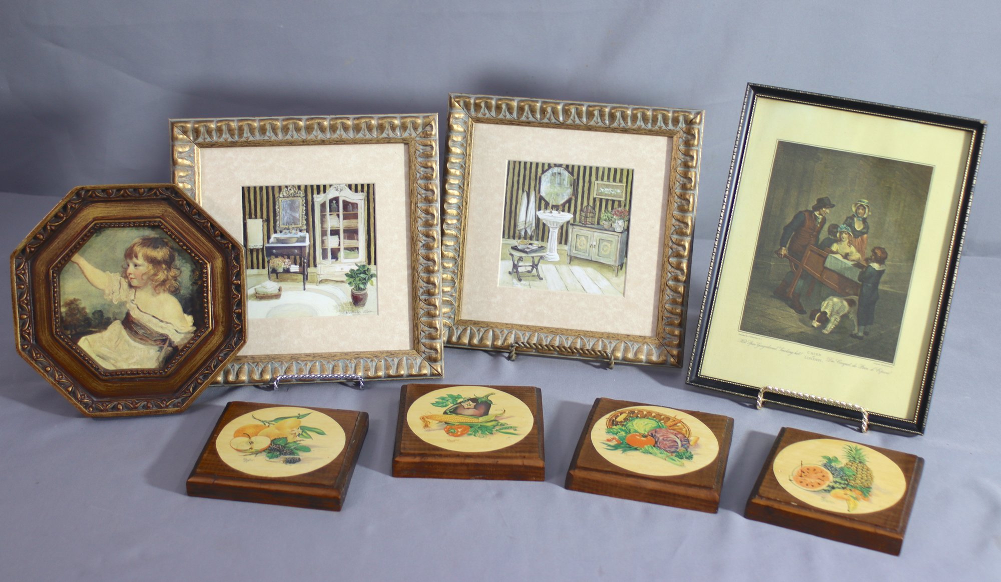 Group Lot Of 4 Frames With Pictures & 4 Decorated Wood Coasters