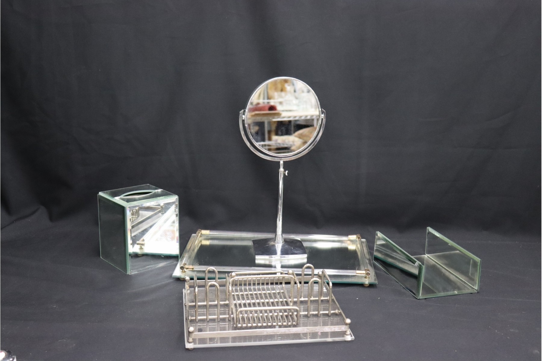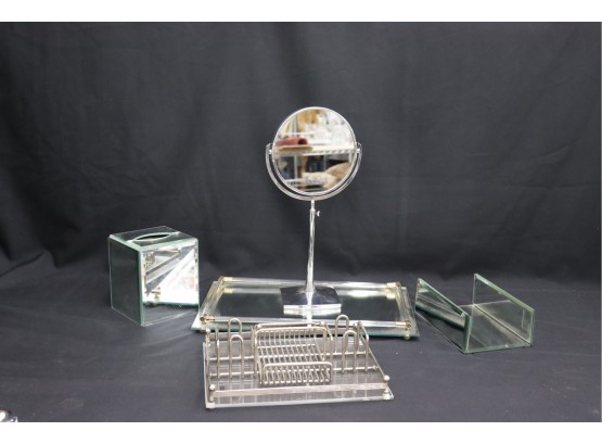 Group Lot Of Chrome, Acrylic, And Mirrored Trays, Mirror, Tissue Box Cover Etc