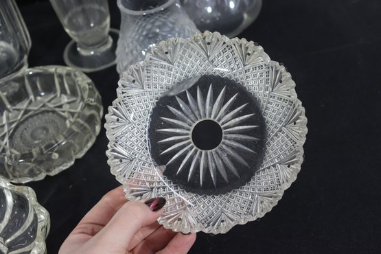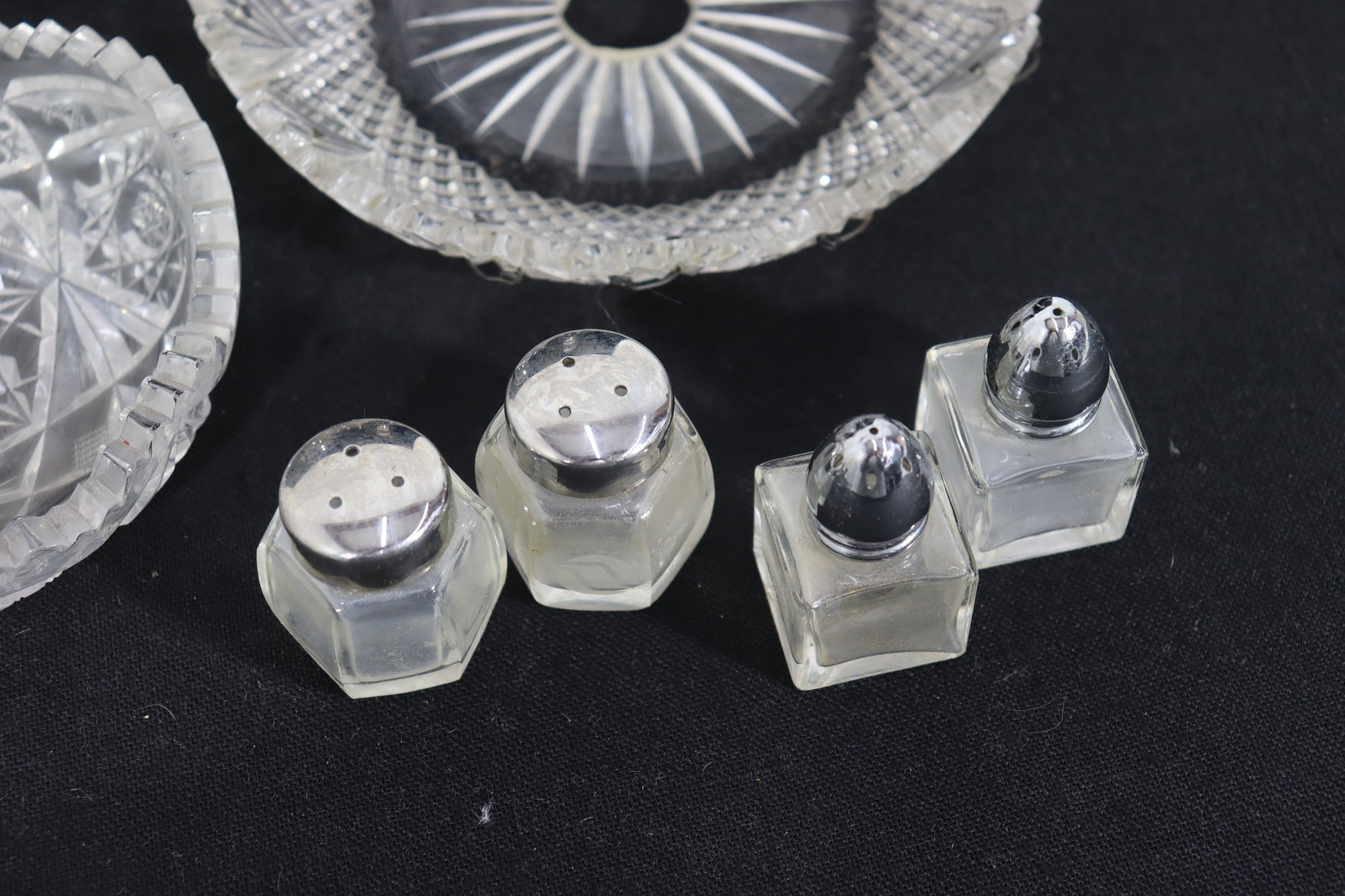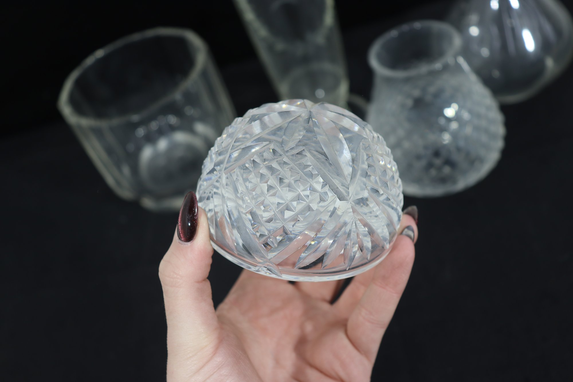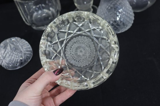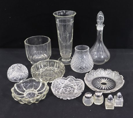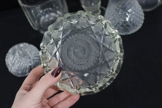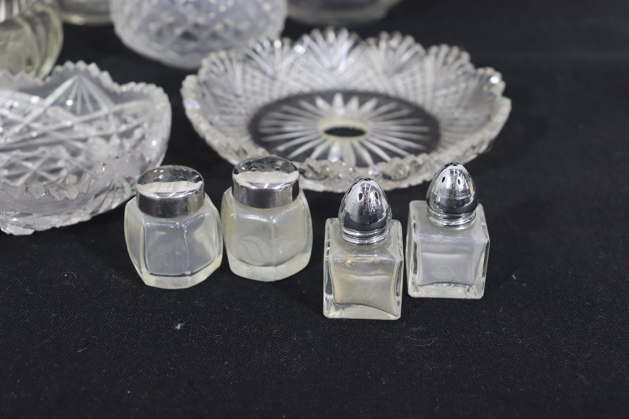 an attractive group lot of decorative glass, featuring a mix of cut and pressed glass pieces in assorted shapes and patterns. The lot includes bowls, small vases, a decanter, salt and pepper shakers, and other decorative glass items, all sold together as one group.