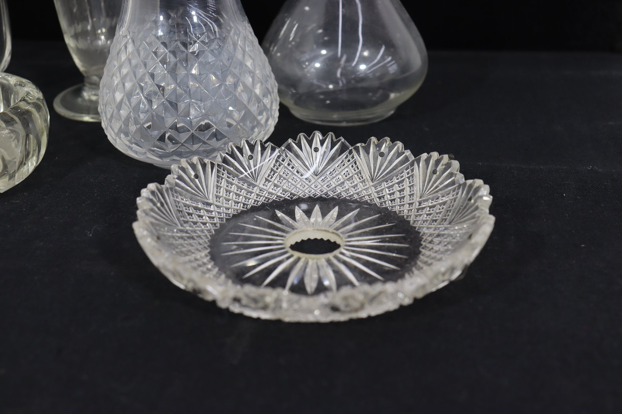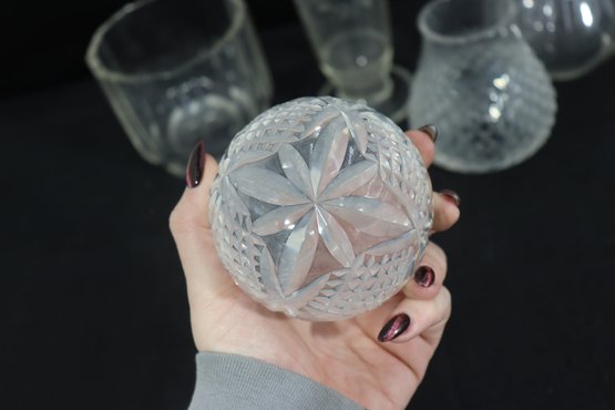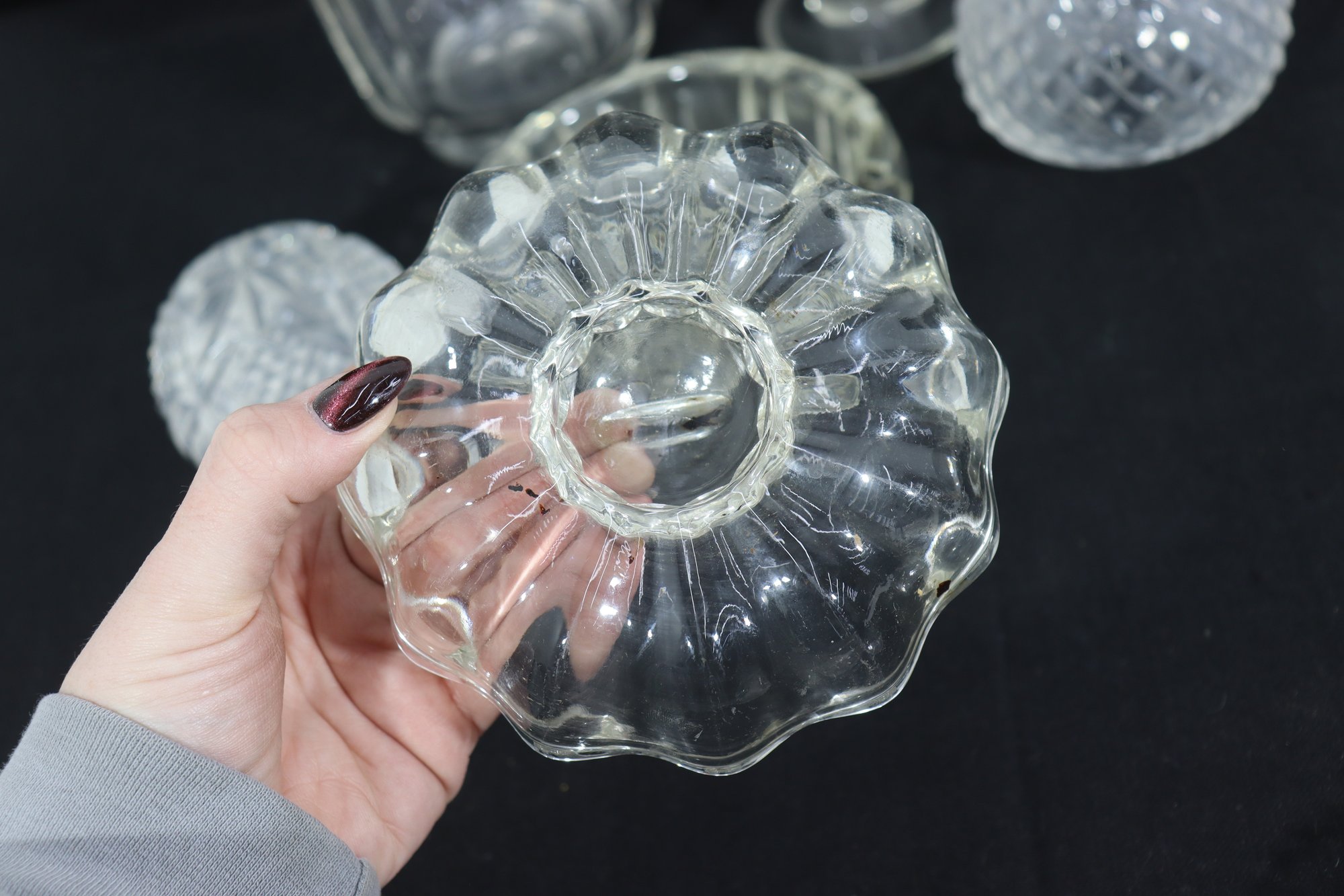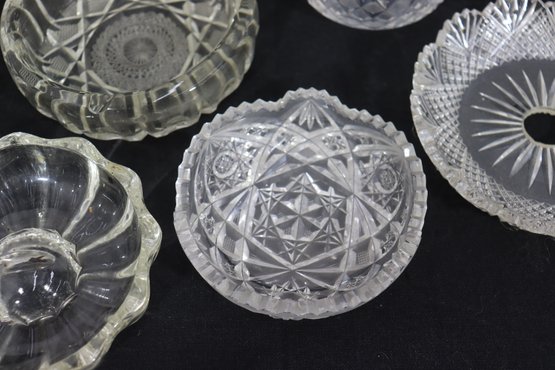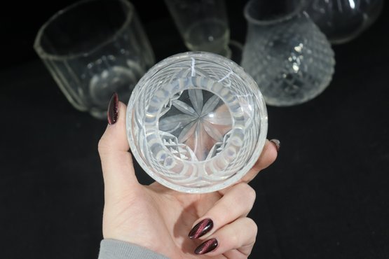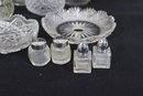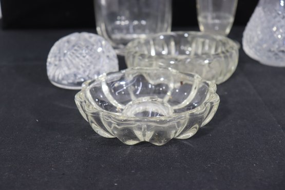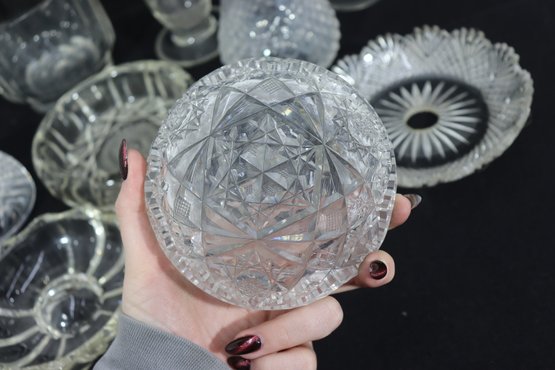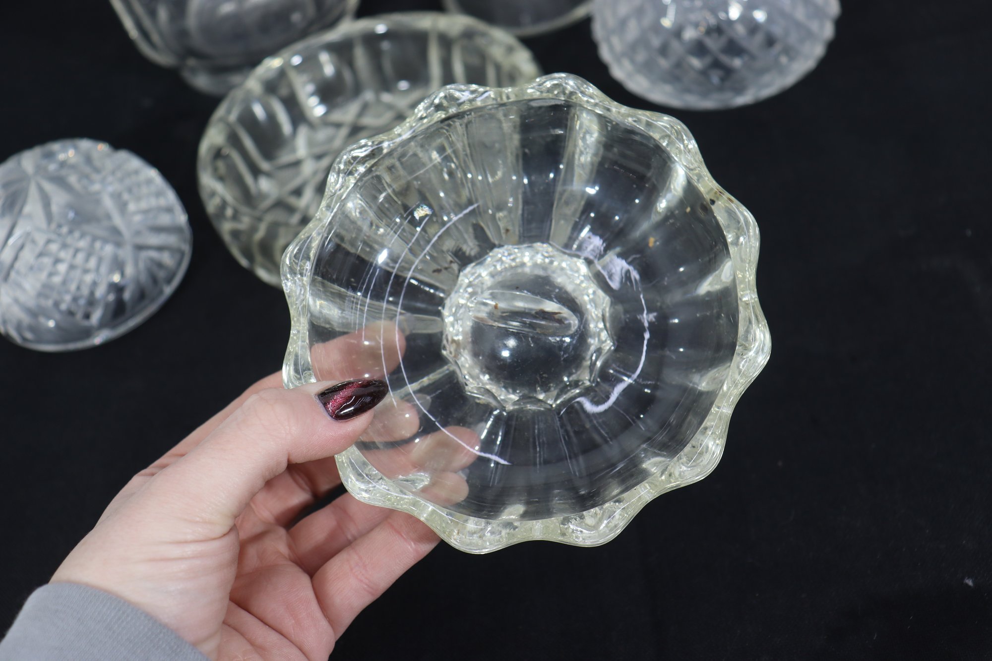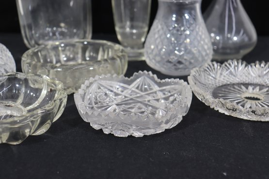an attractive group lot of decorative glass, featuring a mix of cut and pressed glass pieces in assorted shapes and patterns. The lot includes bowls, small vases, a decanter, salt and pepper shakers, and other decorative glass items, all sold together as one group.