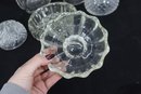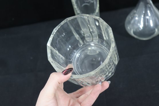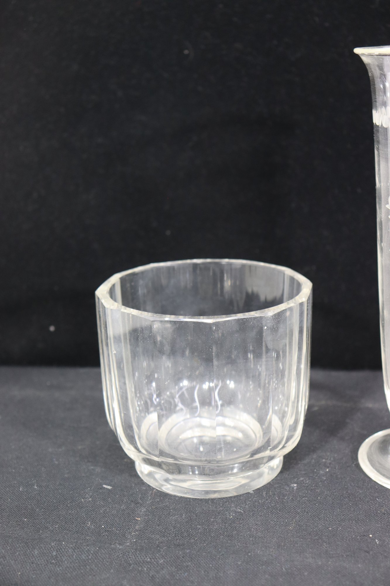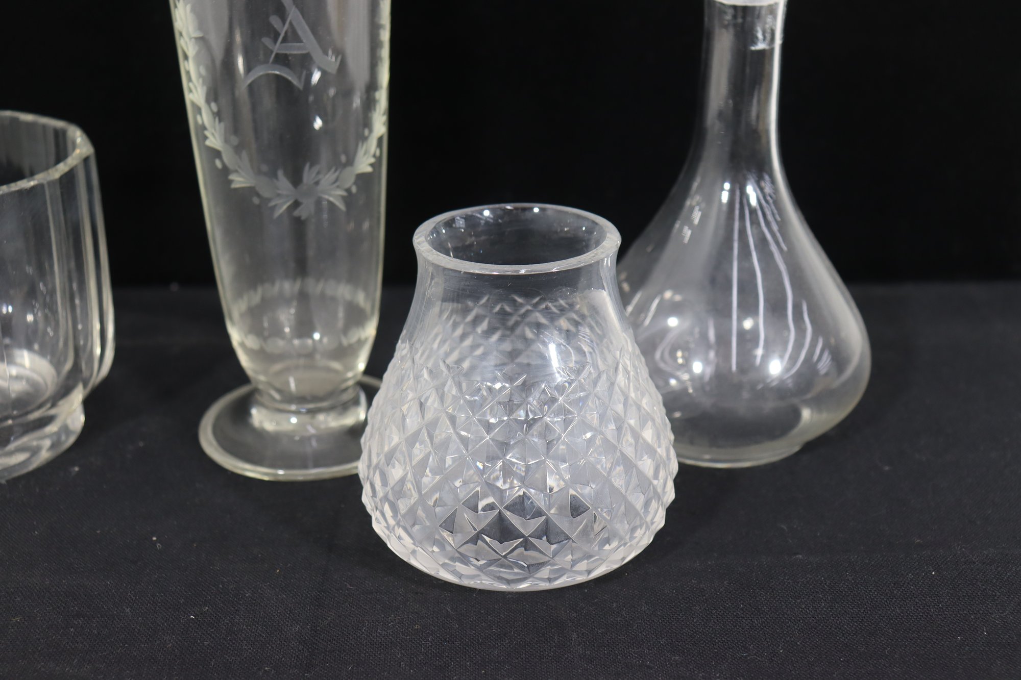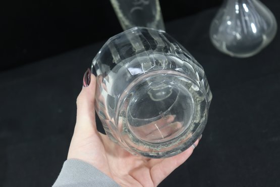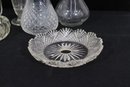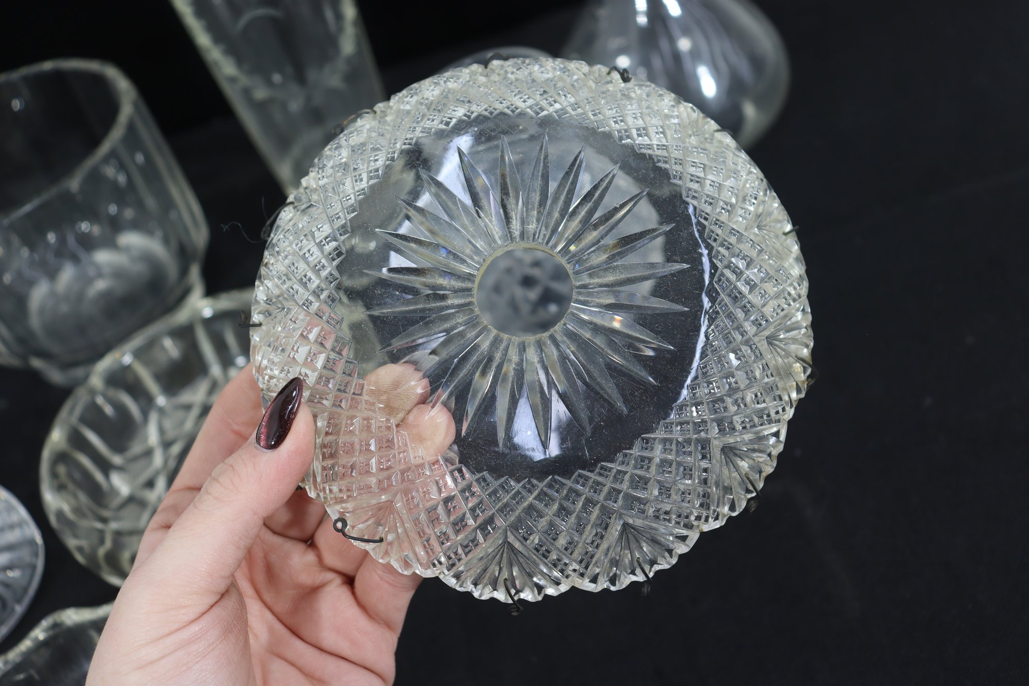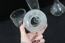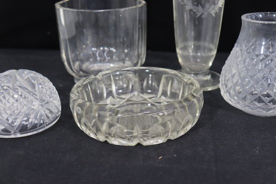 an attractive group lot of decorative glass, featuring a mix of cut and pressed glass pieces in assorted shapes and patterns. The lot includes bowls, small vases, a decanter, salt and pepper shakers, and other decorative glass items, all sold together as one group.