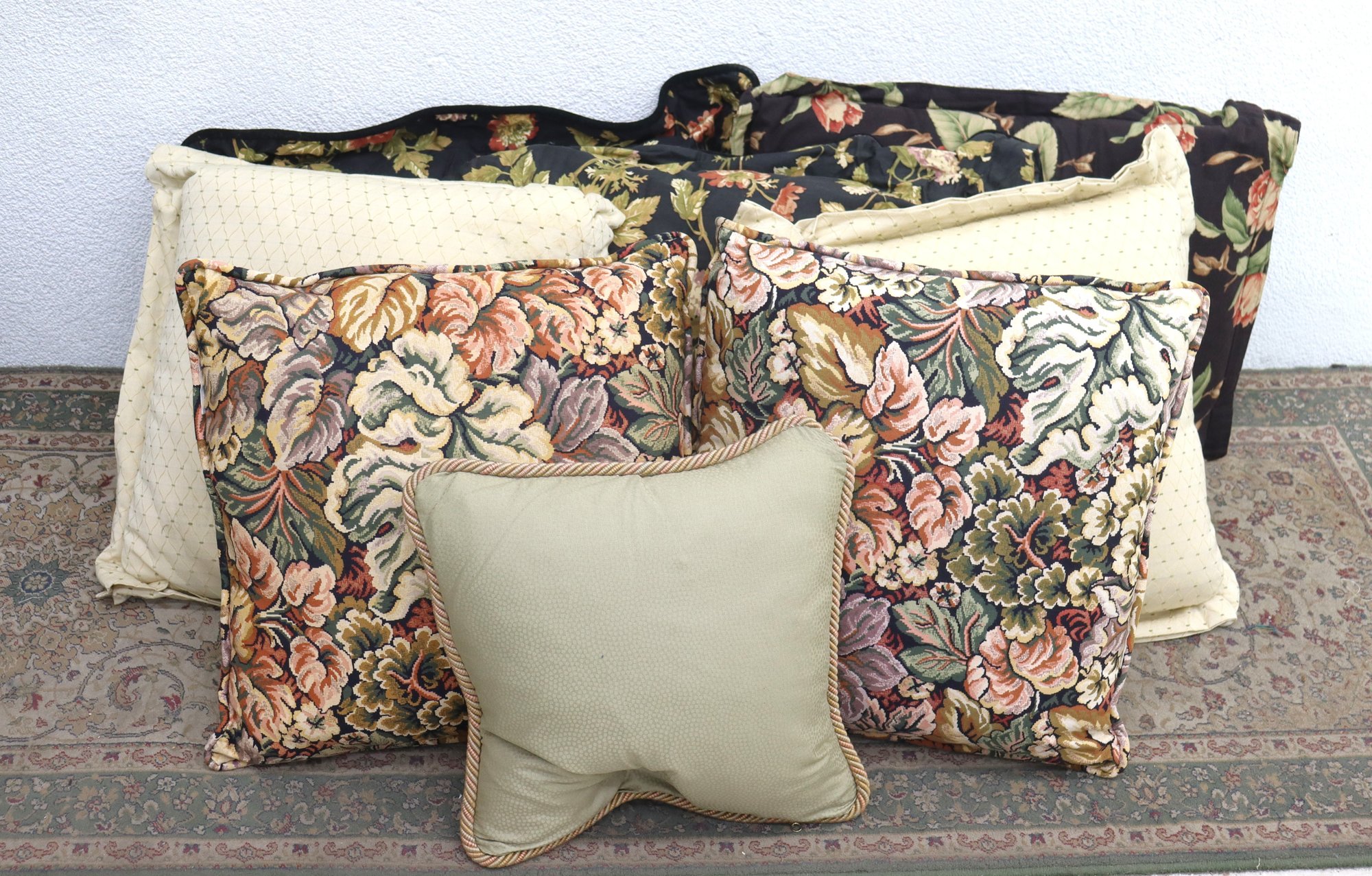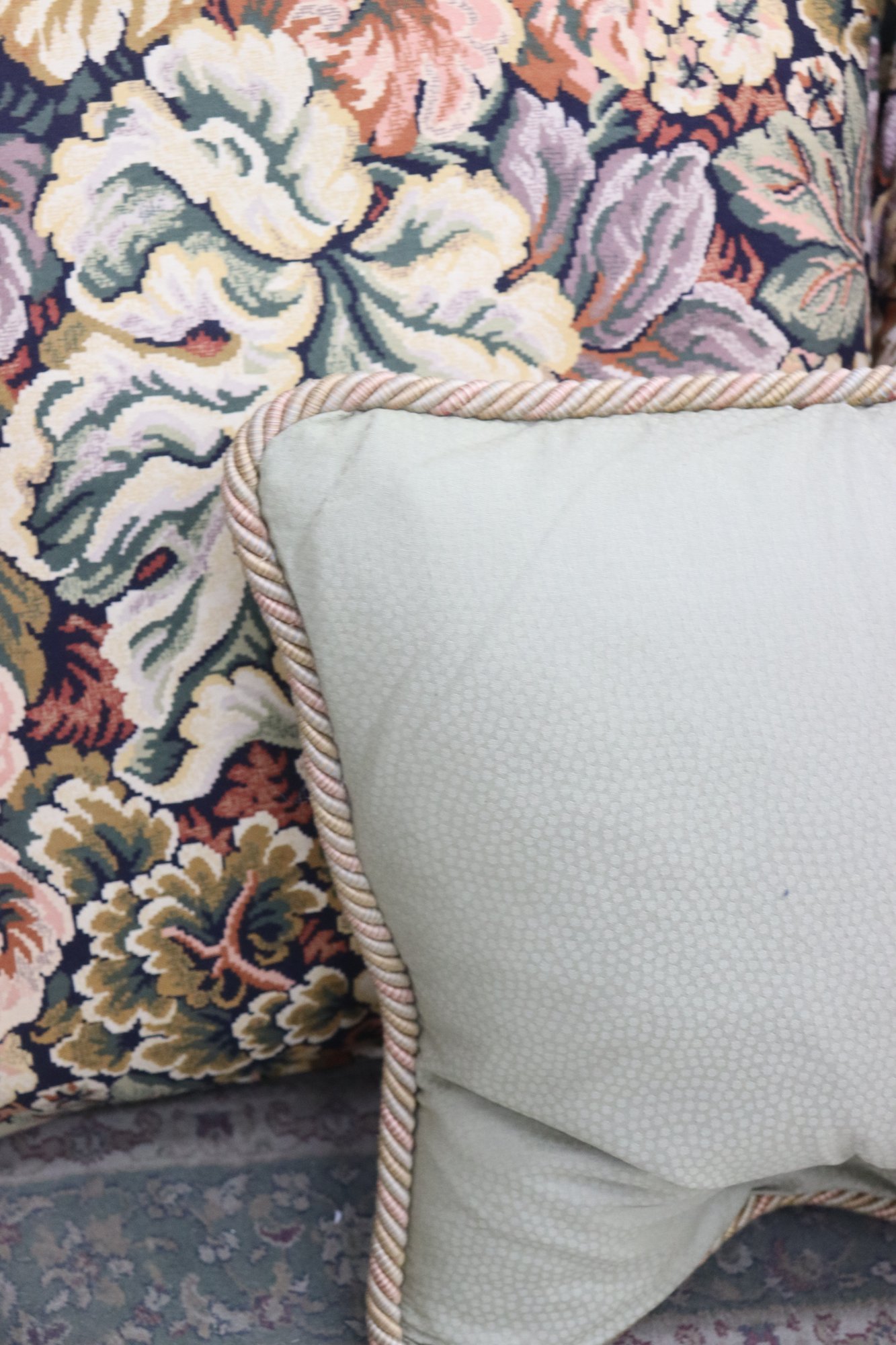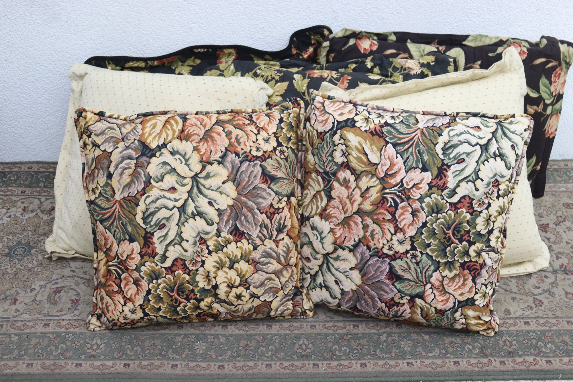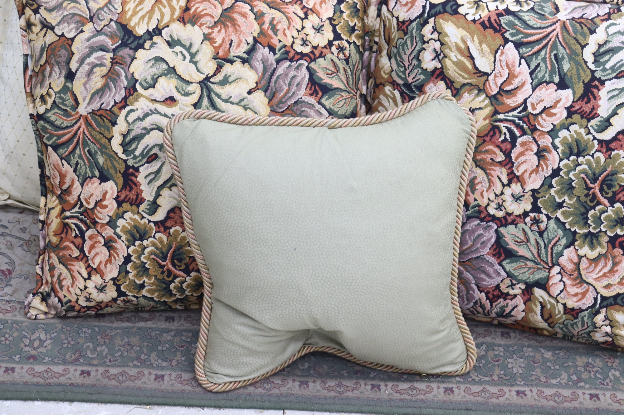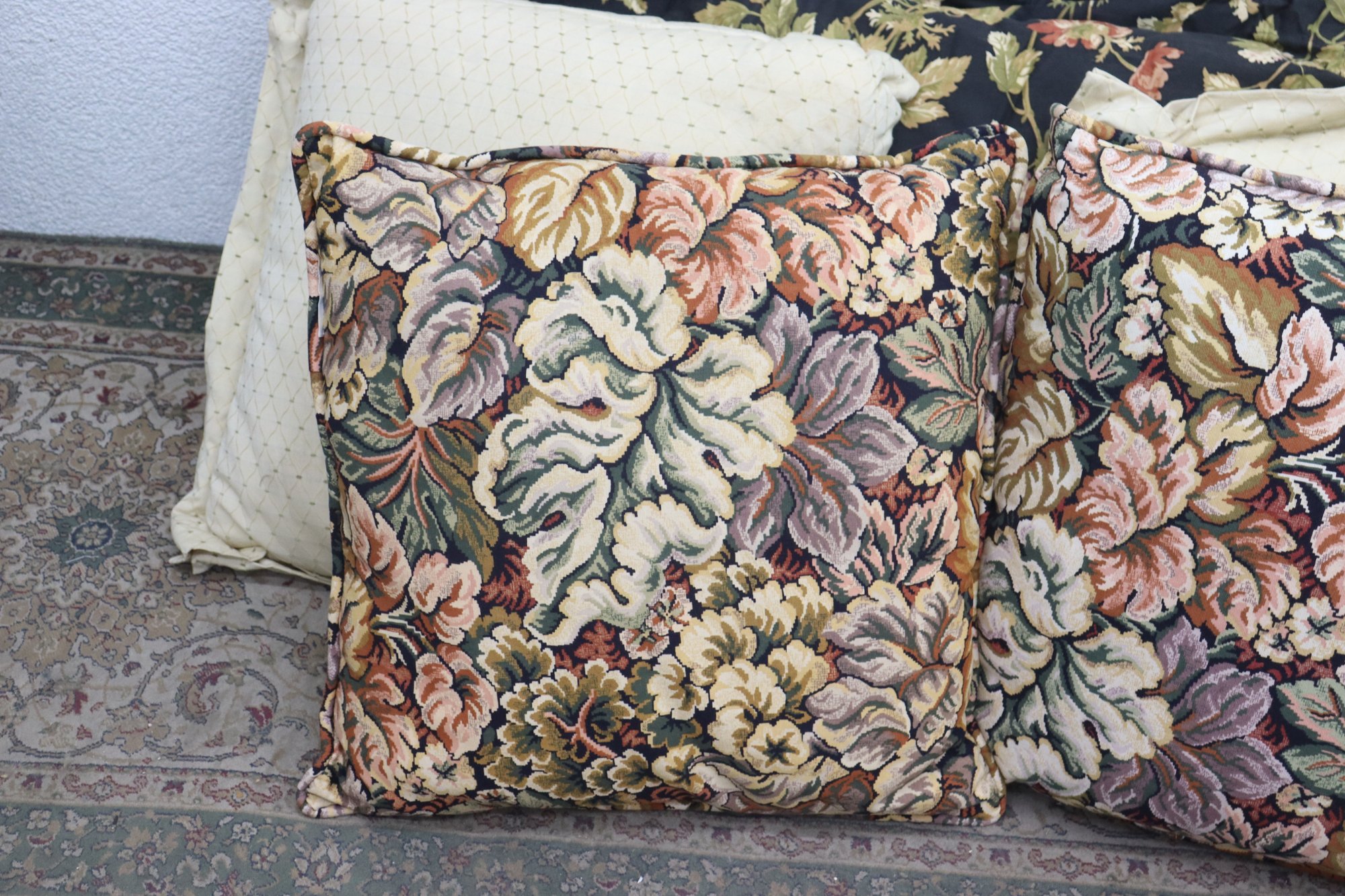 a group lot of decorative throw pillows, sold together as one set. This collection includes a mix of floral tapestry-style pillows, neutral accent pillows, and coordinating patterns, perfect for layering on a sofa, bed, bench, or daybed.