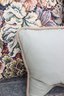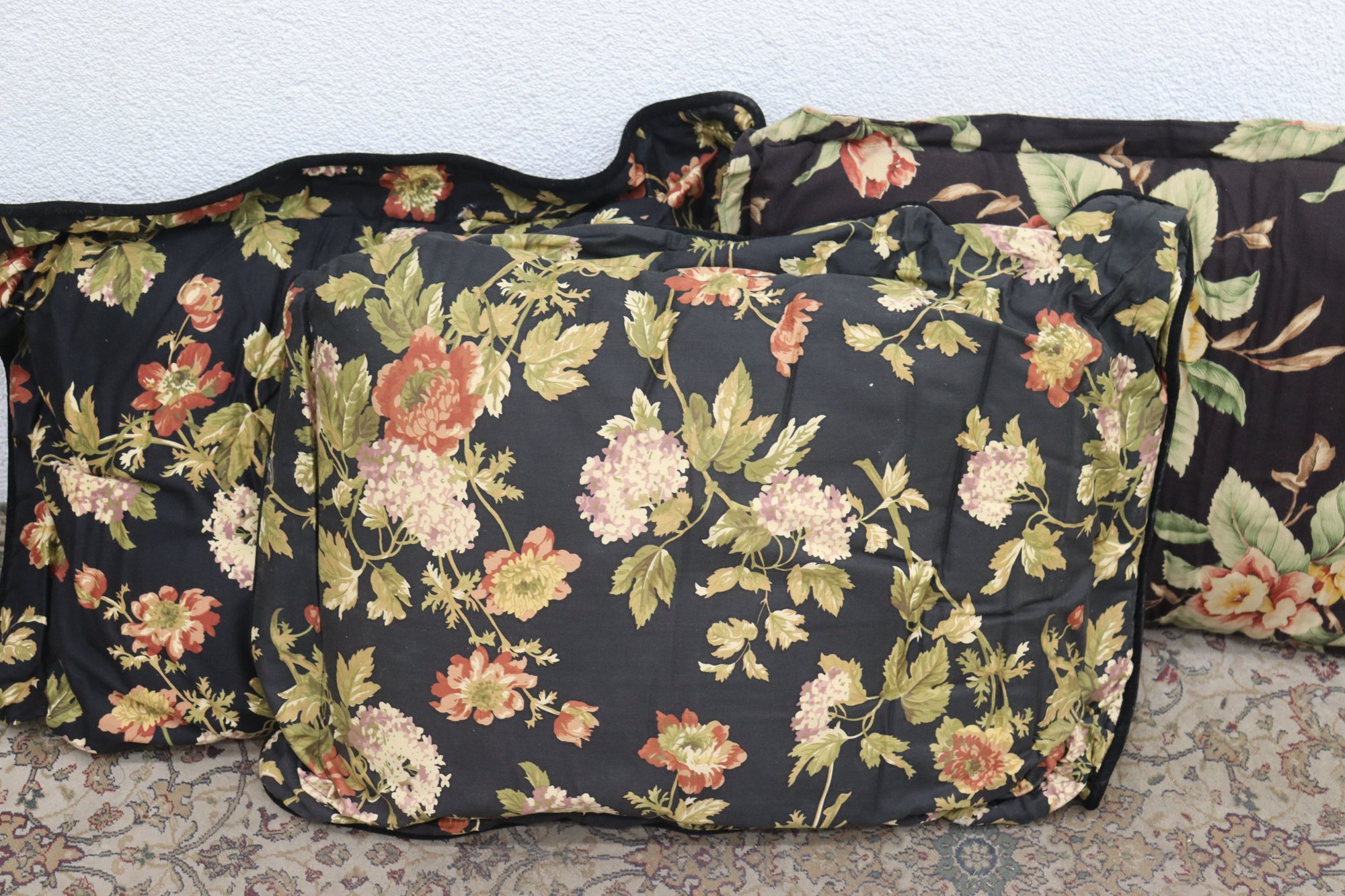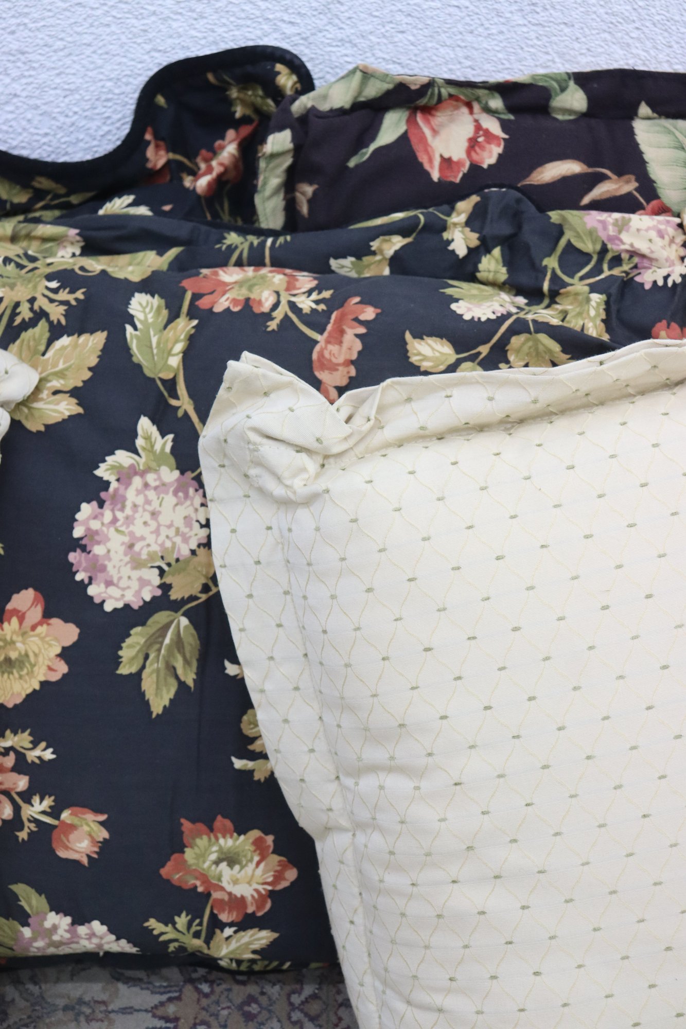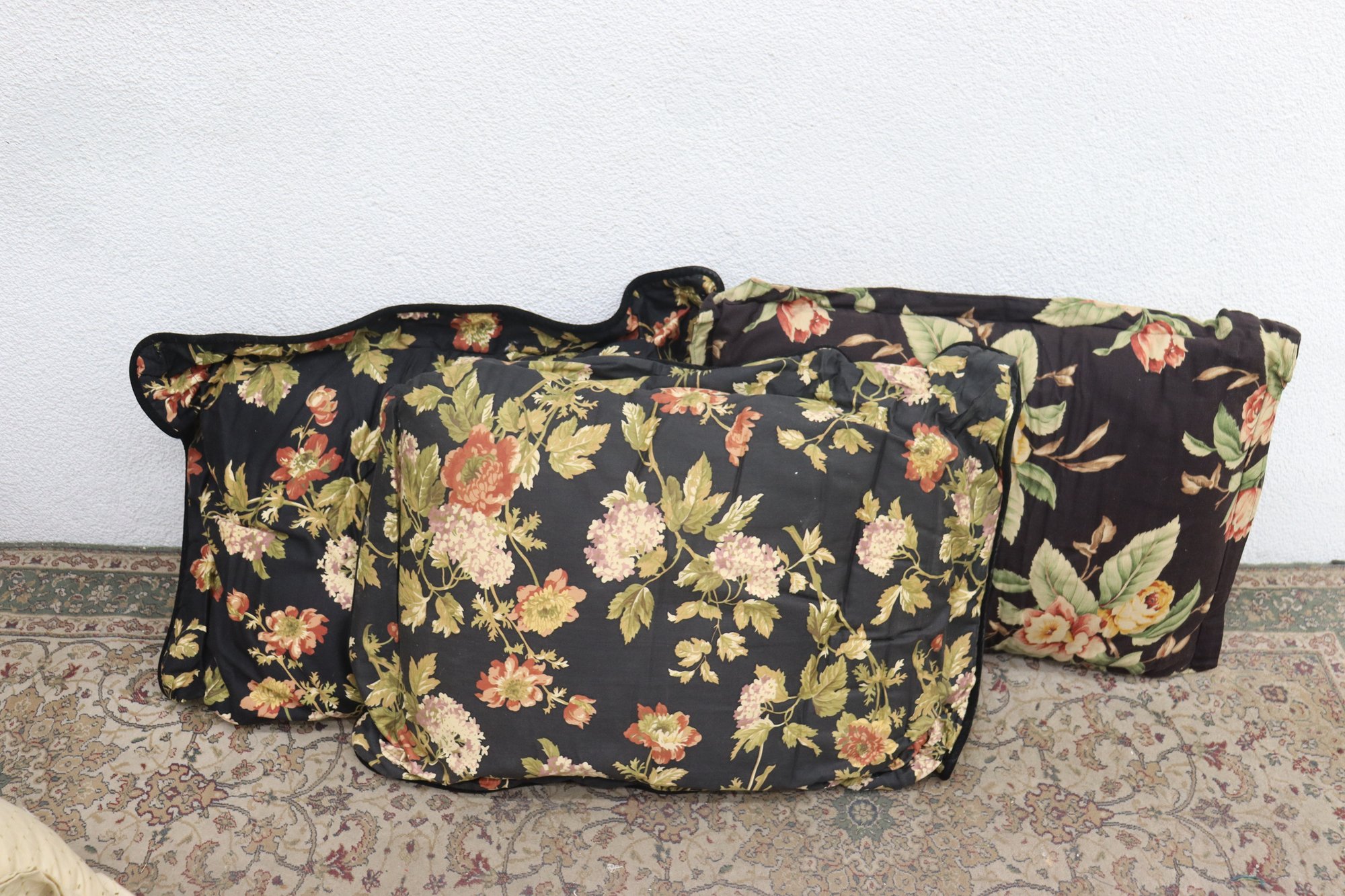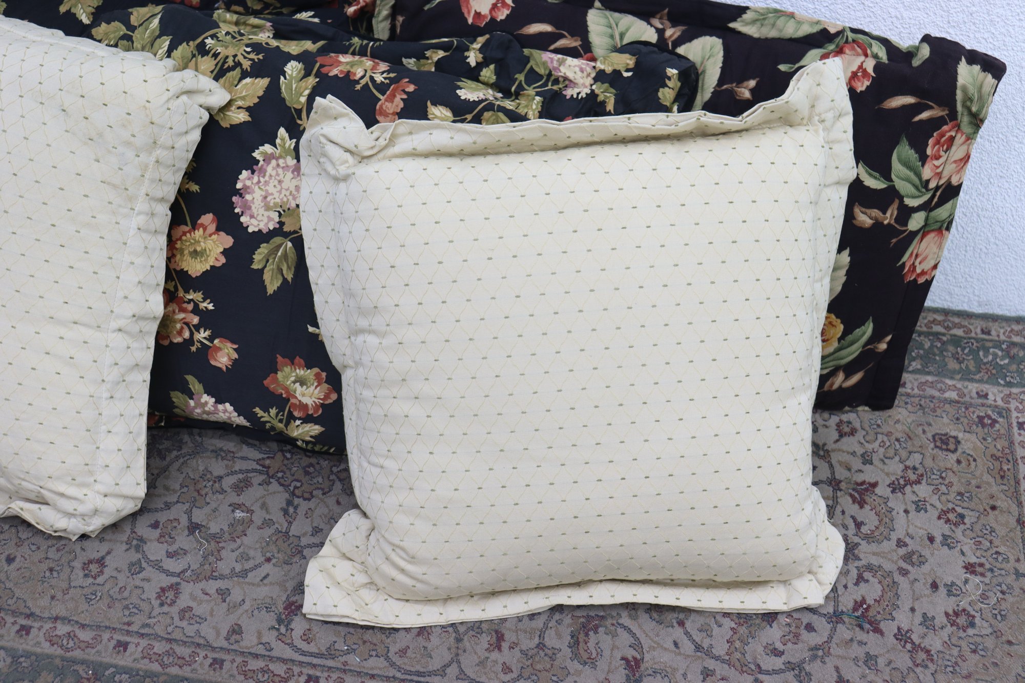 a group lot of decorative throw pillows, sold together as one set. This collection includes a mix of floral tapestry-style pillows, neutral accent pillows, and coordinating patterns, perfect for layering on a sofa, bed, bench, or daybed.