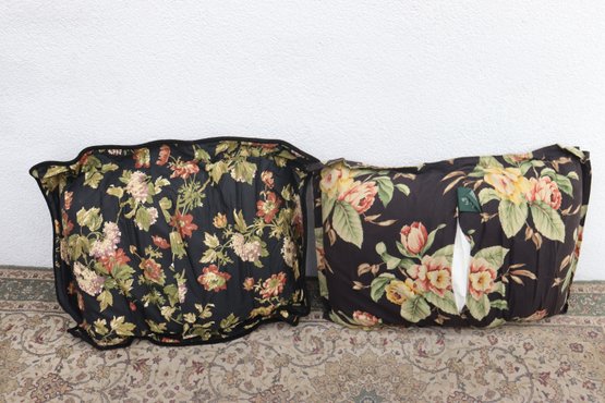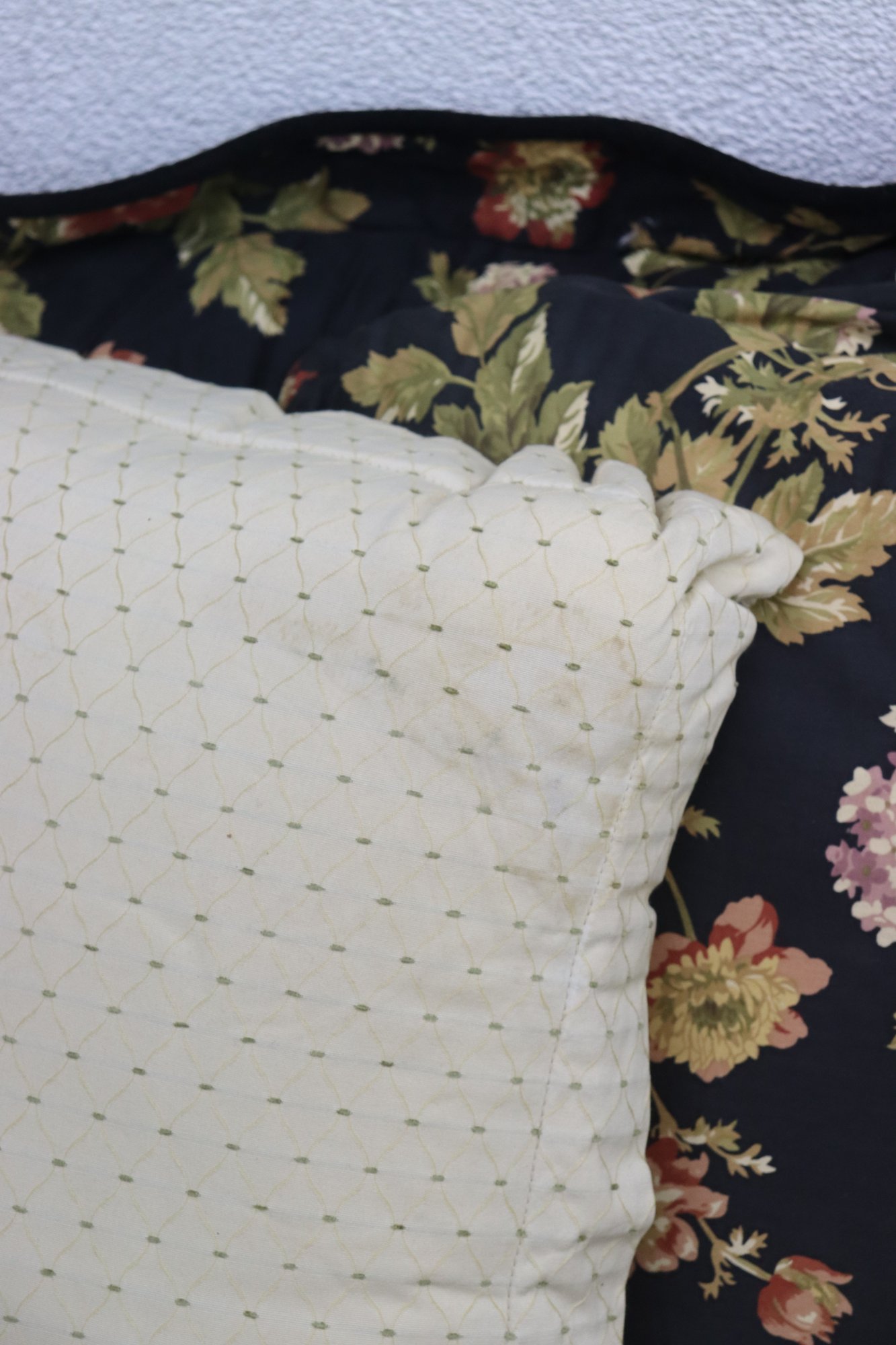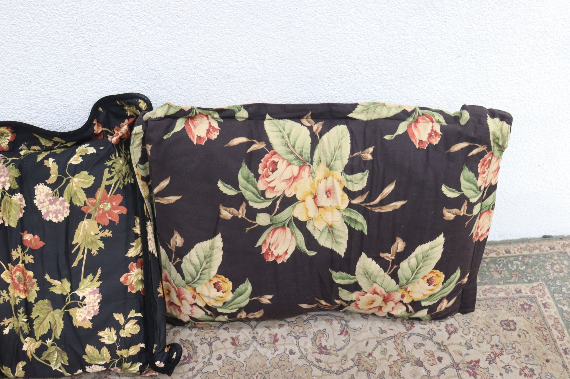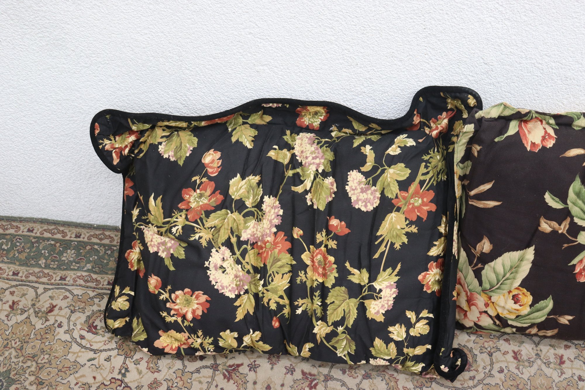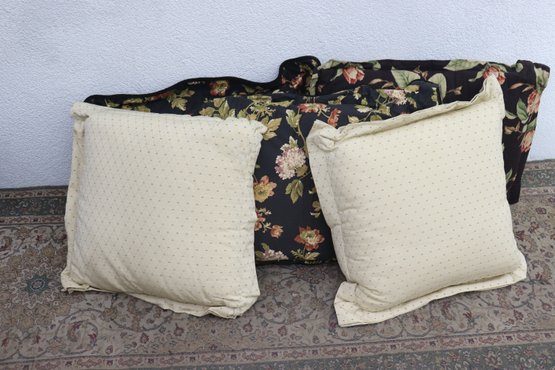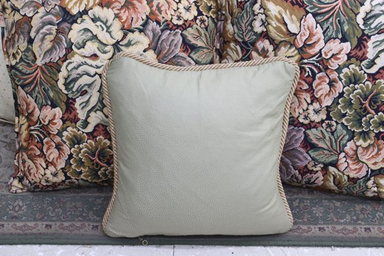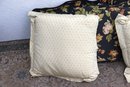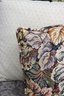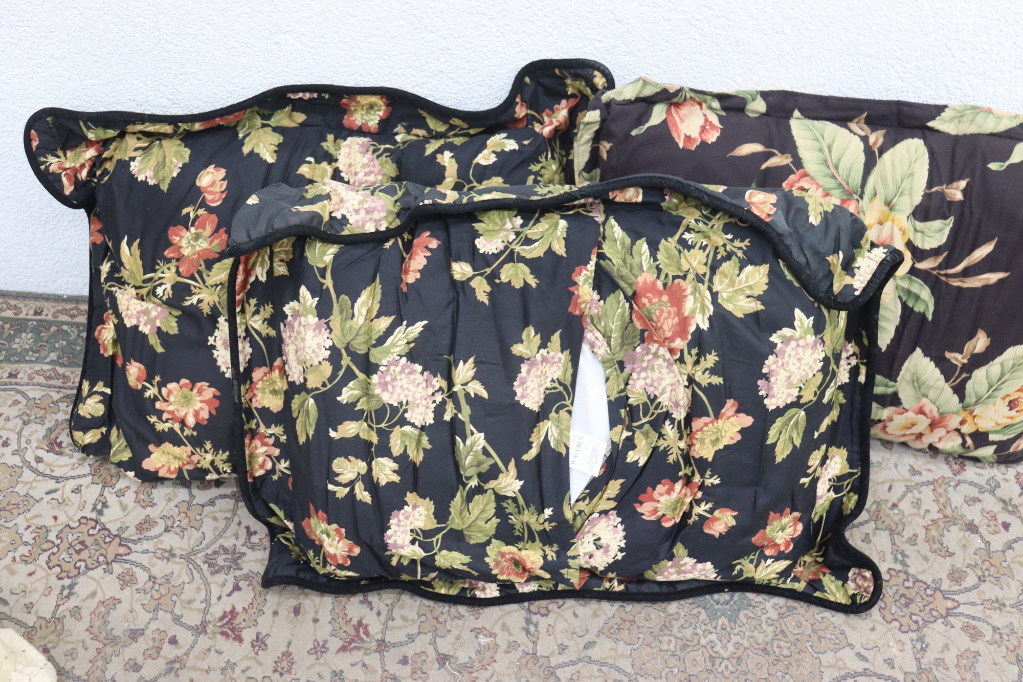 a group lot of decorative throw pillows, sold together as one set. This collection includes a mix of floral tapestry-style pillows, neutral accent pillows, and coordinating patterns, perfect for layering on a sofa, bed, bench, or daybed.
