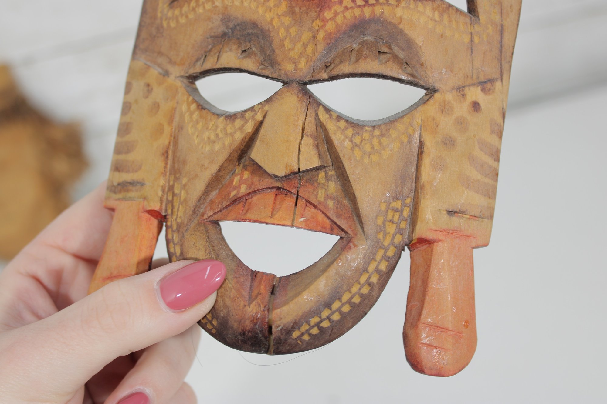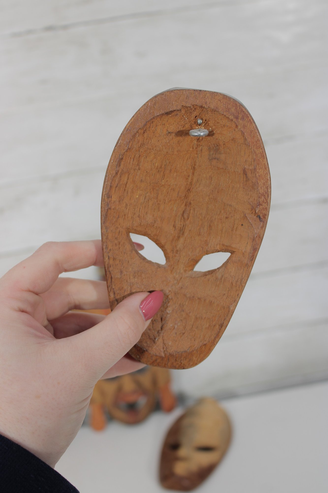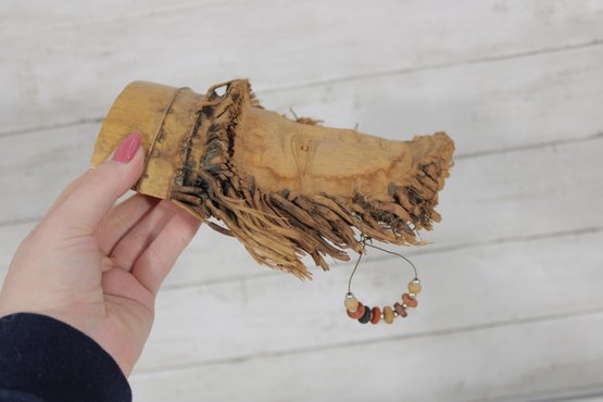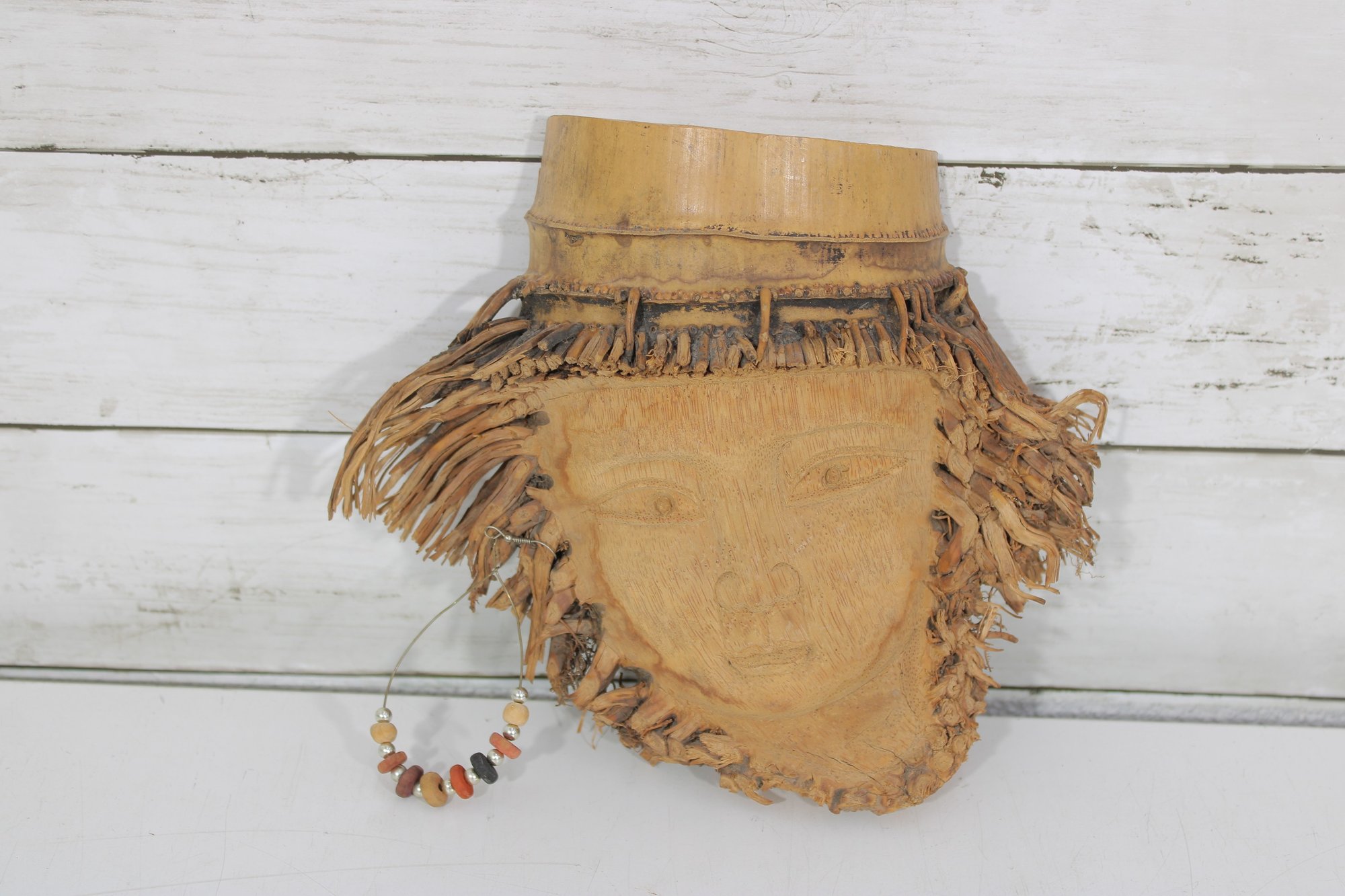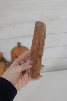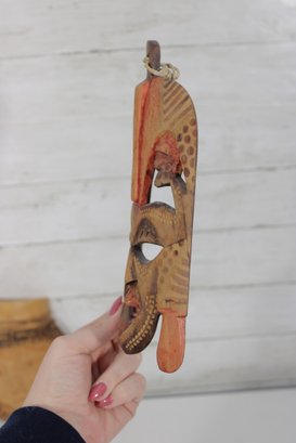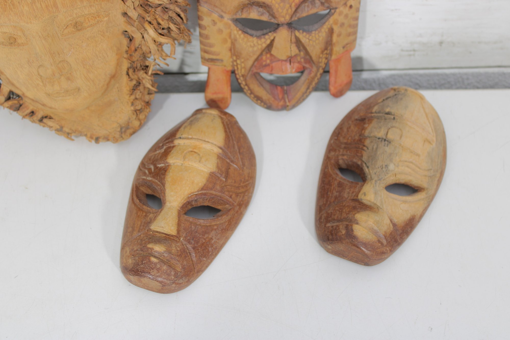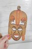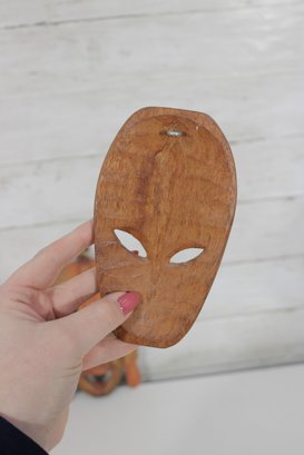 Assorted group lot of hand-carved decorative wall pieces, including three carved masks and one woven or fiber wall hanging with bead accent. The lot features earthy natural tones, carved facial details, and a folk art or tribal-inspired aesthetic that makes it well suited for eclectic decor, wall display, or collecting.