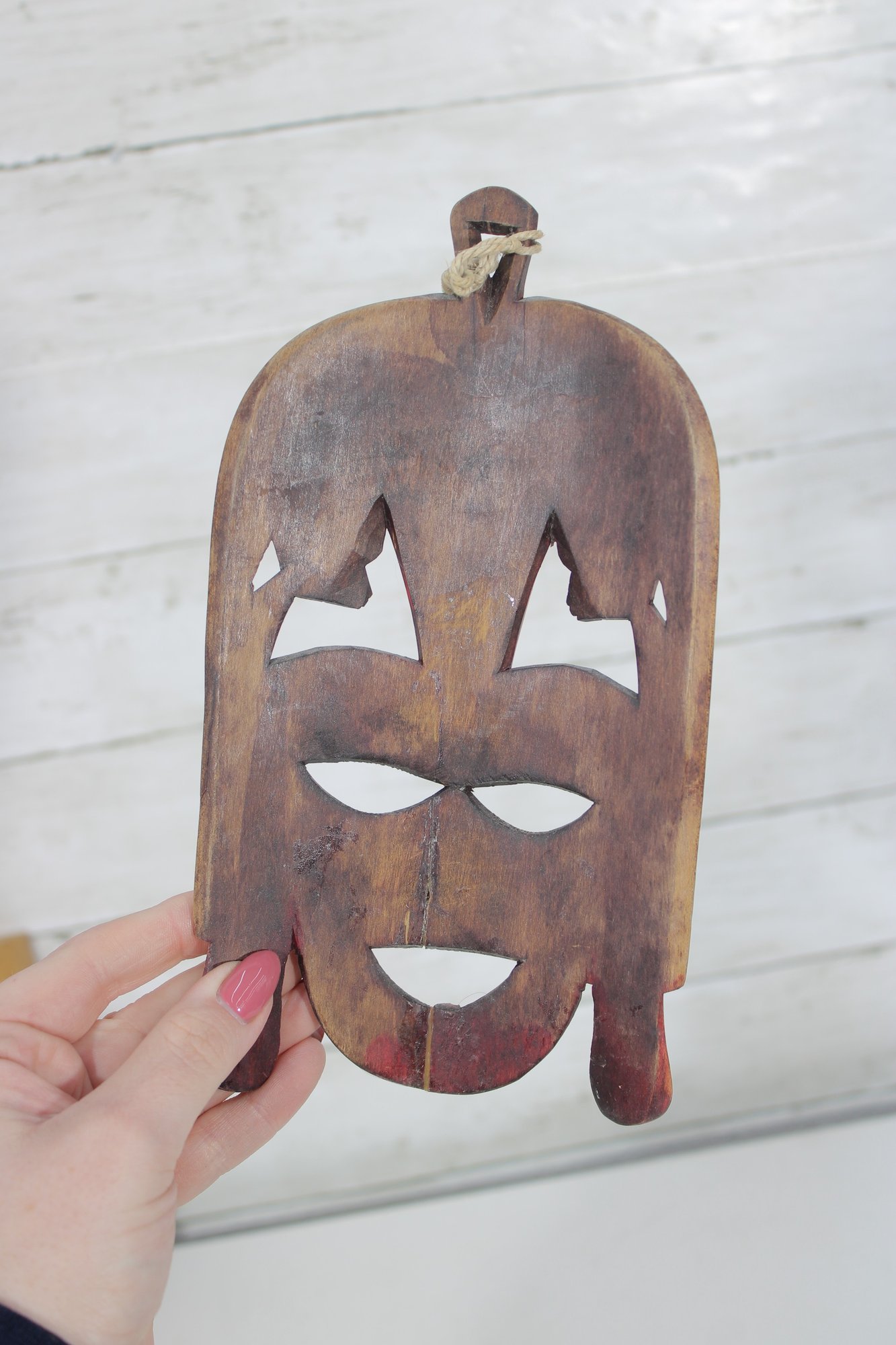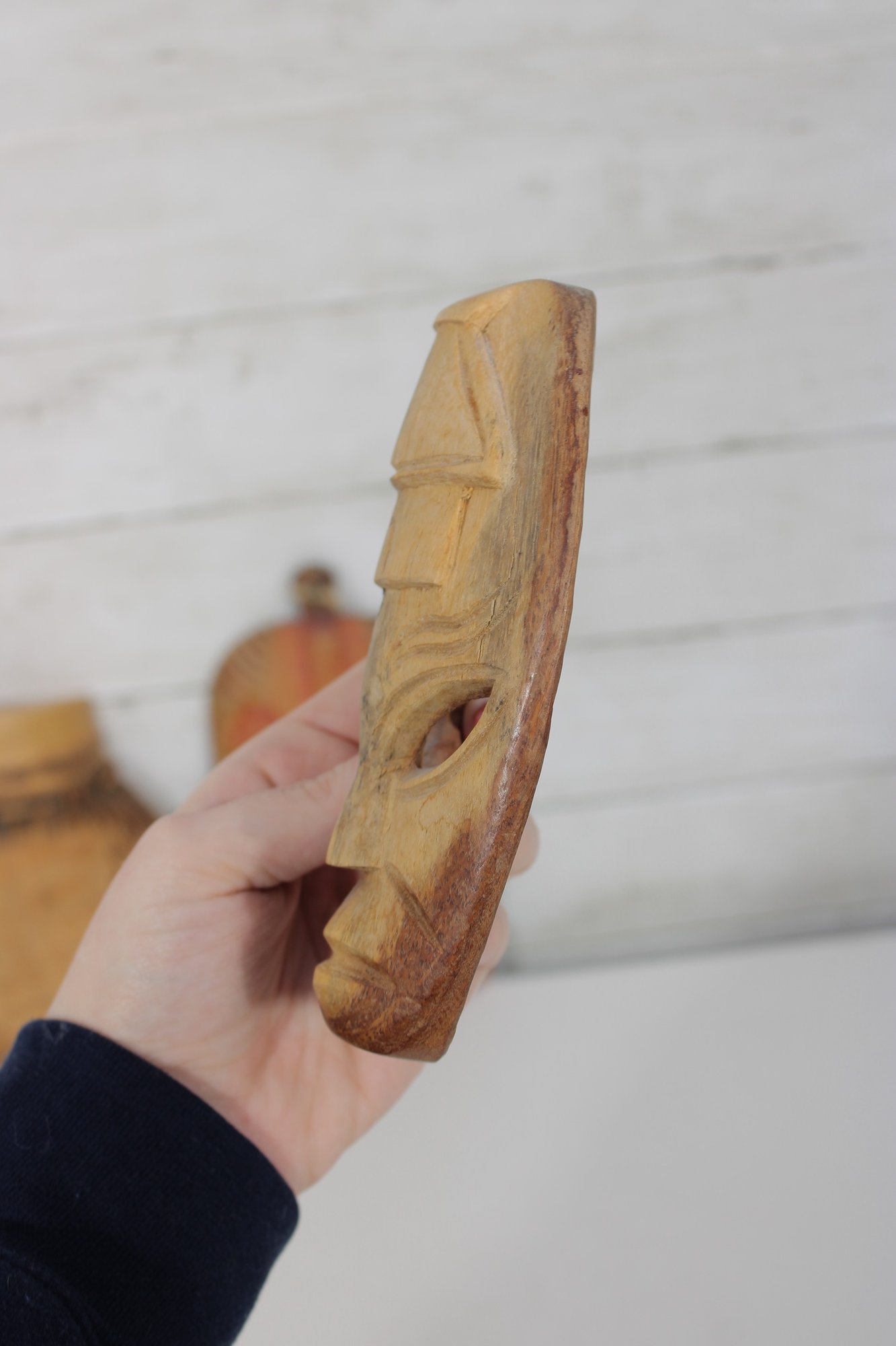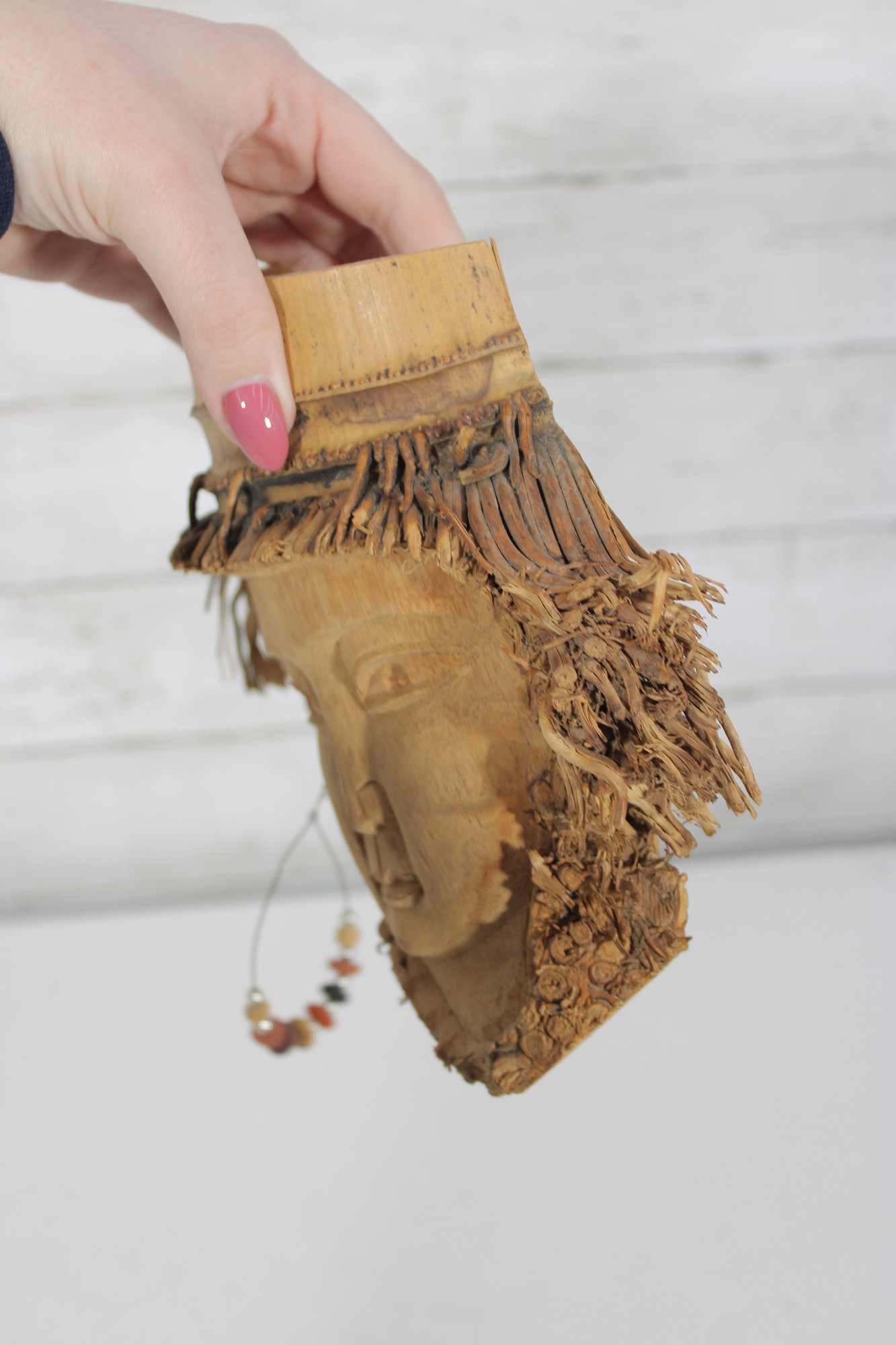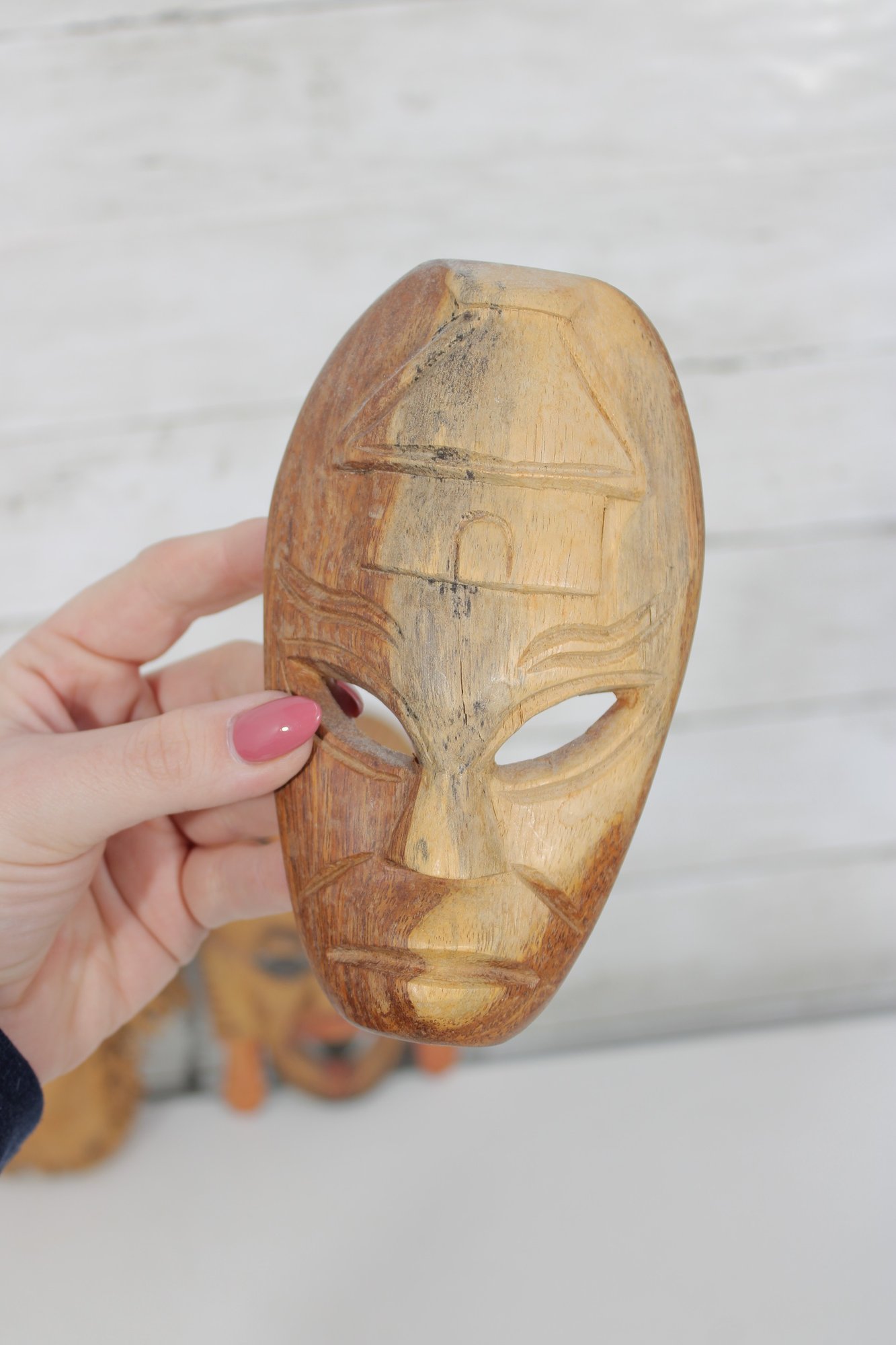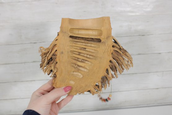 Assorted group lot of hand-carved decorative wall pieces, including three carved masks and one woven or fiber wall hanging with bead accent. The lot features earthy natural tones, carved facial details, and a folk art or tribal-inspired aesthetic that makes it well suited for eclectic decor, wall display, or collecting.