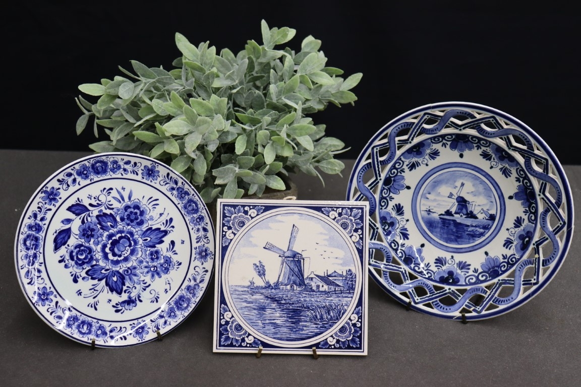 Group Lot Of Hand-Painted Delft Blue: Footed Bowl, Plate, And Square Trivet