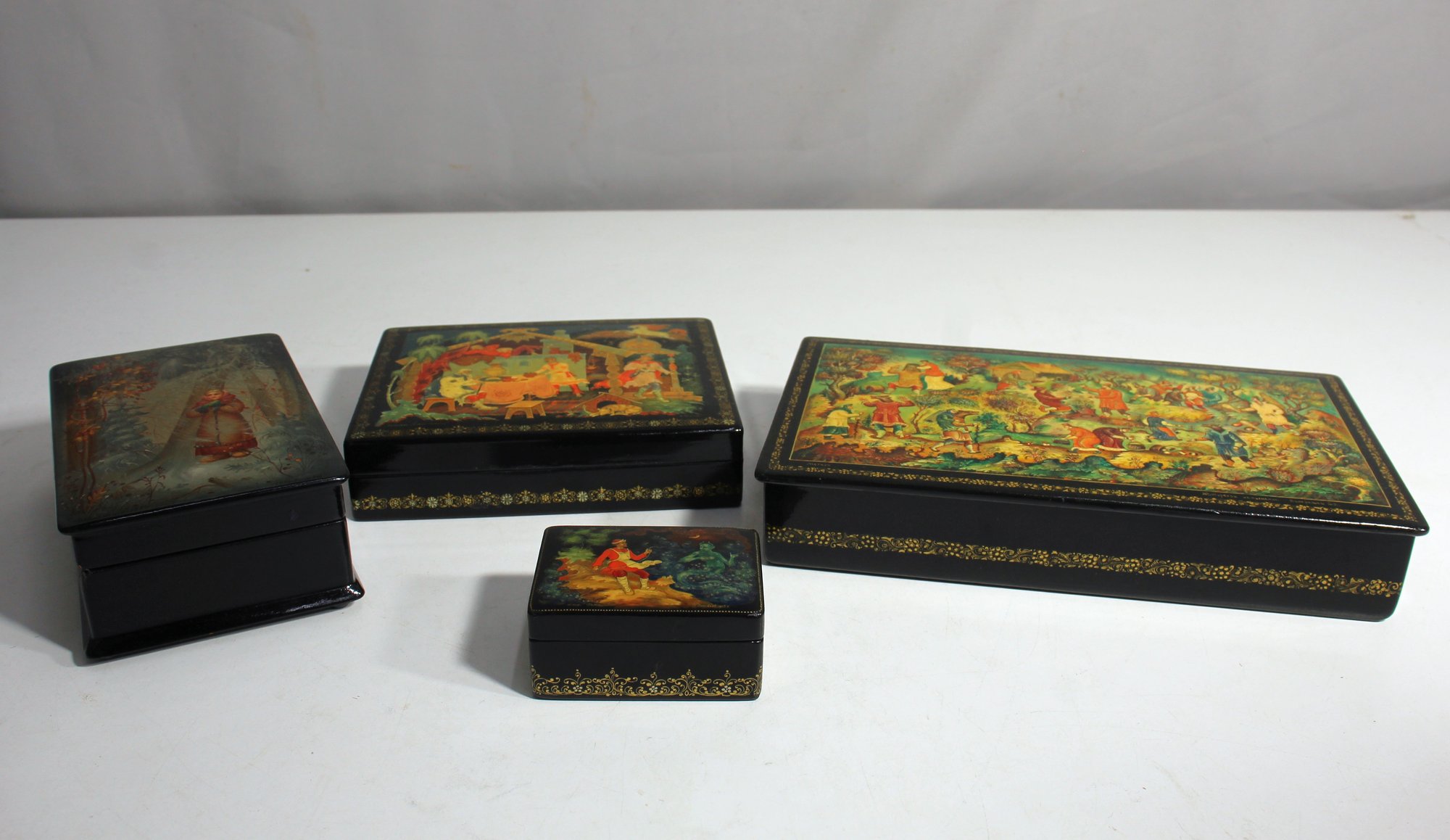 A stunning collection of four Russian lacquer boxes, each intricately hand-painted with vibrant scenes from folklore and everyday life. This group lot includes: