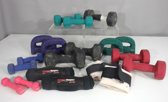 Group Lot Of Mixed Dumbbells & Wrist Weights Various Sizes & Colors