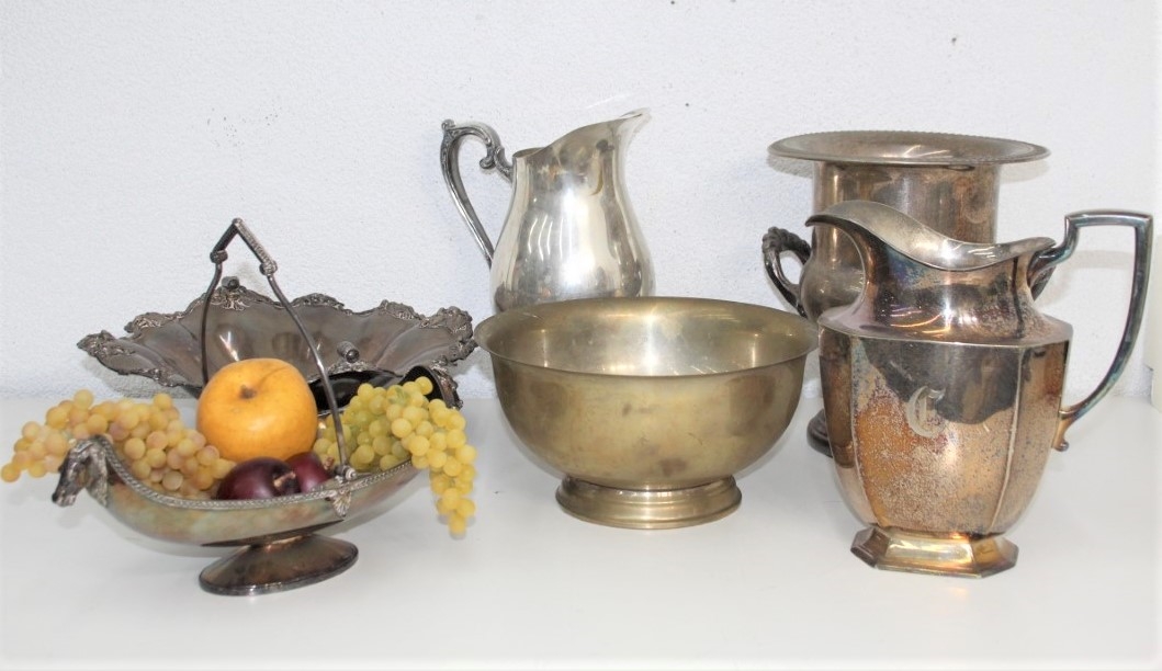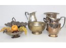 Group Lot Of Mixed Metalware And Silverplate Pitchers, Bowls, Champagne Urn Bucket