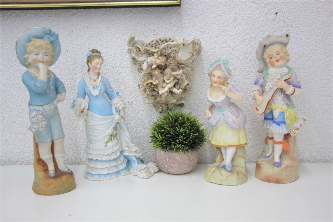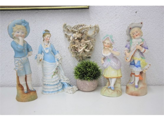 Group Lot Of Painted Porcelain Figurines And A Wall Sconce Cherub Vase (multiple Breaks/chips - See Photos)